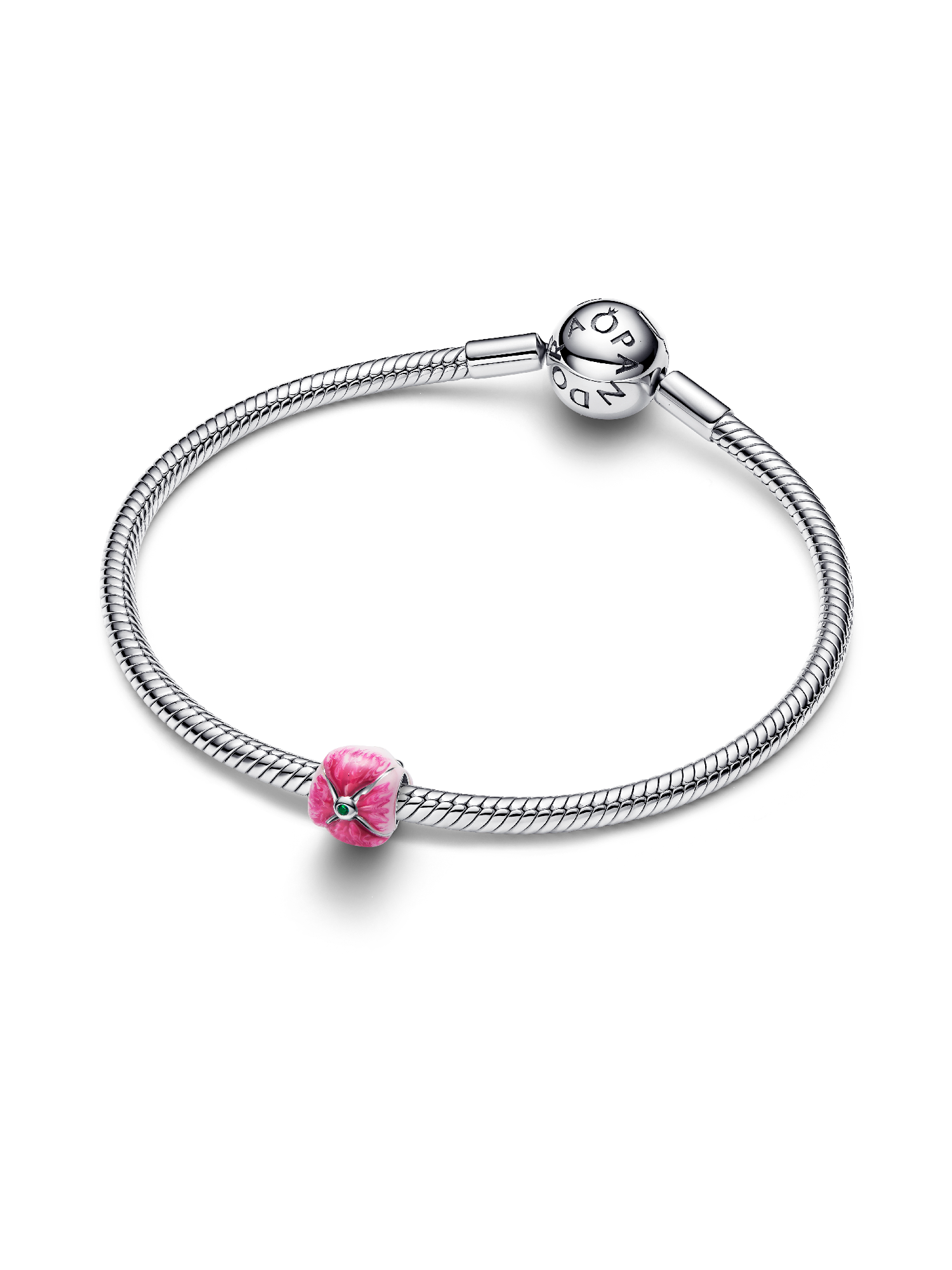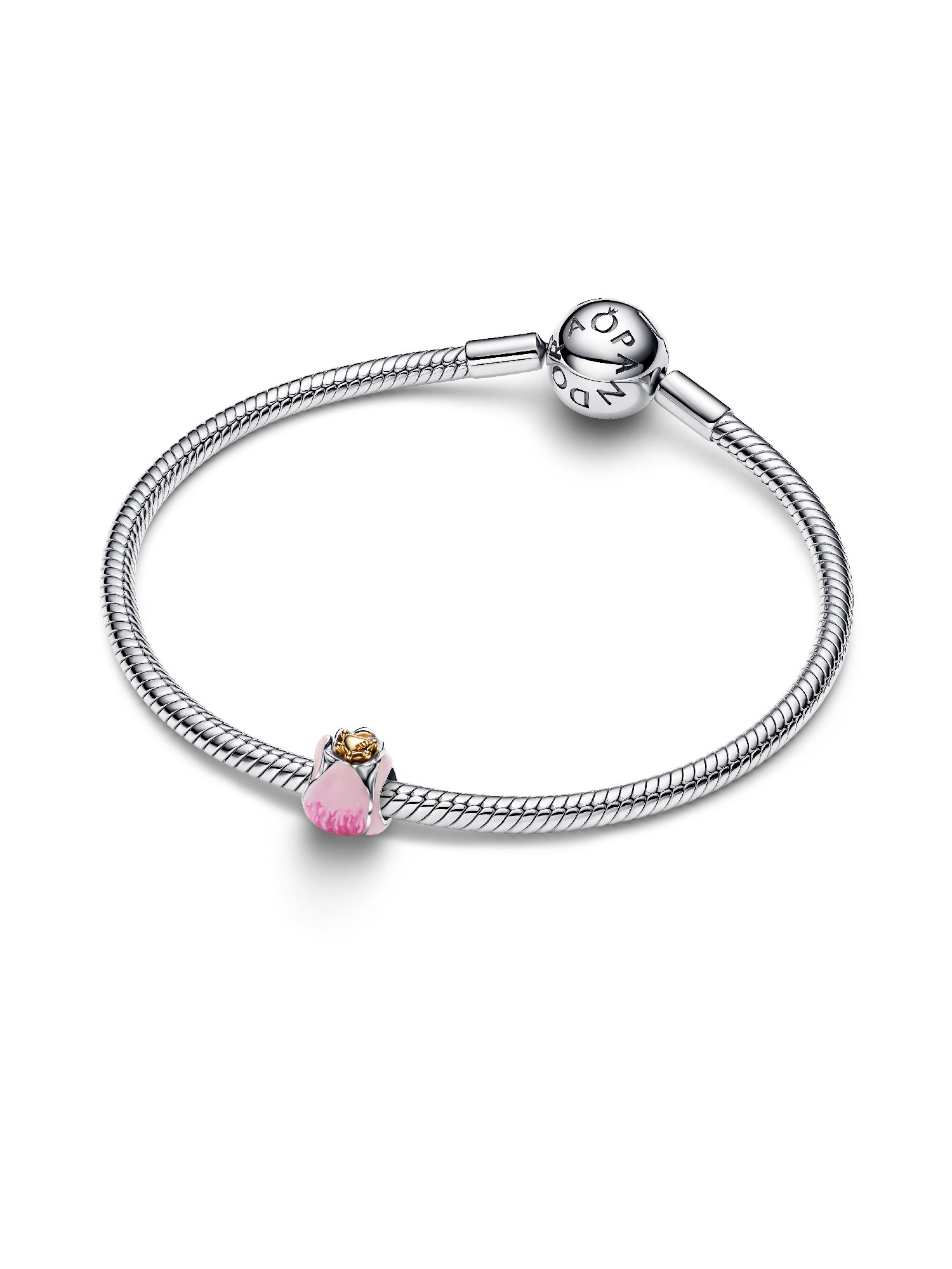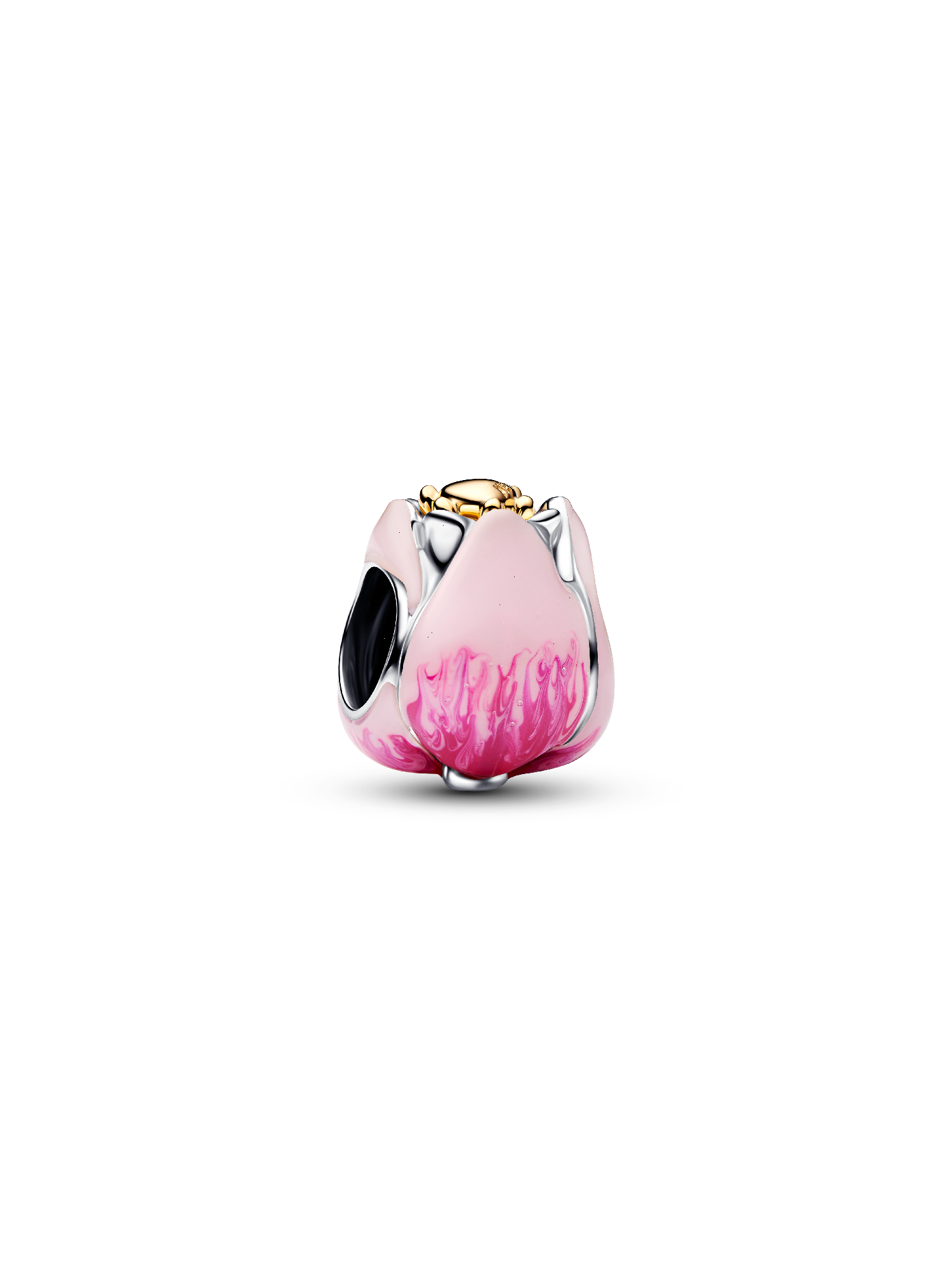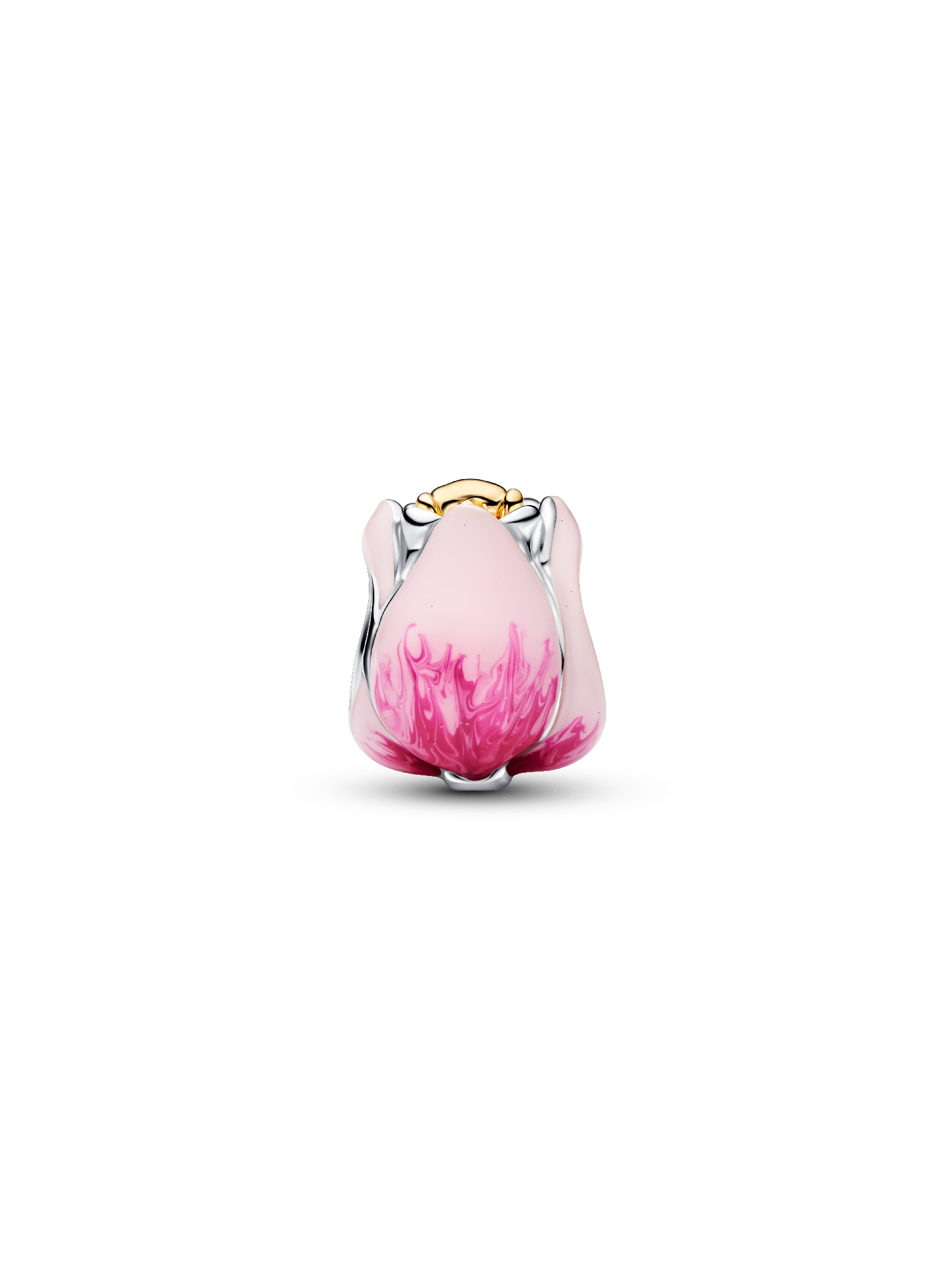 Celebrate spring’s bloom. This tulip charm in sterling silver and 14k gold-plating features layered pink enamel petals, a radiant green crystal, and a heart detail symbolizing renewal and beauty.