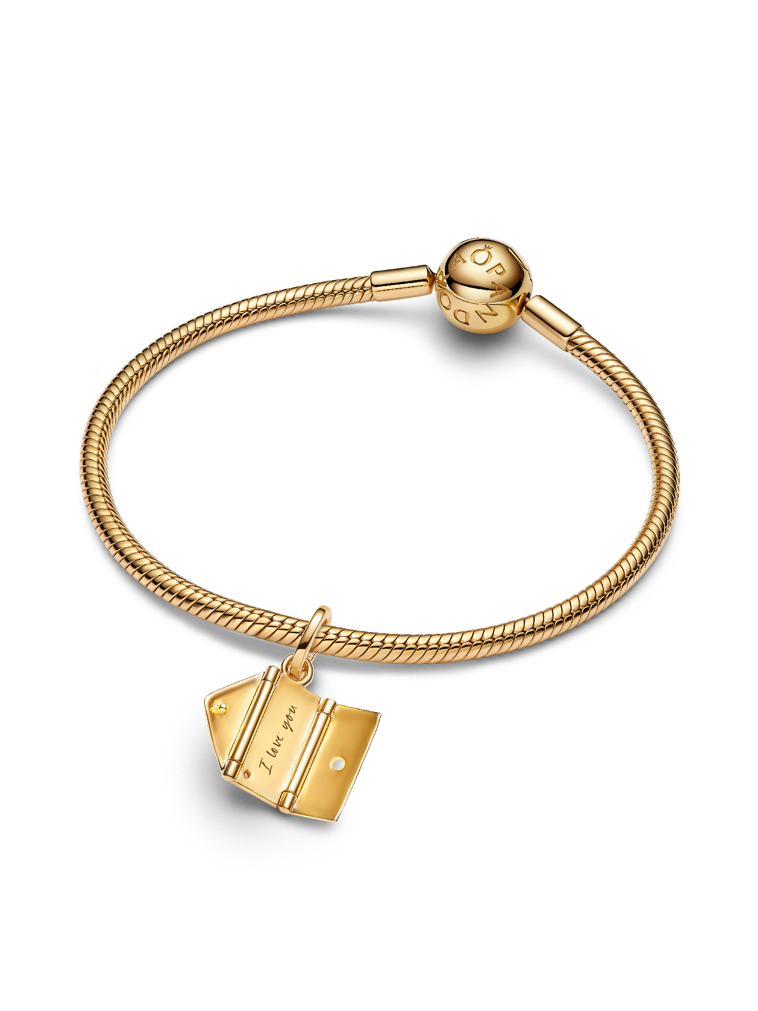 Send a little love. This 14k gold-plated openable envelope dangle sparkles with clear cubic zirconia and offers engravable space inside and on the front – perfect for heartfelt messages.