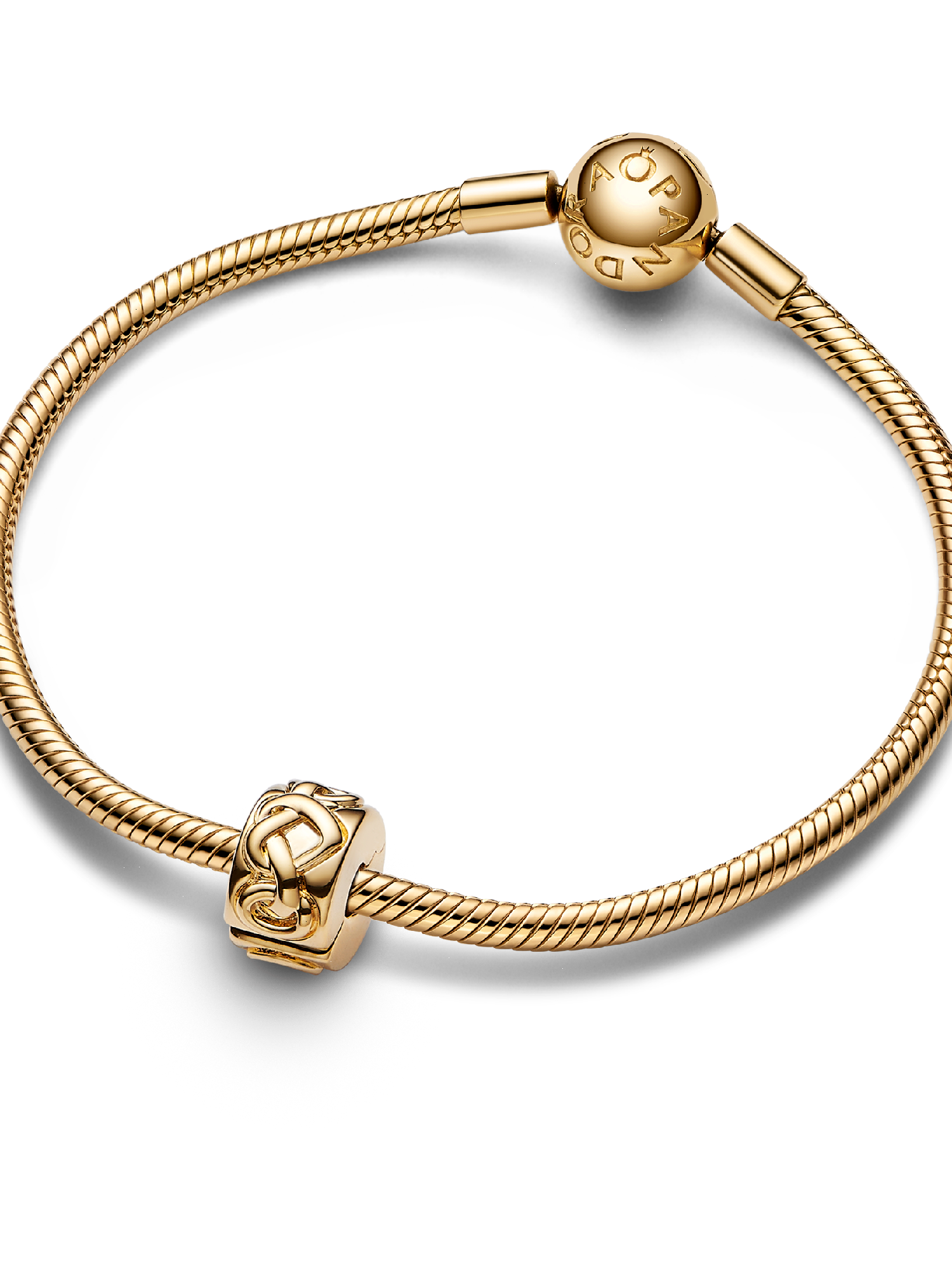 Our simple yet striking Pandora Moments clip charm is decorated with a row of knotted hearts. The design features a combination of the iconic heart and the classic love knot, which gives the piece extra emotional appeal. The 14k gold-plated charm is perfect for adding a heartfelt touch to your bracelet collection and helps to evenly space out your stack. This clip charm features no silicone grip, so it will slide if not styled onto threads (two raised charm dividers).