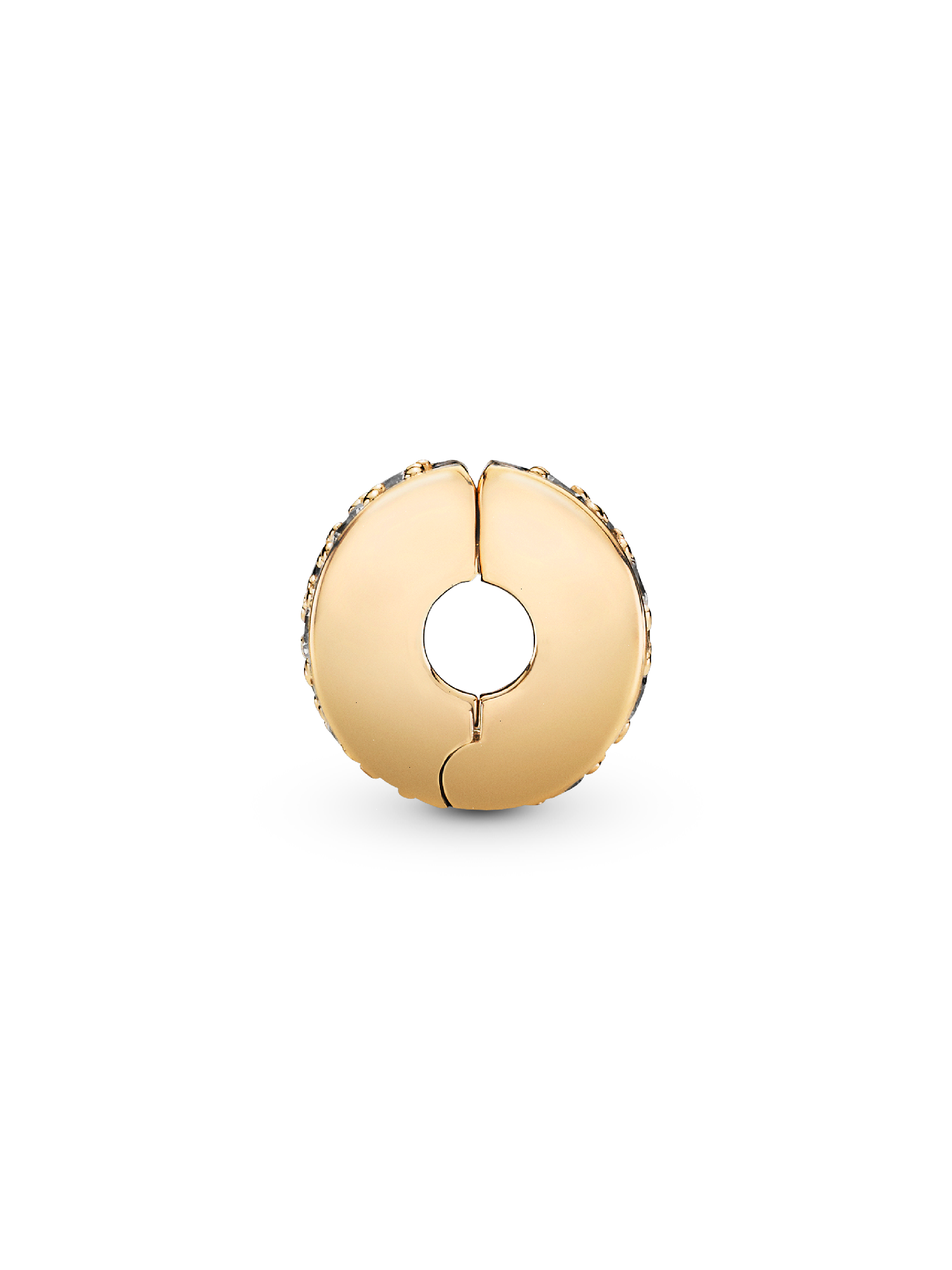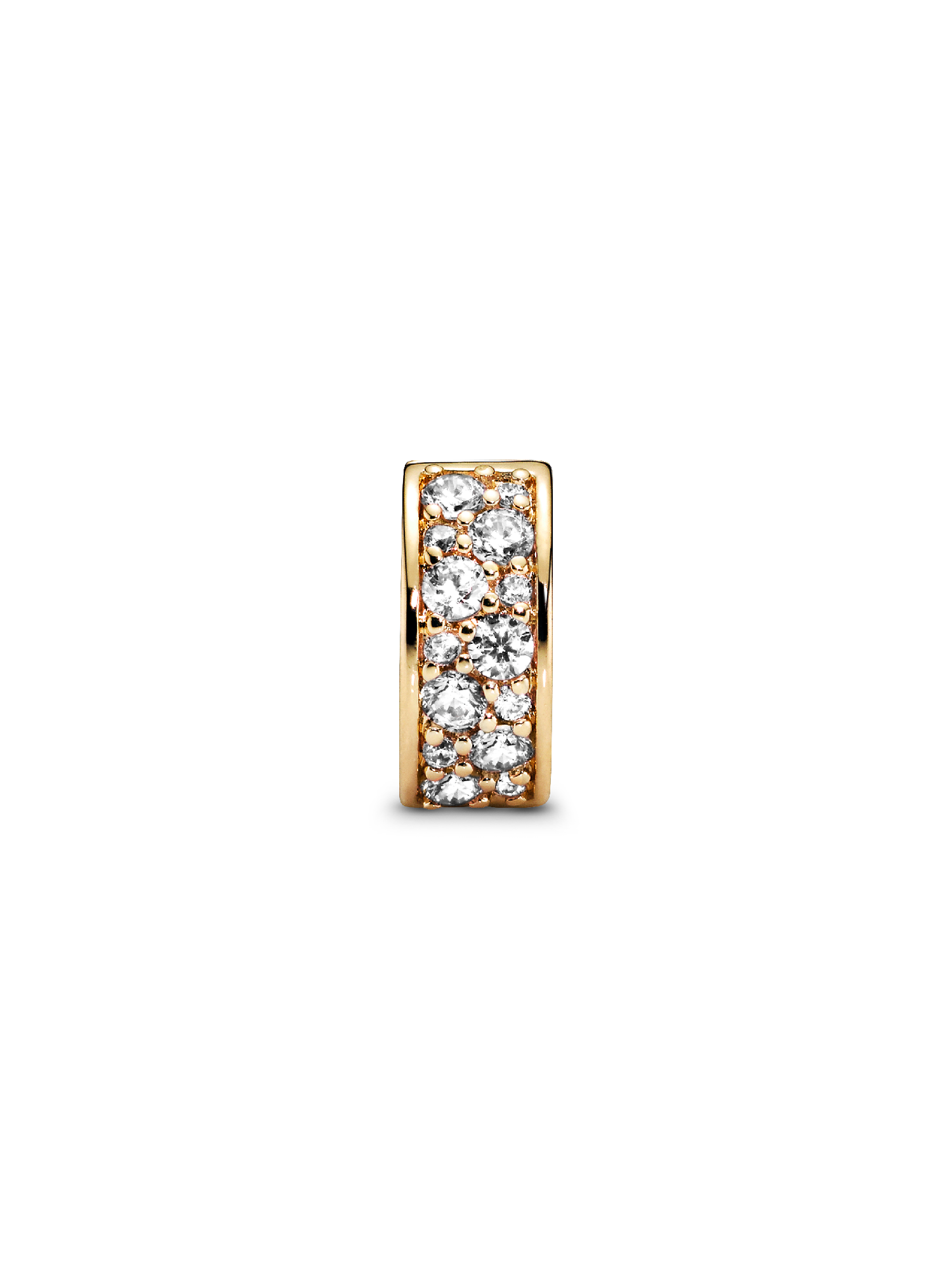 Sparkling clear stones create a striking contrast and an inner silicone grip ensures this Clear Pavé Clip Charm stays exactly where you want it. Wear this 14k gold-plated piece with contrasting metals for a modern look. This clip charm features a silicone grip and does not fit onto threads (two raised charm dividers). This charm can be styled anywhere else on the bracelet.