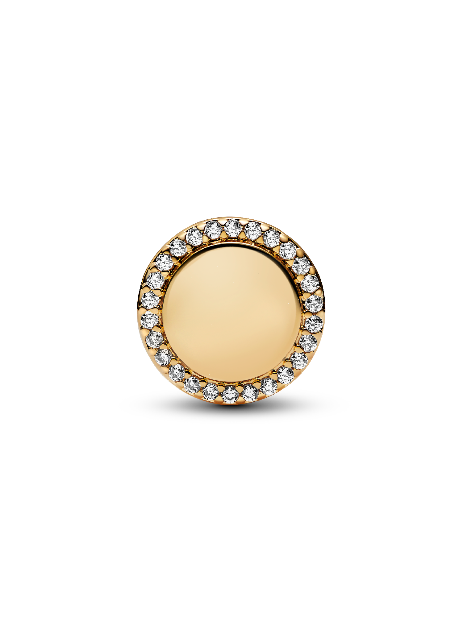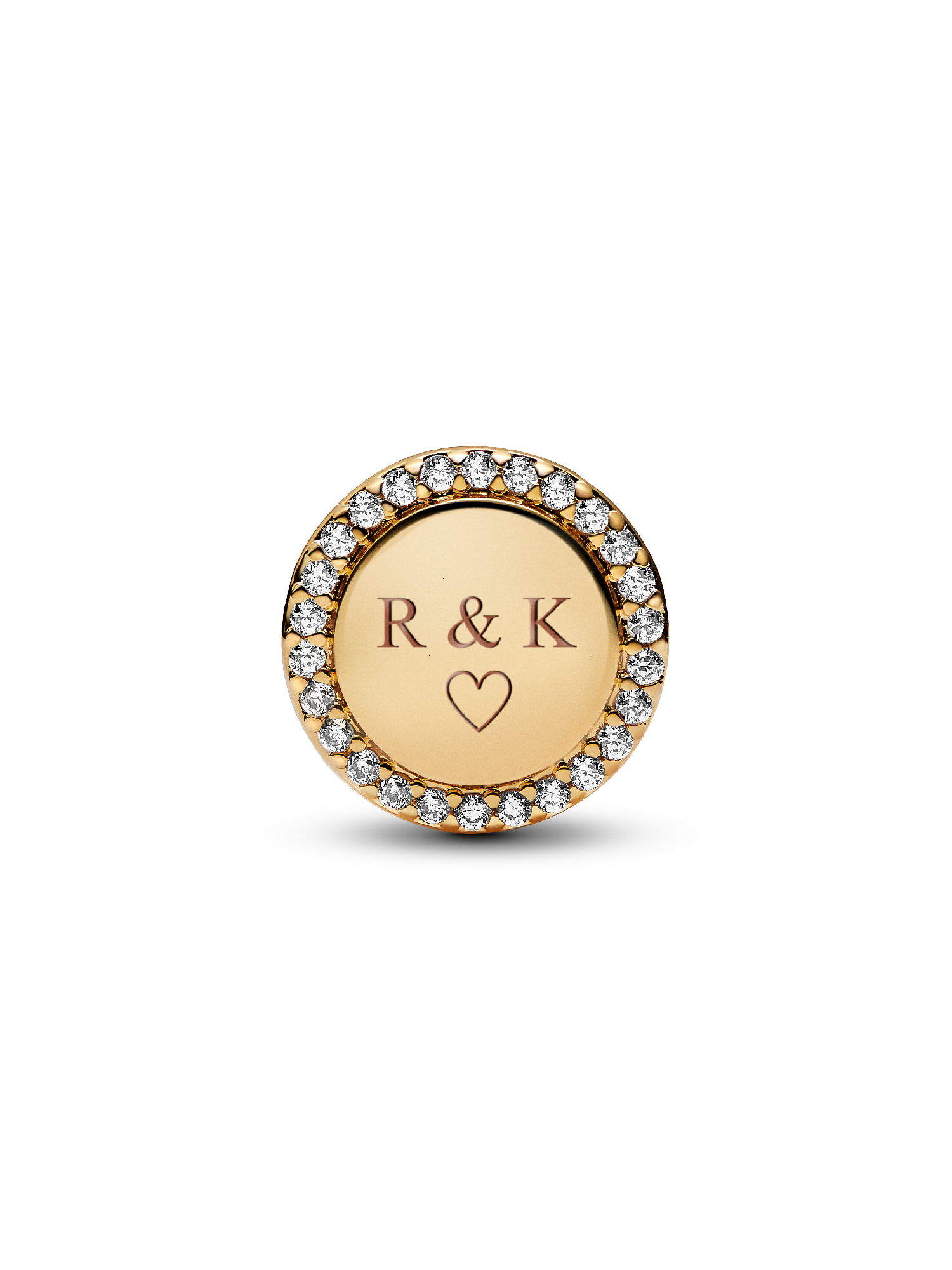 Make your mark with our engravable 14k gold-plated button charm. Surrounded by sparkling pavé and outlined with cut-out hearts, this circular charm can be personalized with an engraving on both sides. It's the perfect meaningful gift for everyone on your list - including yourself.