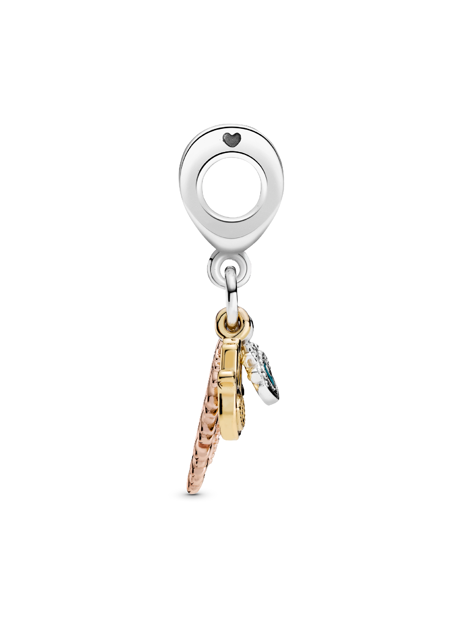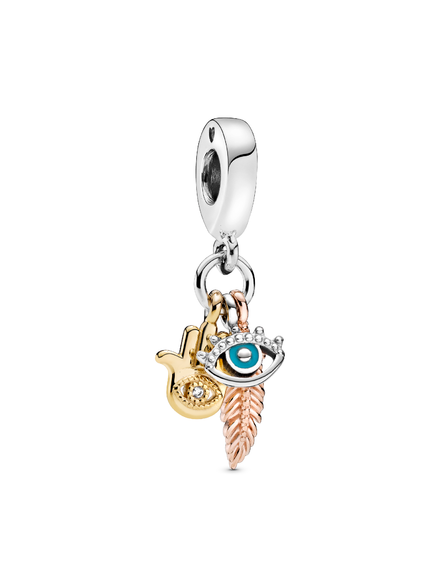 Show you’re a true citizen of the world with the Spirituality Dangle Charm, featuring a hamsa hand, all-seeing eye and feather. Feel the powerful symbols protecting you at every step when you wear this tri-coloured charm in 14k gold plating, 14k rose gold plating and sterling silver. Featuring clear cubic zirconia for extra sparkle and blue enamel details on the all-seeing eye, this charm is inspired by inclusive spirituality and embracing different faiths.