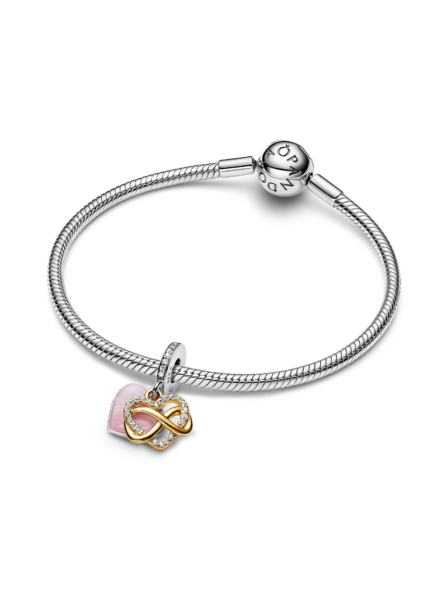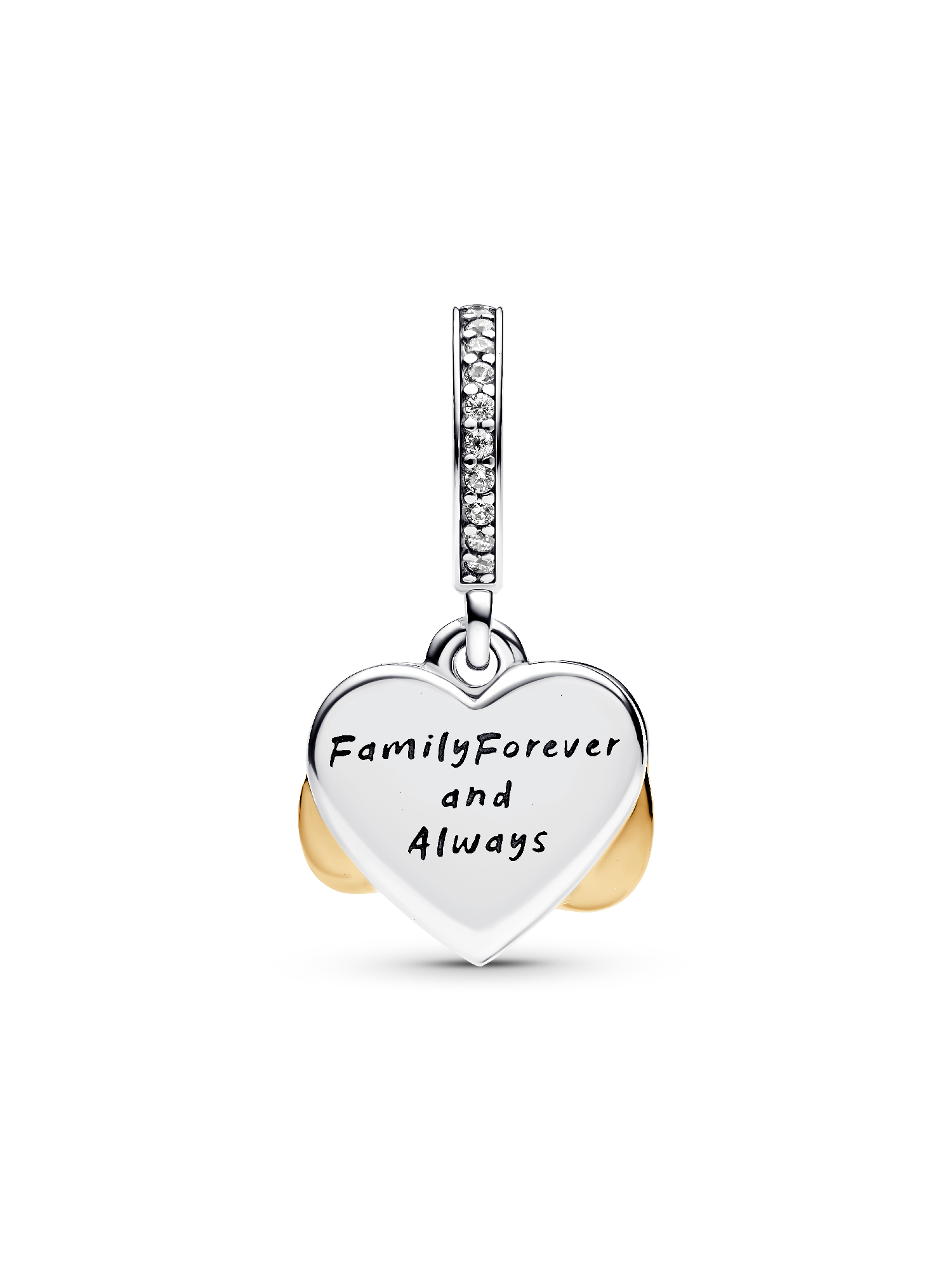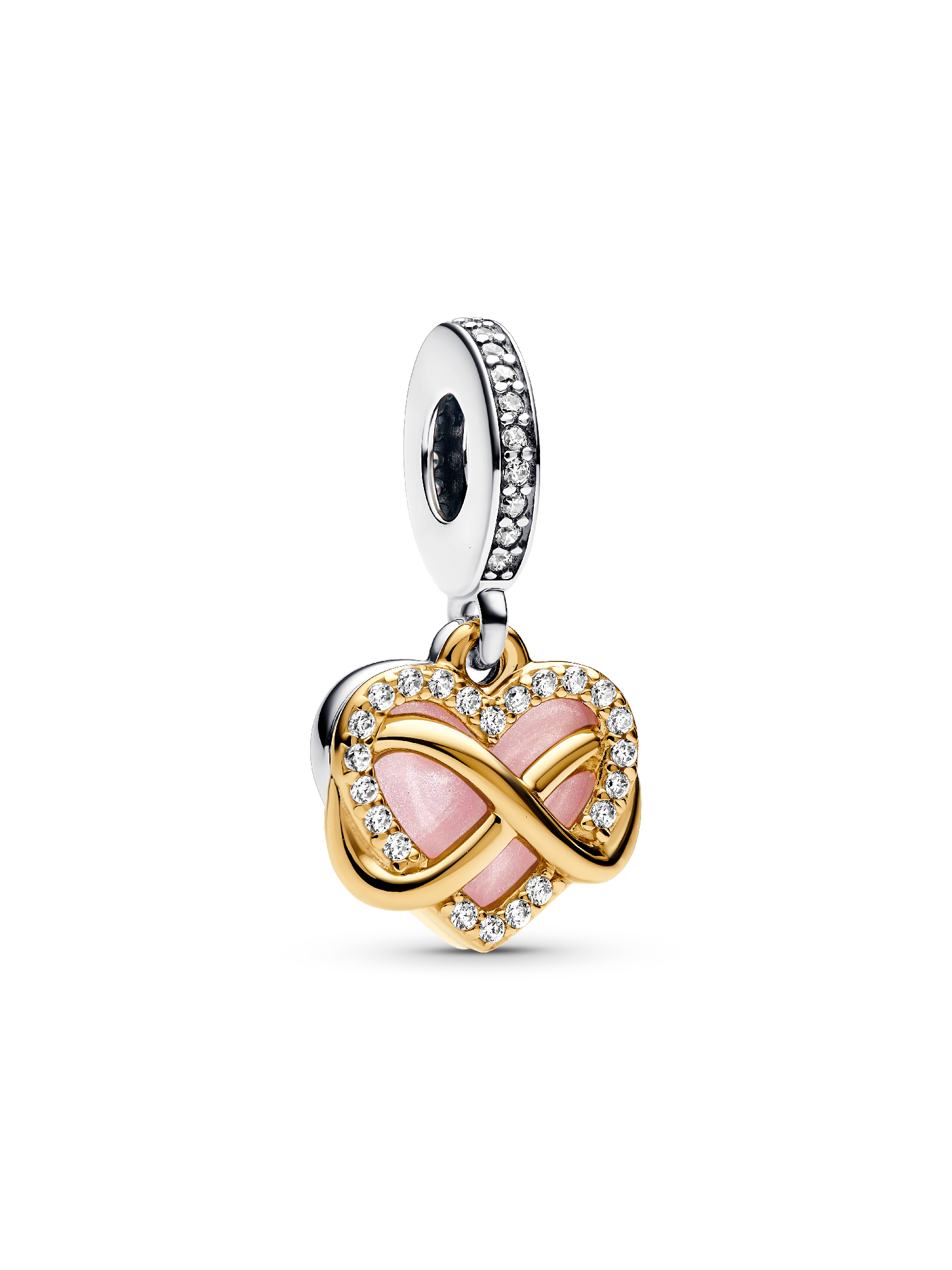Take your love to infinity and beyond with this Sparkling Infinity Heart Dangle Charm. The front dangle is hand-finished in 14k gold plating, and features an infinity sign wrapped around a sparkling heart set with clear cubic zirconia. The back dangle’s pink hand-applied enamel provides a sweet backdrop to the love-filled message of the dangle charm with the engraving “Family forever and always”.