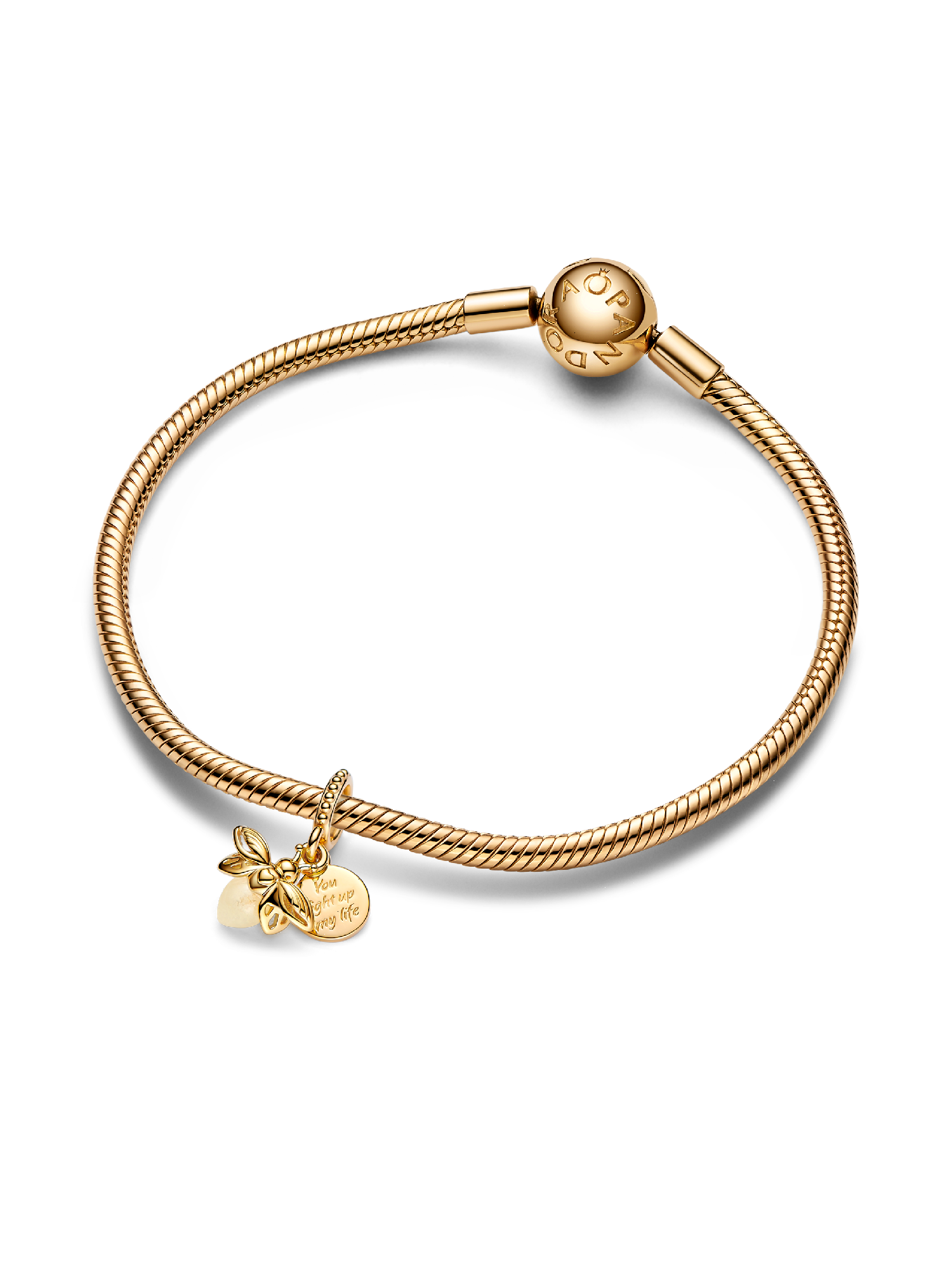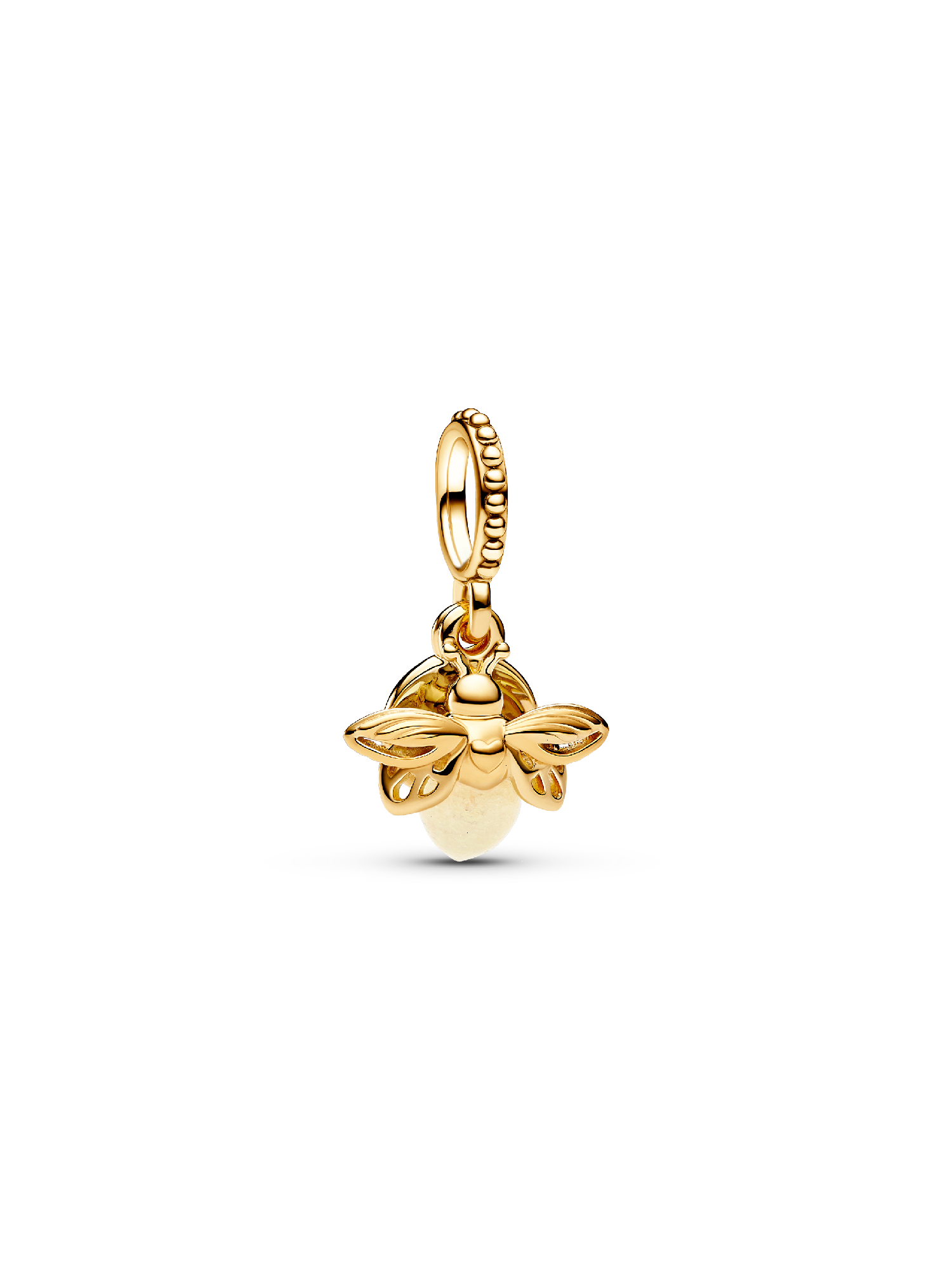 Light up your look with the Glow-in-the-dark Firefly Dangle Charm. This 14k gold-plated firefly charm features rounded glow-in-the-dark glass – white in the daylight and milky green at night – which recharges when exposed to sunlight or UV light. A second 14k gold-plated disc reads 'You light up my life.' This engraved charm makes the perfect gift for the one you love, or a stylish statement of self-love to remind you of the light you carry within.