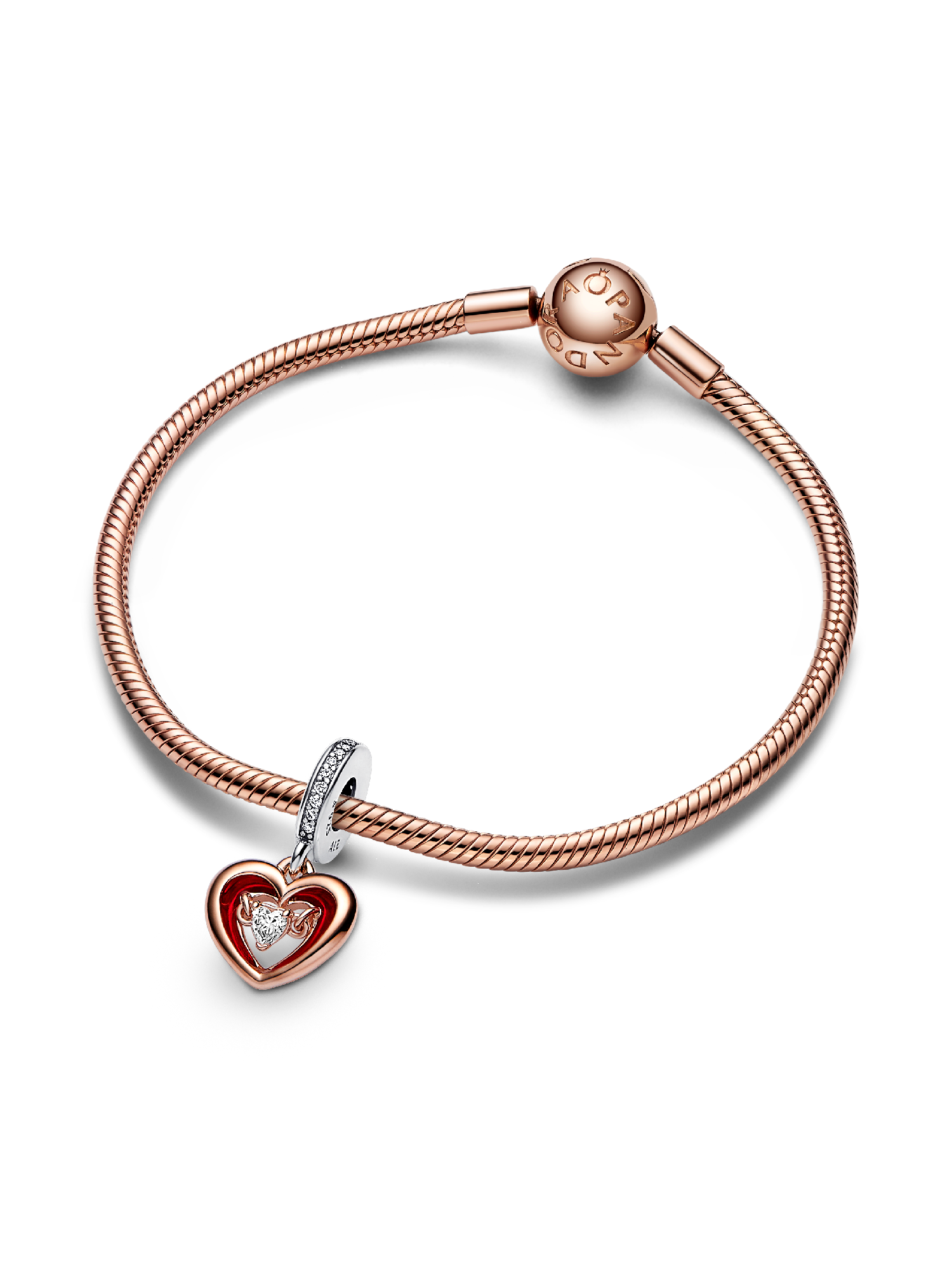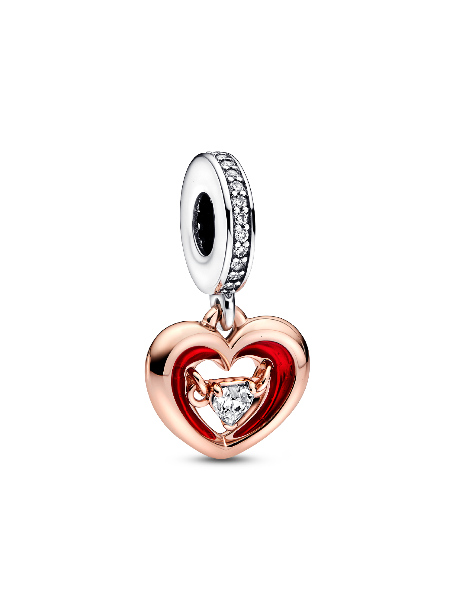 Wear your heart on your sleeve with our Two-tone Radiant Heart Dangle Charm. This 14k rose gold-plated open heart charm is detailed with hand-applied red enamel and a floating cubic zirconia heart within, symbolising the radiating energy of love. A sterling silver pavé bail and "All for love" engraving add an extra sparkle of romance. Style yours on your favourite Pandora Moments bracelet to tell your love story.