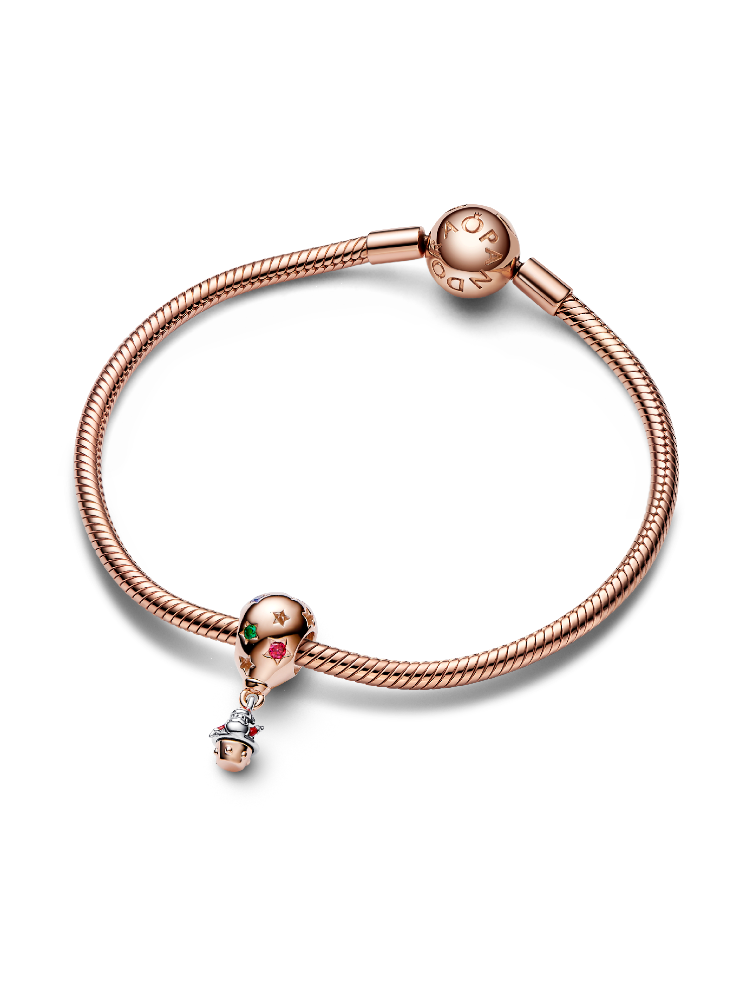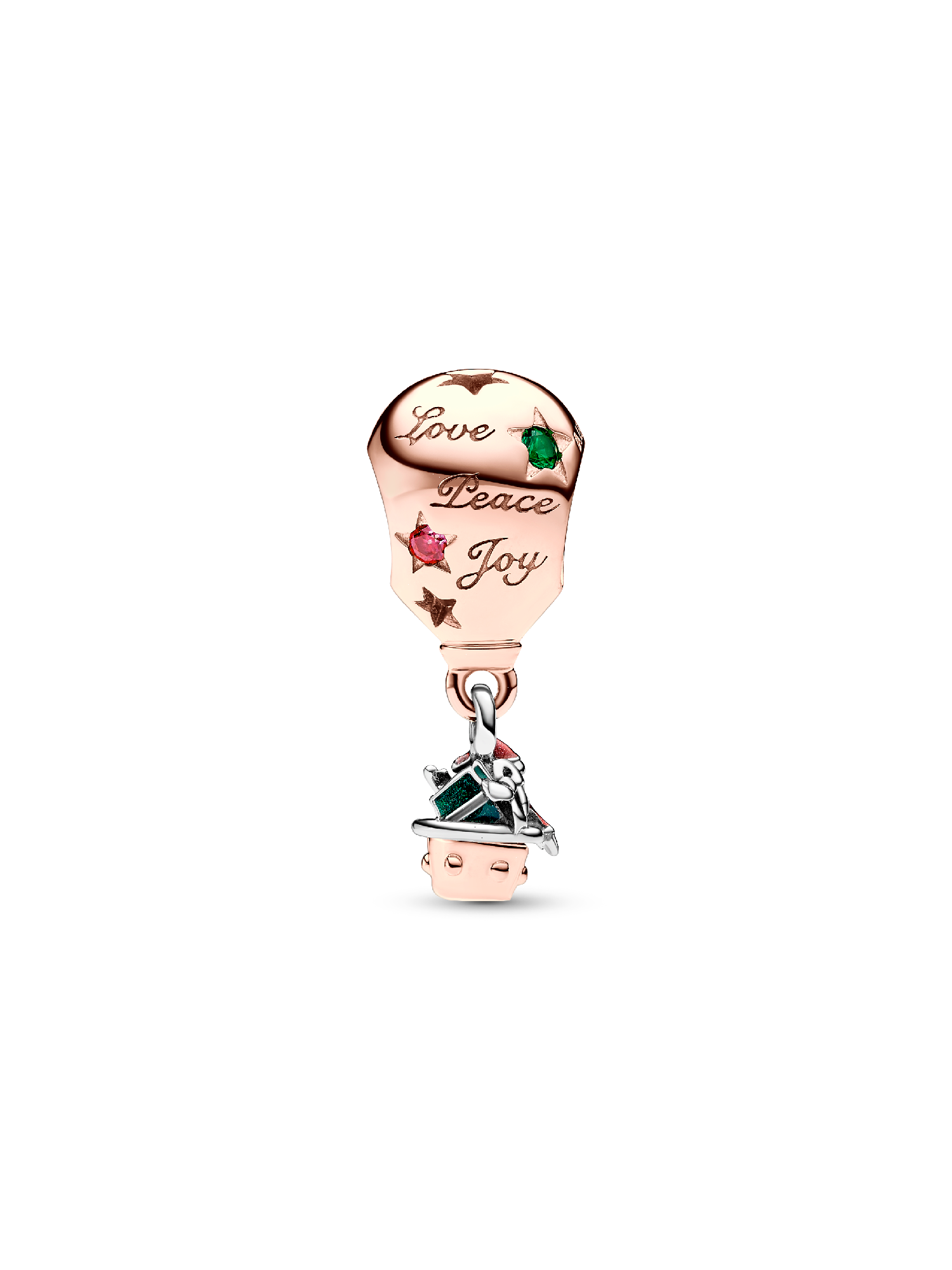 Tis the season for the Two-tone Santa Claus in Hot Air Balloon Charm. Crafted from sterling silver and 14k rose gold plating, one of this year's most playful holiday charms features enamel detailing and festive-colored stones in star-shaped settings. The main character of Christmas gets a fun new mode of transport, hitching a ride in a hot air balloon that also features the message "Love peace and joy" – to remind us all what this season is truly about. Wear this cheerful Christmas charm to all your holiday parties!