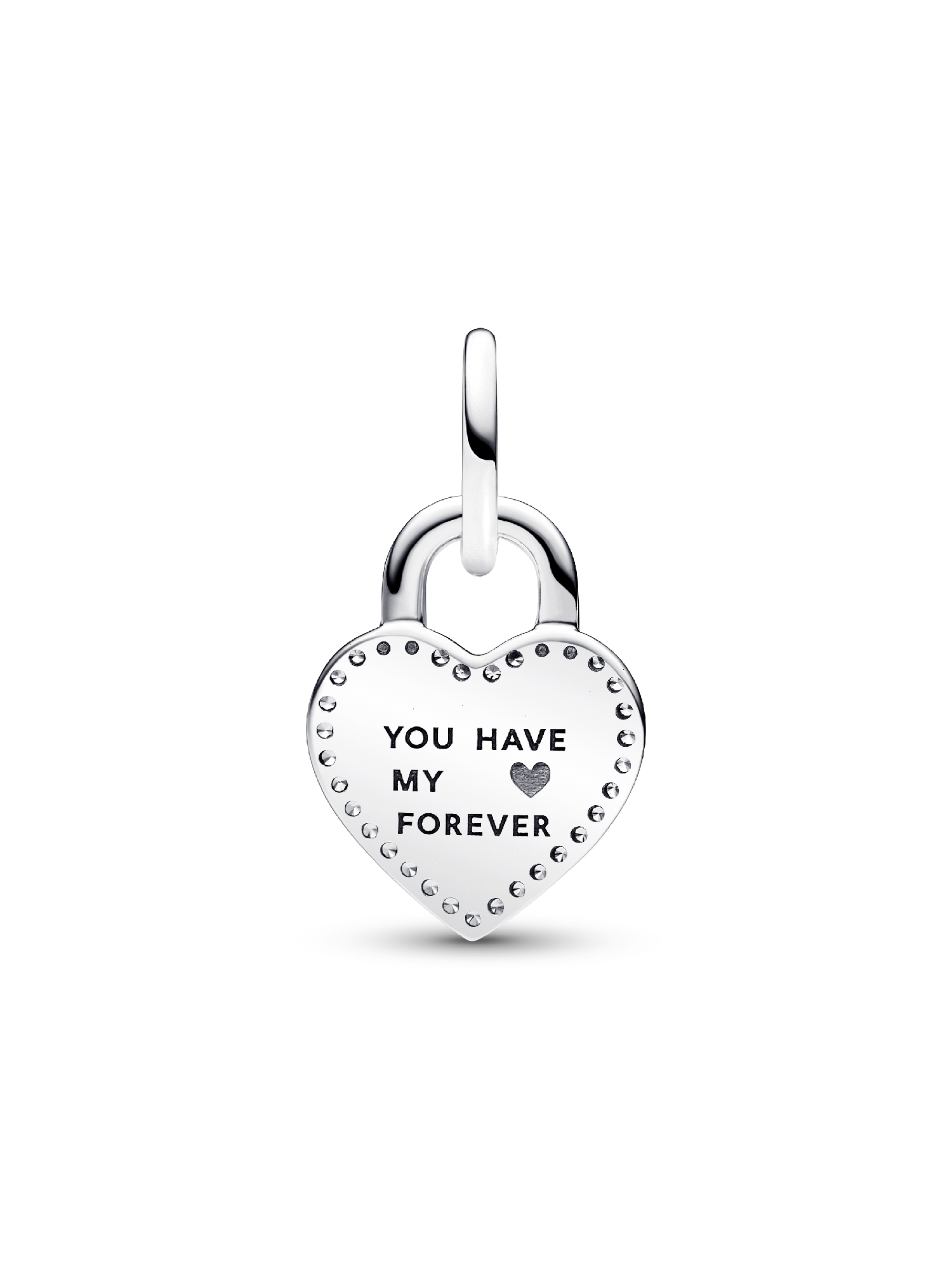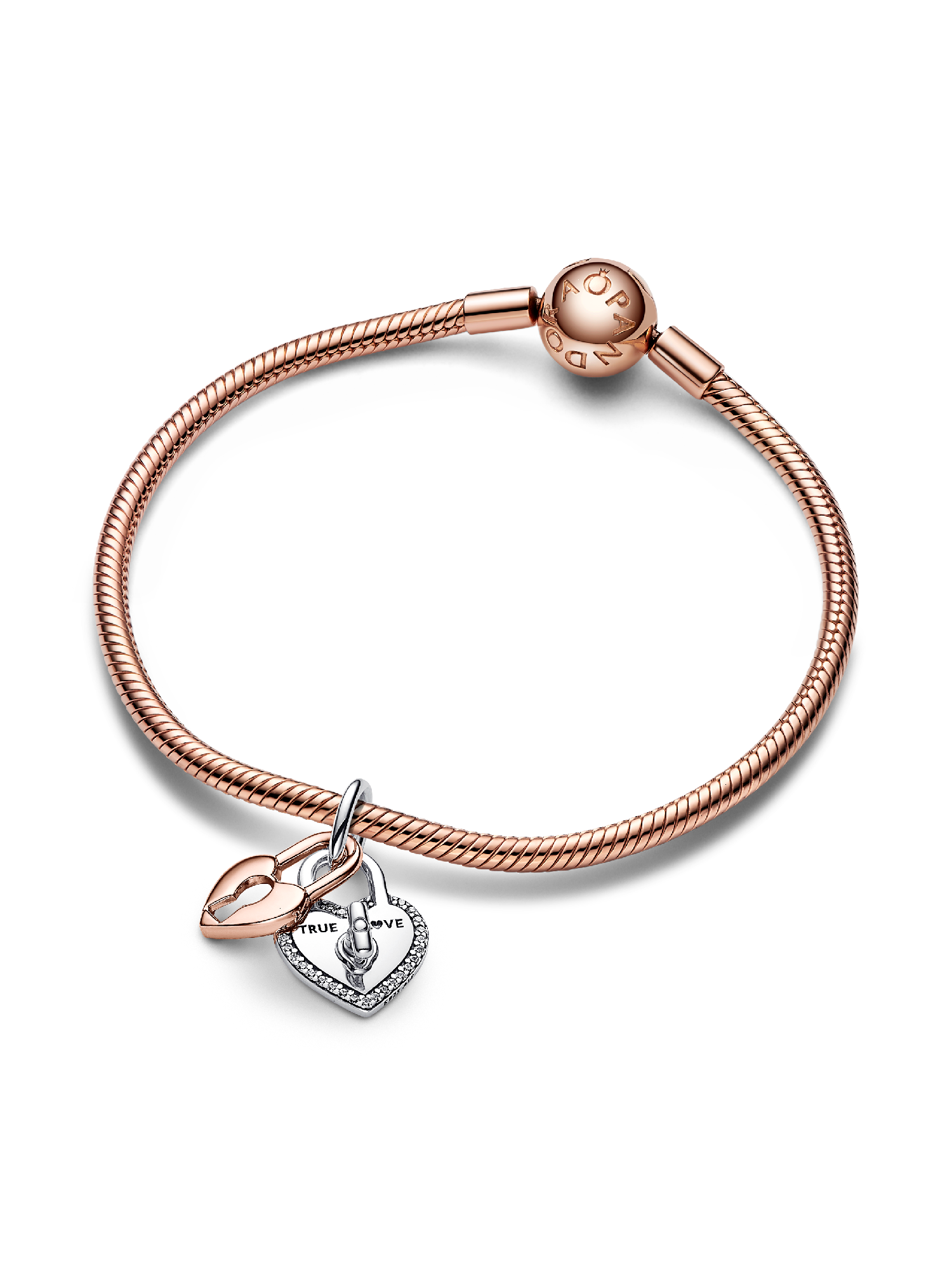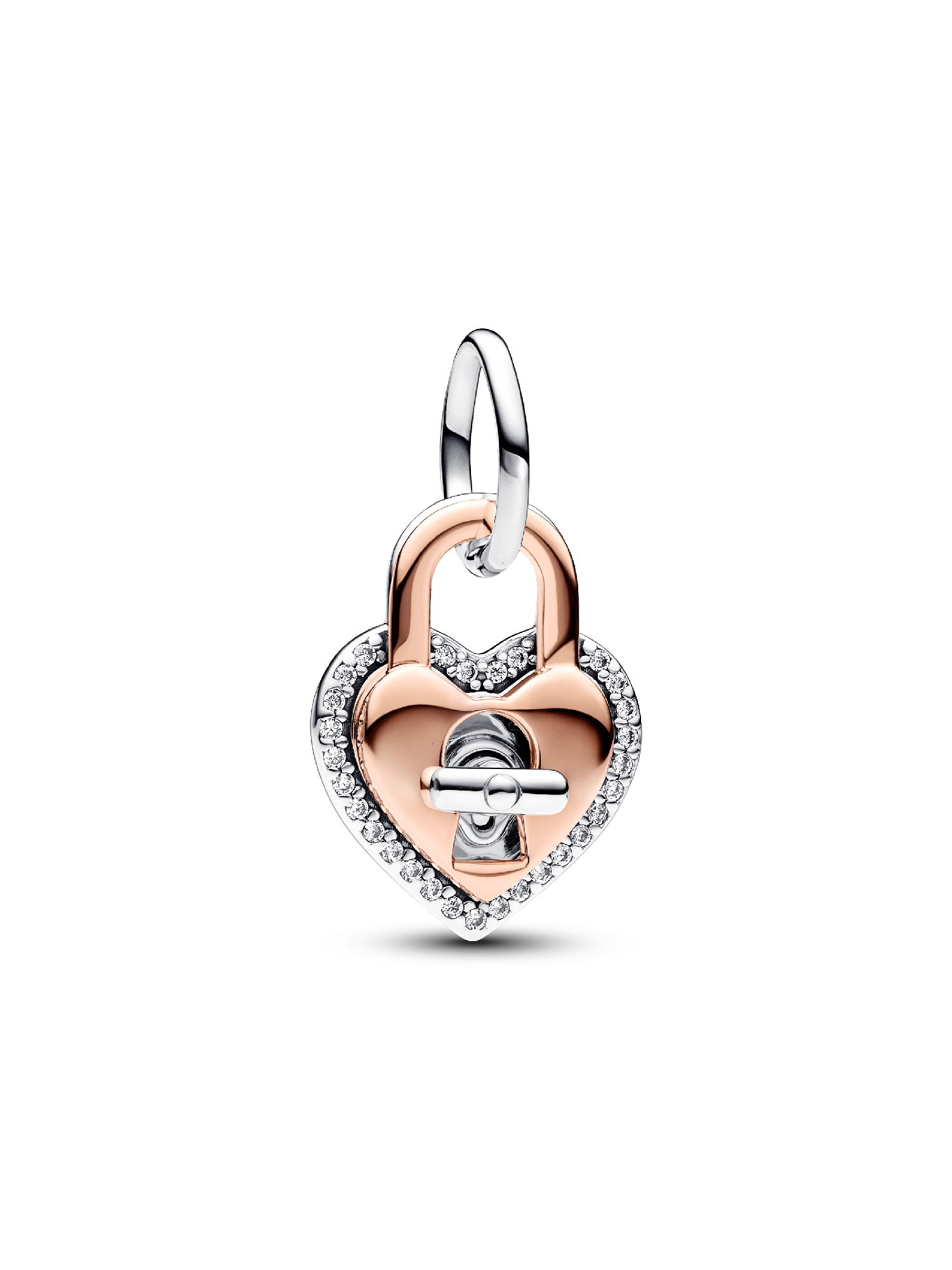 Unlock a secret message of love with the Two-tone Twistable Heart Padlock Double Dangle Charm. This dangle charm features two heart-shaped discs, a 14k rose gold-plated disc with a keyhole cut-out in front of a sterling silver disc with a twistable bar. Turn the bar to "unlock" the two discs and reveal a hidden message on the inside: “TRUE LOVE”. Another engraving on the back of one disc reads: “YOU HAVE MY ♥ FOREVER.” The two heart-shaped discs are connected by a jump ring, so they cannot be separated. A unique and meaningful charm for the one you love.
