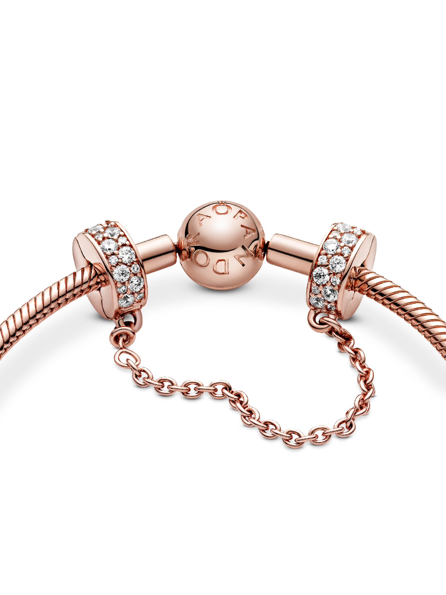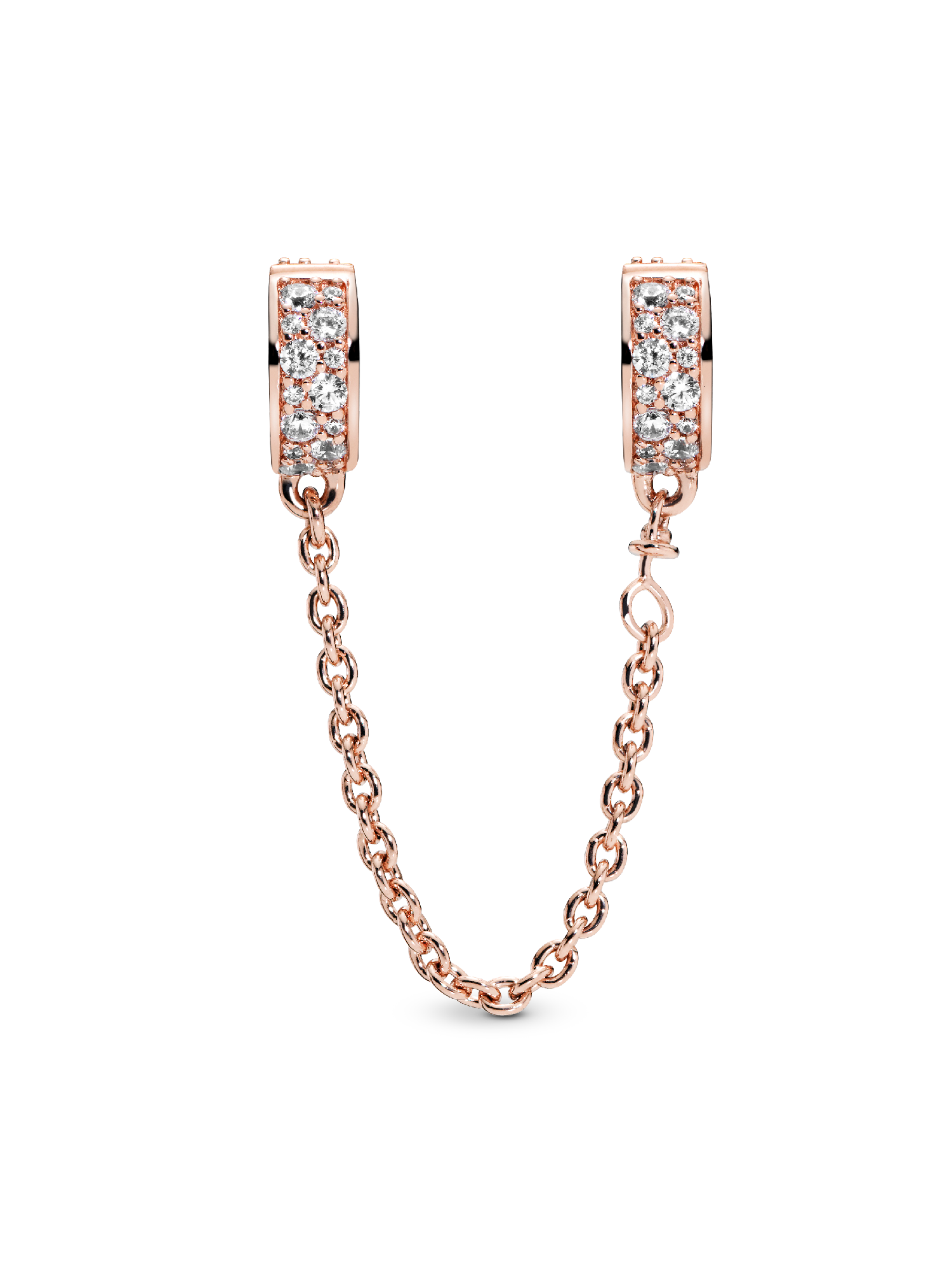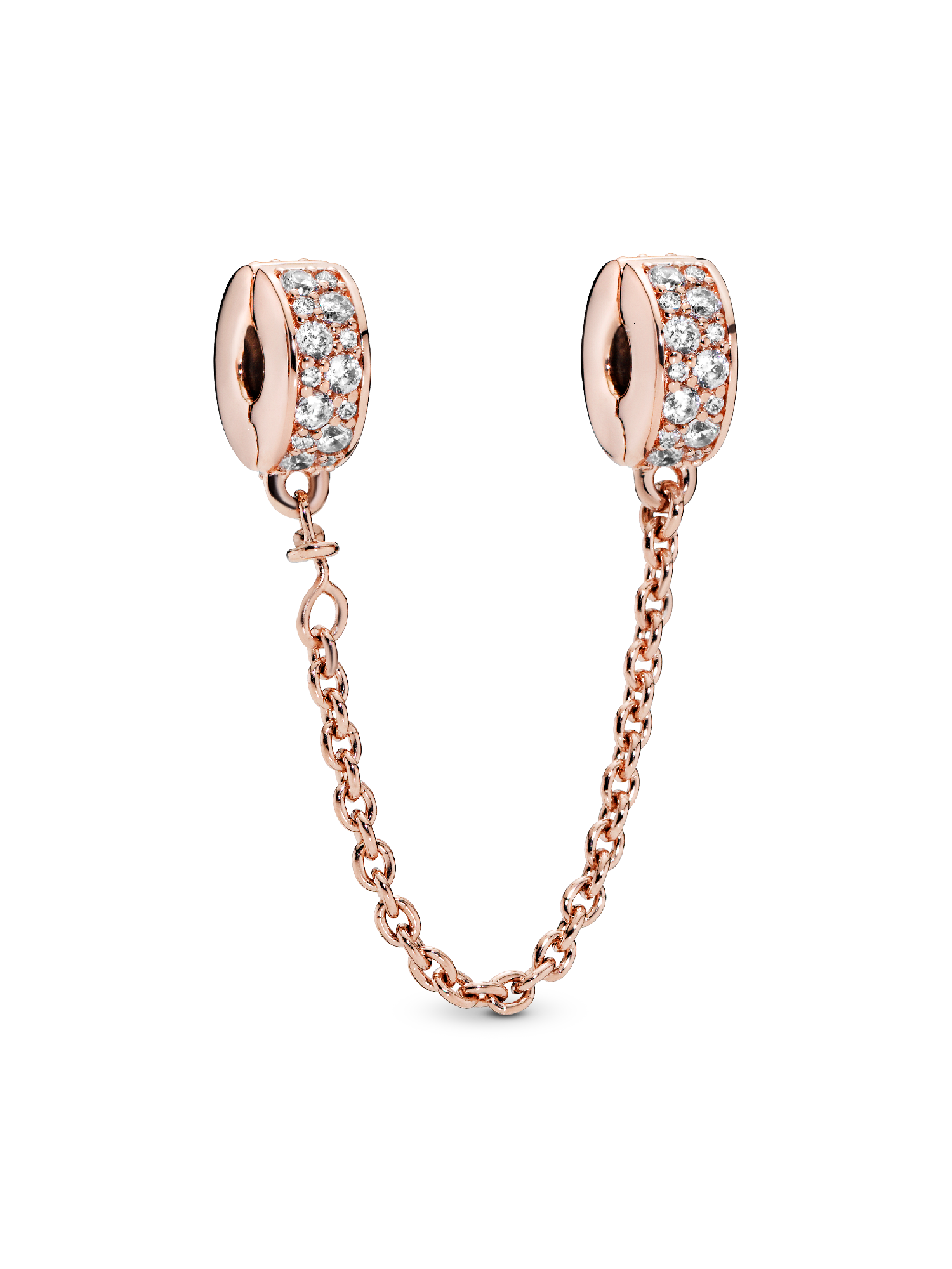 Keep your precious memories stylishly safe on your Pandora Moments bracelet with our Clear Pavé Safety Chain Clip Charm. The finishing touch to a personal styling, the practical yet purposeful 14k rose gold-plated piece is set with cubic zirconia stones for a sparkling finish. Swivel ends on the chain ensure it won't tangle and hidden silicone grips ensure perfect positioning on your chosen carrier.
