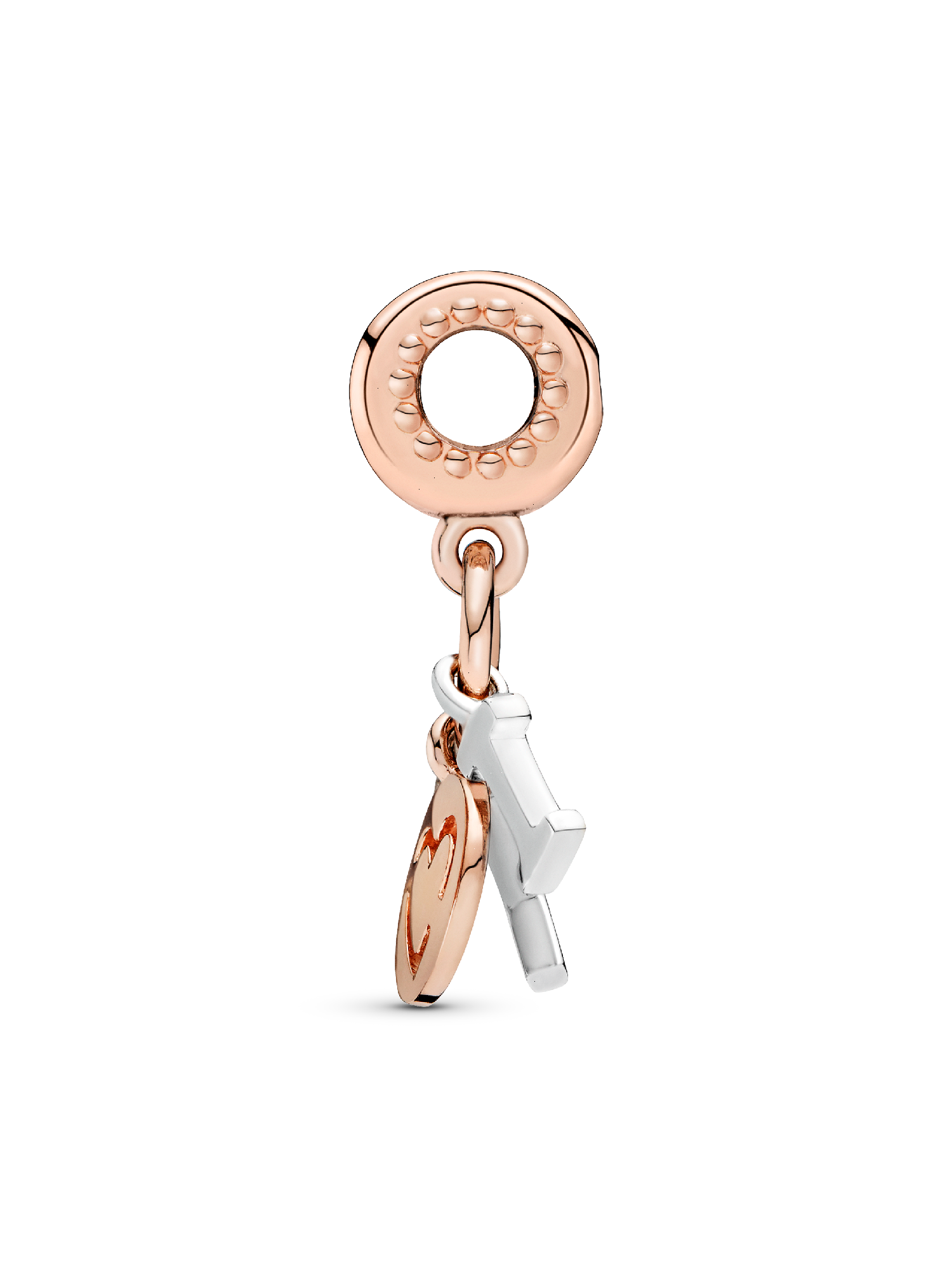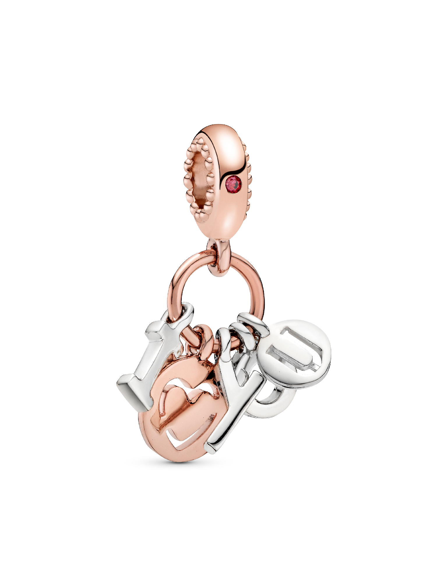 Start your style love story with this two-tone I Love You Letters Dangle Charm, hand-finished in sterling silver and 14k rose gold-plated metal. The dangles spell out the words "I love you" and a single red cubic zirconia on the bail echoes the sentiment. Wear it on your favourite Pandora Moments bracelet or share it with someone special to show them how you feel about them.