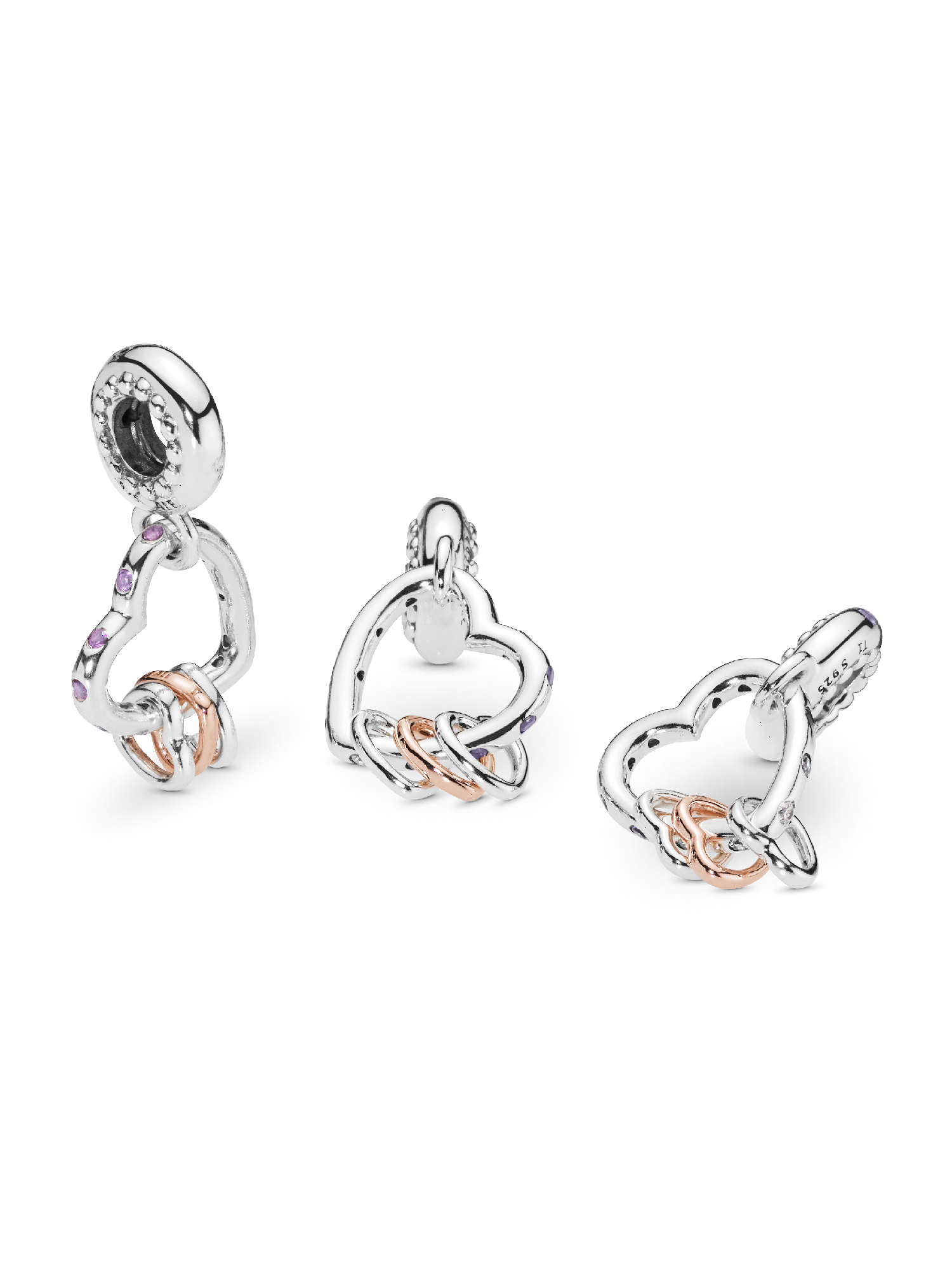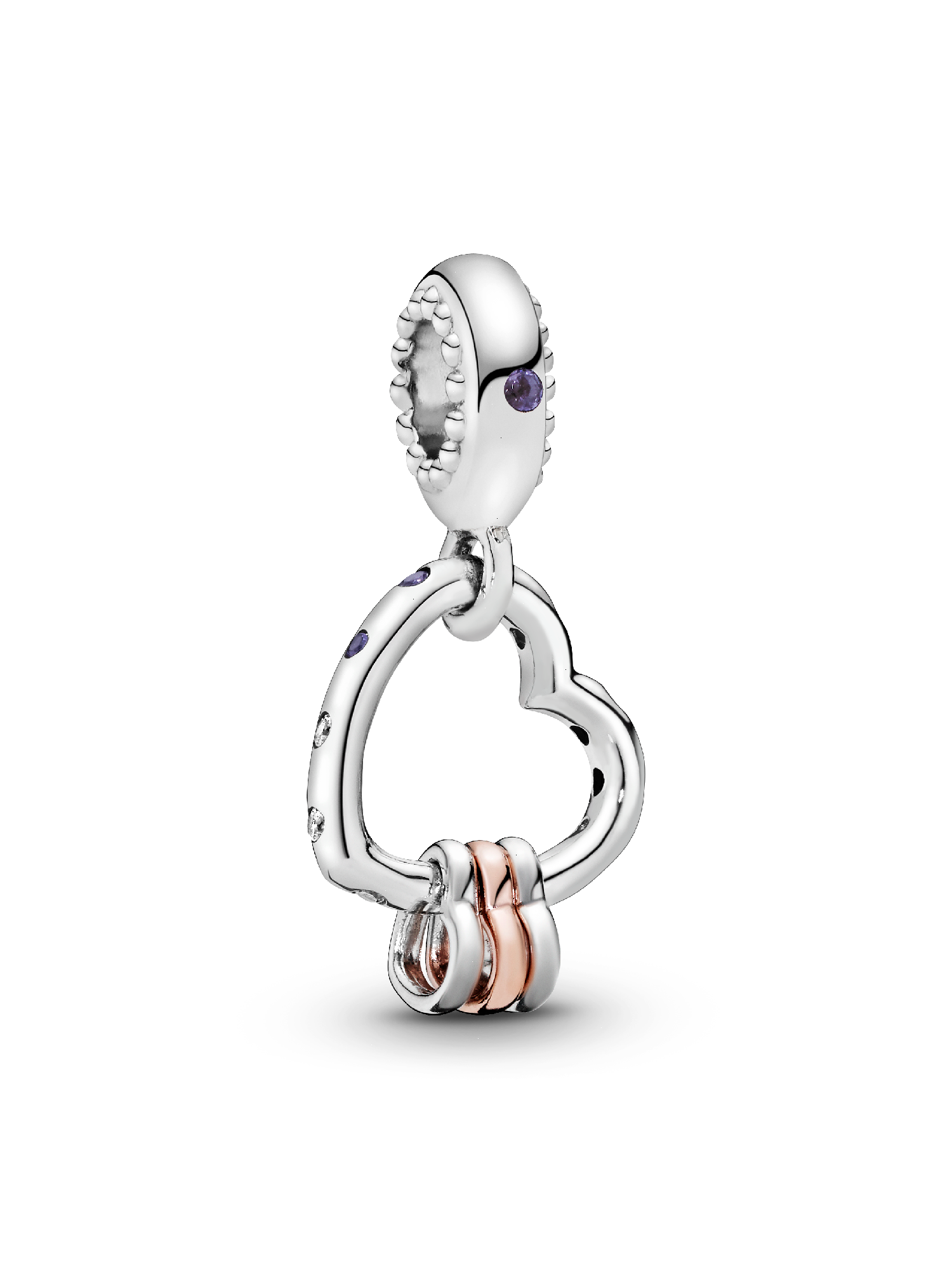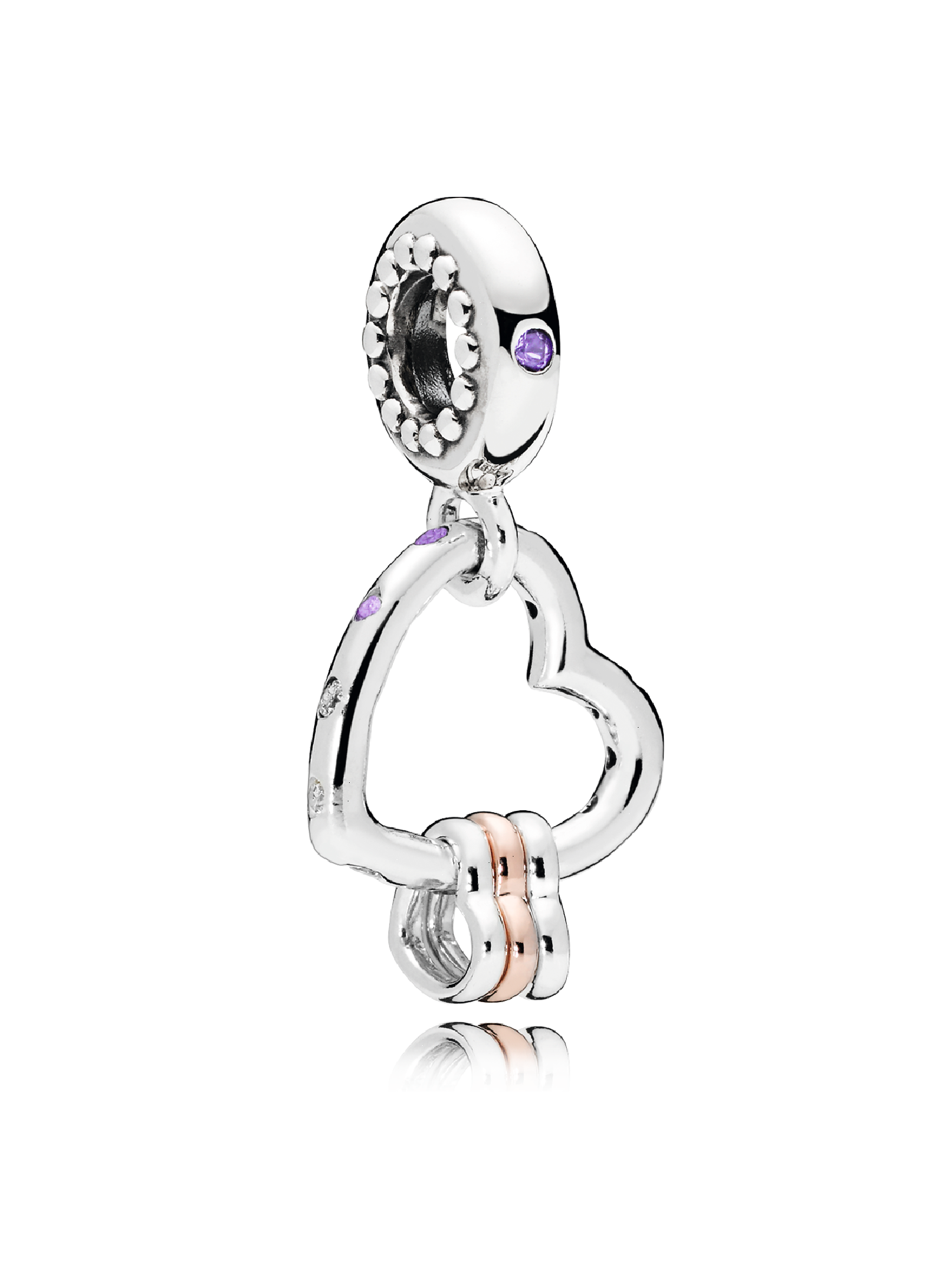Hearts can hold so much love. Show the things that mean the most to you on your Pandora Moments bracelet with the Heart Full of Hearts Dangle Charm. Shaped from sterling silver, this charm holds miniature hearts, one of which is plated with 14k rose gold. The large heart and bail are detailed with crystals and cubic zirconia for subtle sparkle.