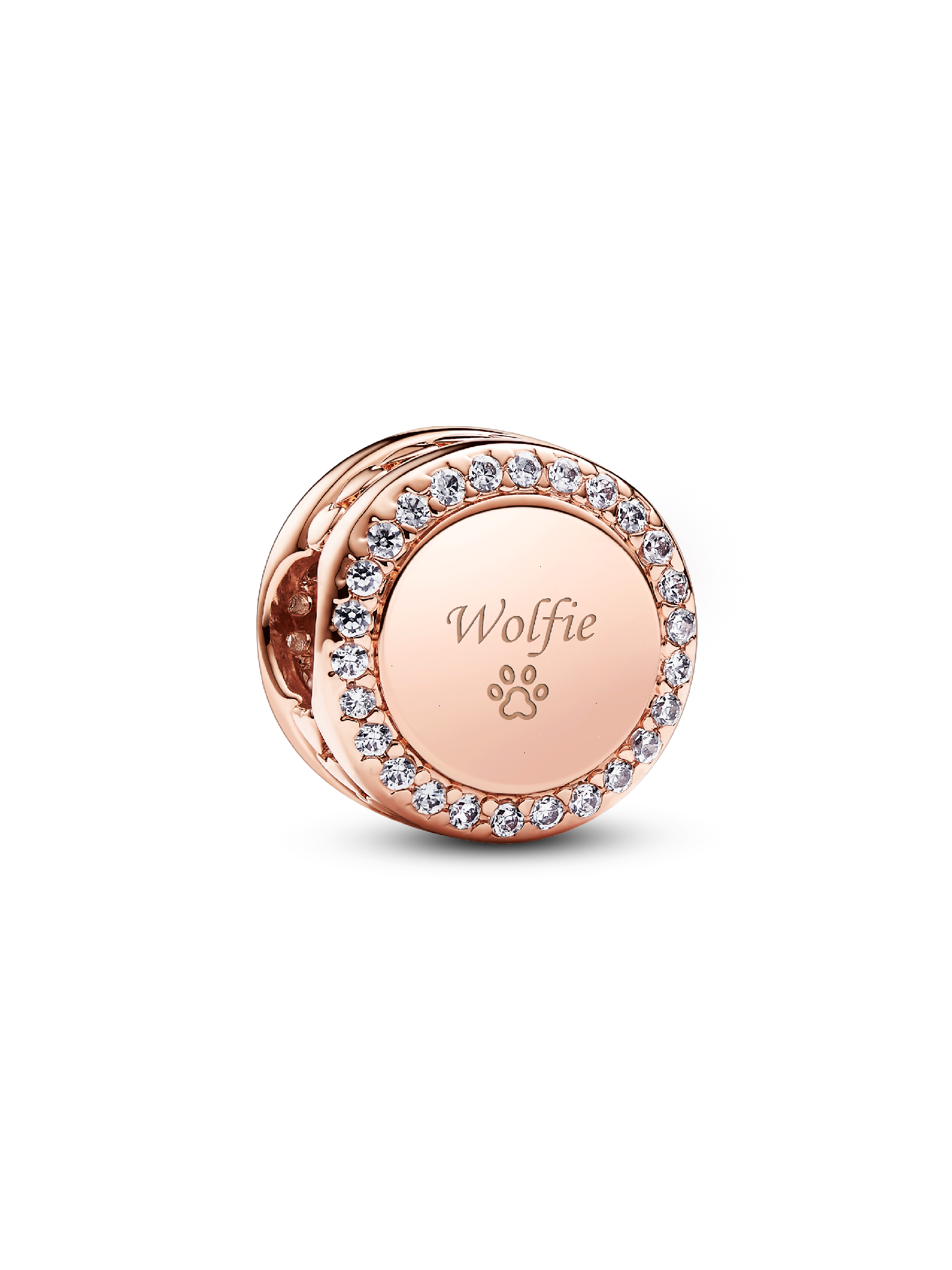 Add this simple-yet-sleek charm to your Pandora collection. This polished Engravable Sparkling Button Charm is hand-finished in 14k rose gold plating, and features 52 bead-set round brilliant-cut clear cubic zirconia stones in a delicate ring. This Pandora piece is all about self-expression: choose to keep it blank and let the symbol speak for itself or engrave the front, the back or both. Pandora Engraving is only available in select stores and markets.