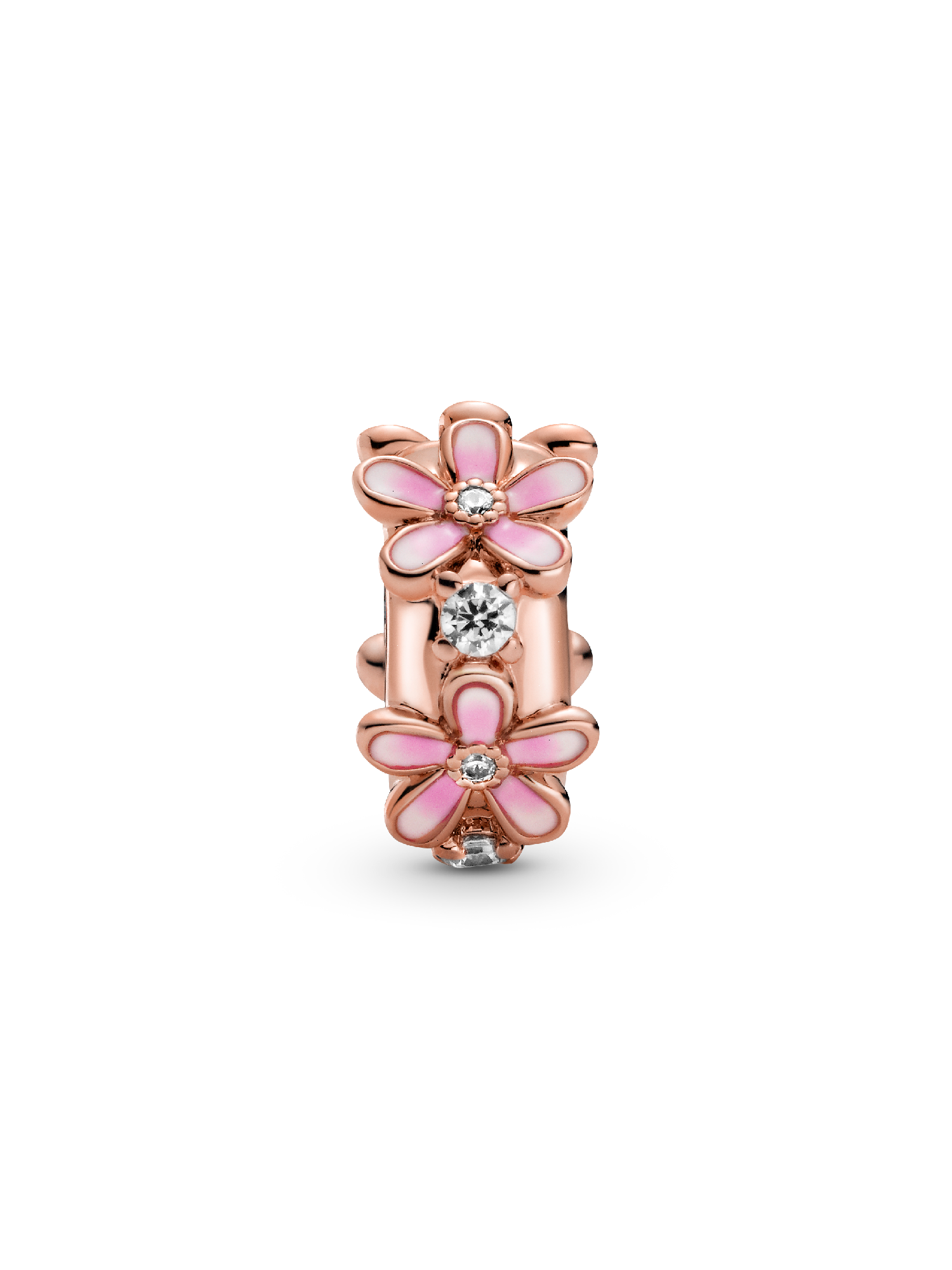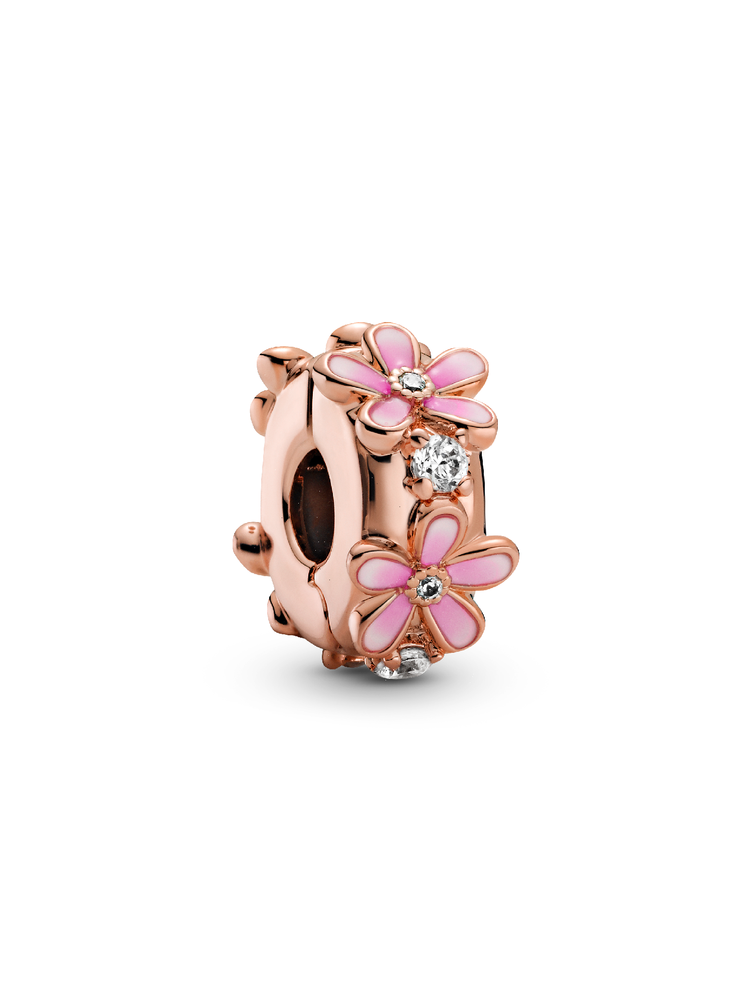 Clip on some colour with the Pink Daisy Spacer Charm. Featuring sparkling clear cubic zirconia and transparent raspberry pink and white enamel, this warm-toned charm is hand-finished in 14k rose gold plating. The daisies, which represent diversity and community, have subtle dark-to-light enamel shading on the petals and miniature stones in the centre. With silicone on the inside, this flower charm is designed to be styled in a fixed position on snake chain styles.