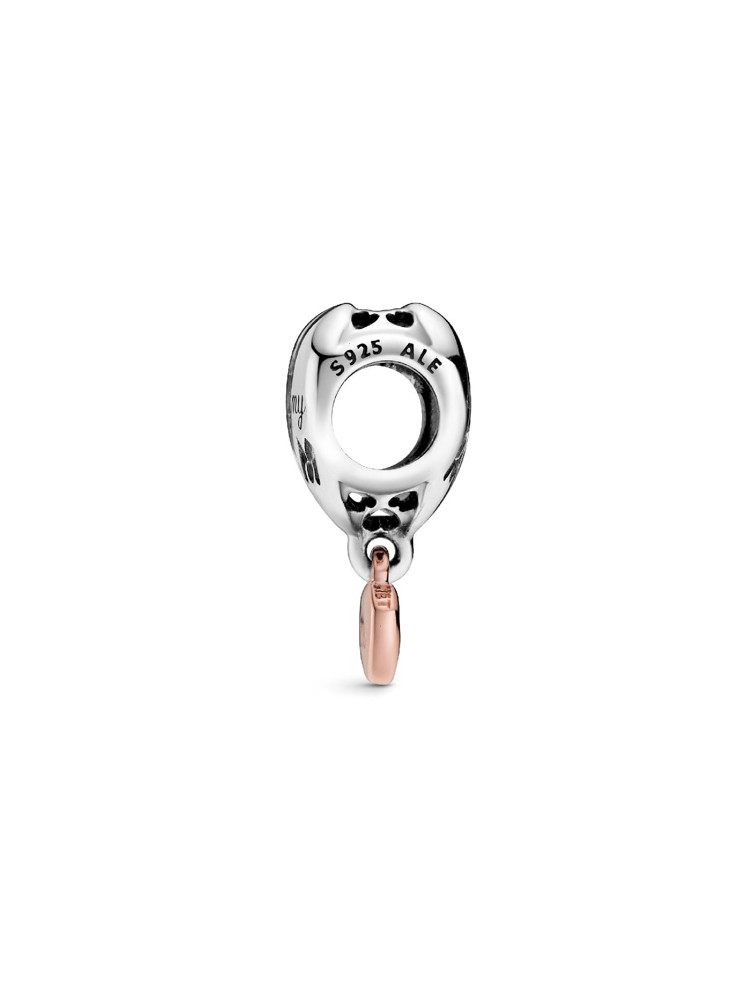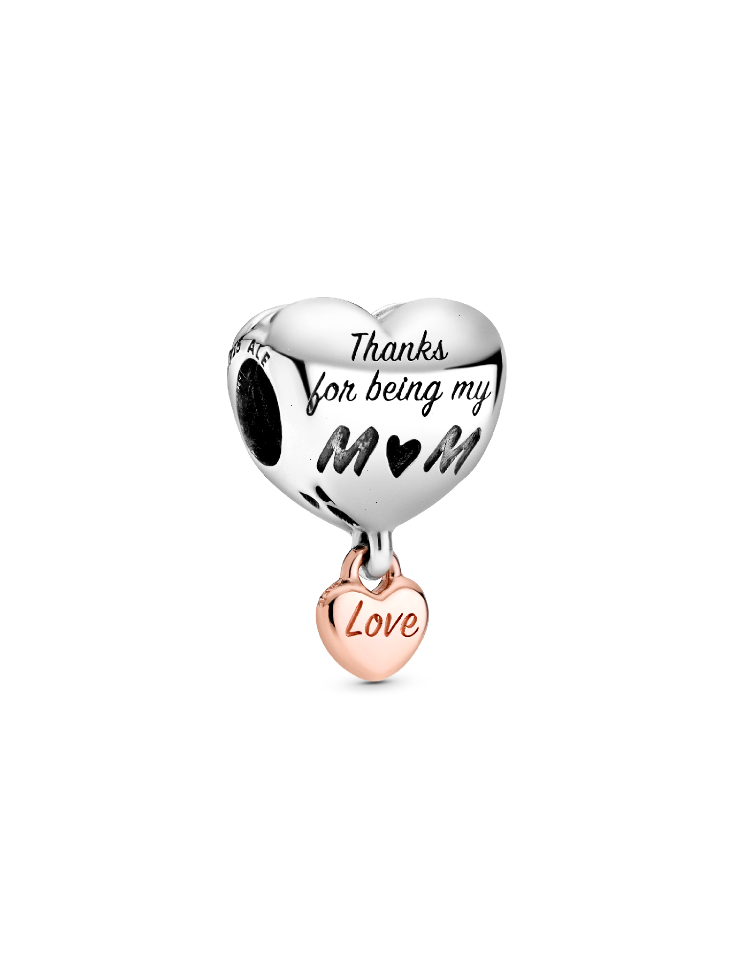 Let this two-toned Love You Mum Heart Charm do all of the talking for you. The heart-shaped piece is hand-finished in sterling silver and features a love heart dangle in 14k rose gold-plated metal. The sterling silver heart features the engraving “Thanks for being my mum” with a heart element; the dangle features “Love” and “You” on each side. Show your mum what’s truly in your heart with this heartfelt charm.