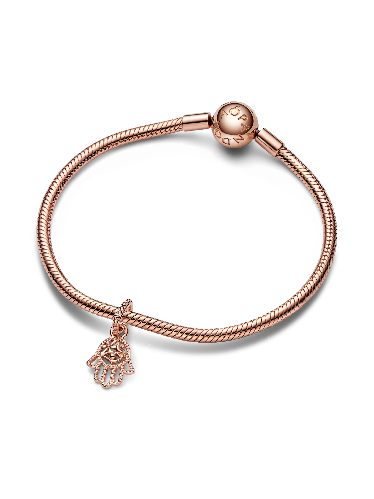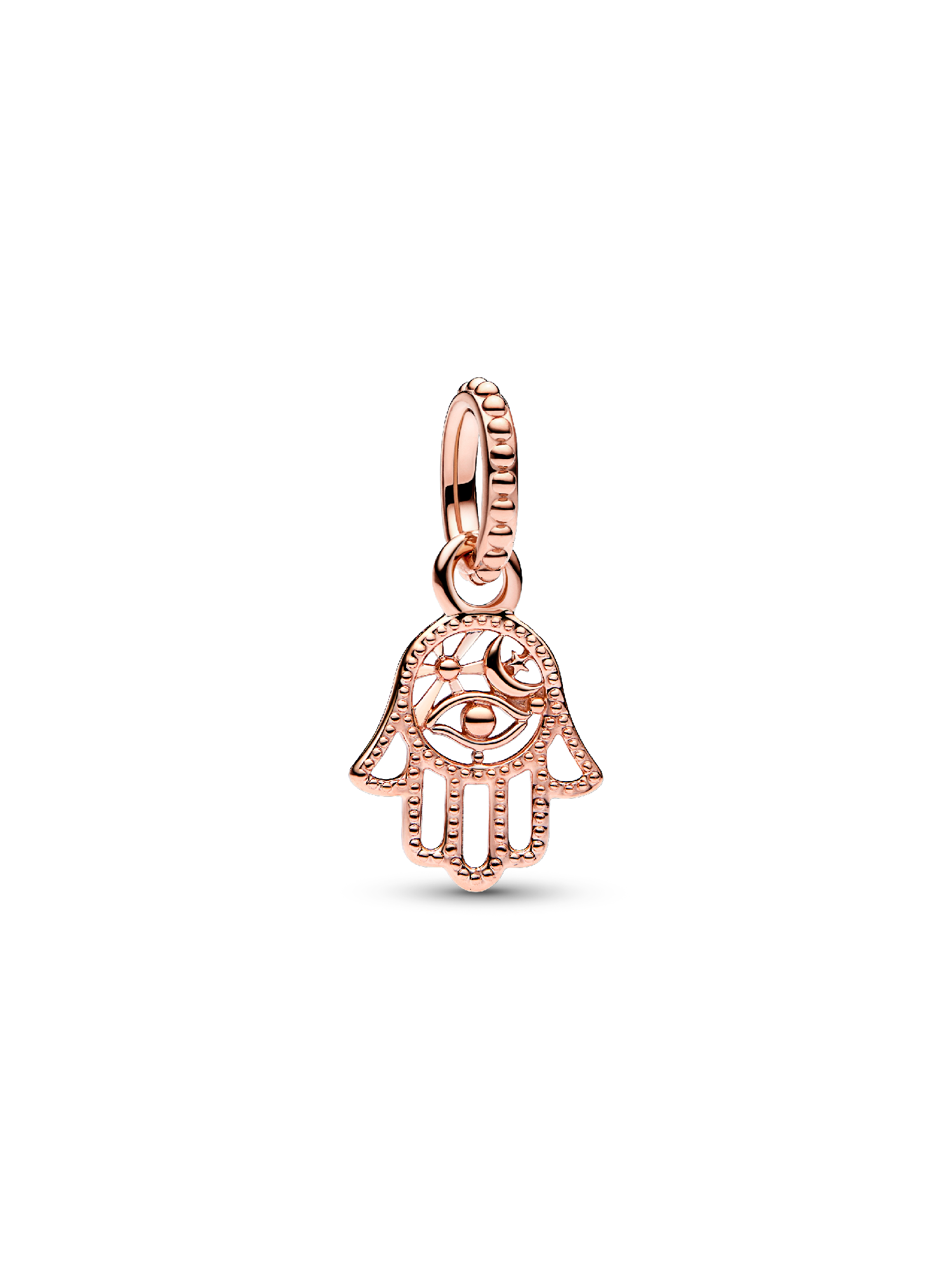 Always channel positive vibes with the Protective Hamsa Hand Dangle Charm. This Hamsa charm features an intricate openwork design in 14k rose gold plating and hangs from a beaded bail. An eye, rays and crescent moon motifs feature inside the hand, which includes one-sided beading along its outline. Traditionally worn as a talisman to defend against evil, the dangling hand is seen as a gesture of welcoming kindness, friendship and grace into your life.