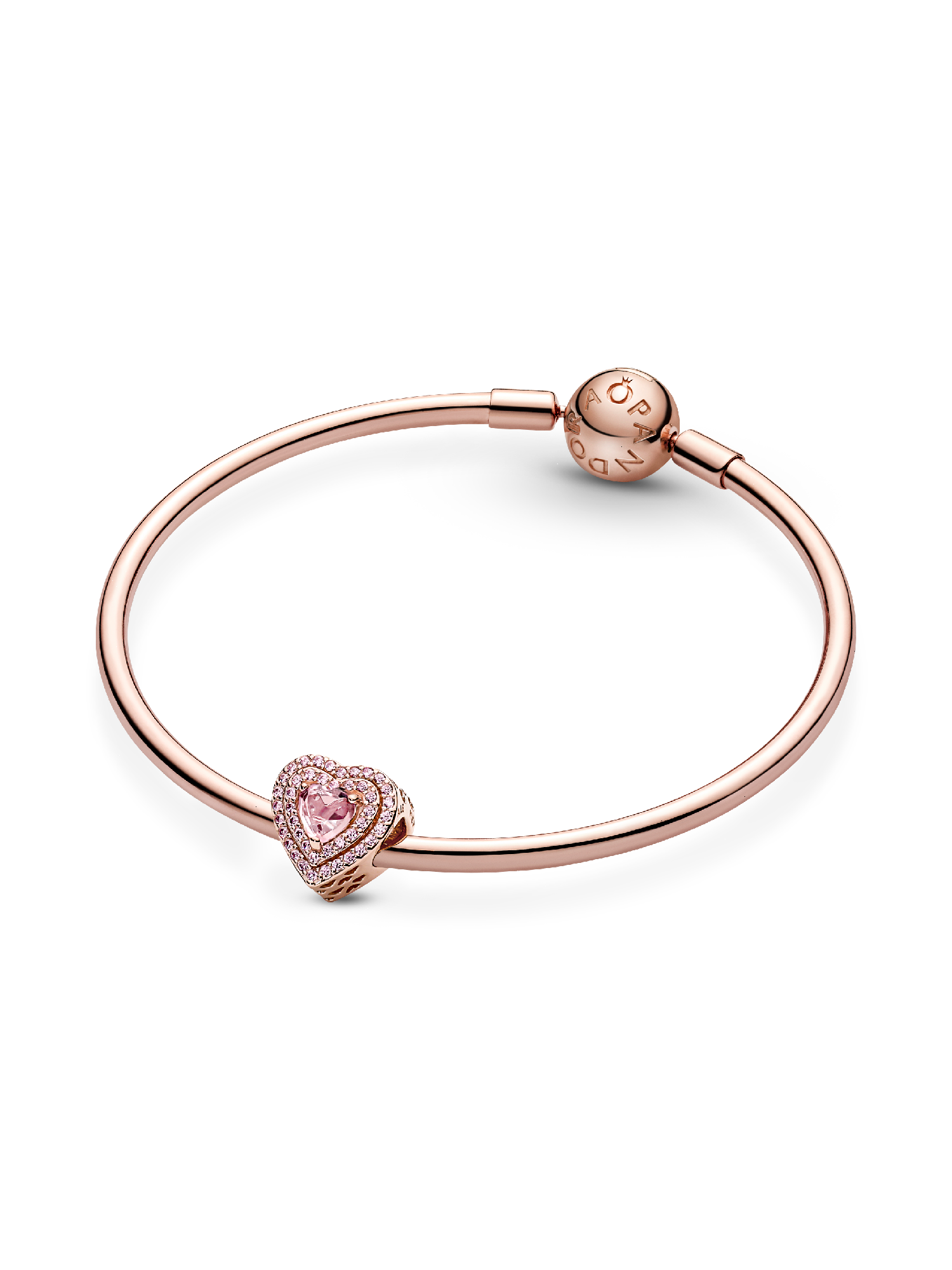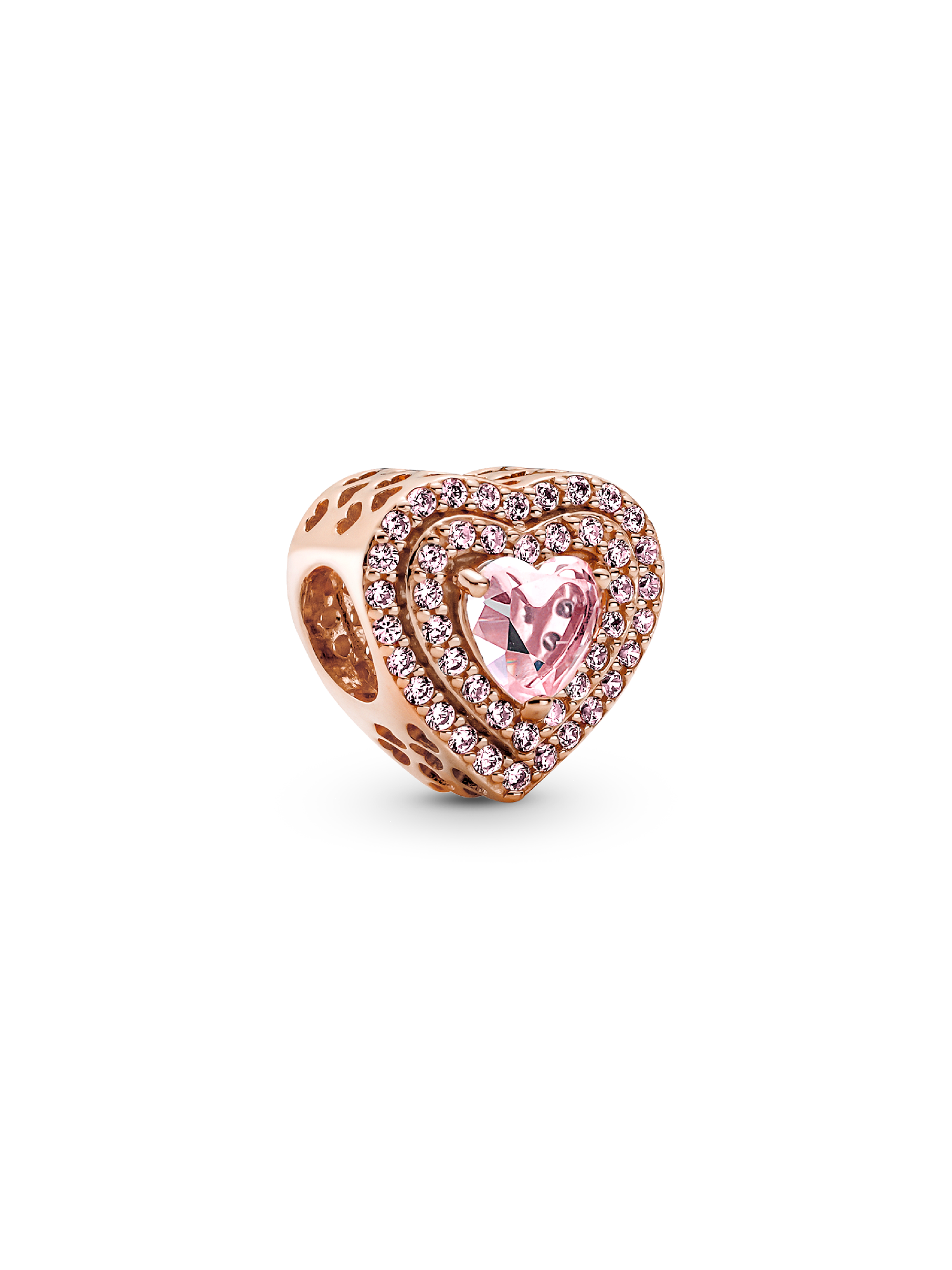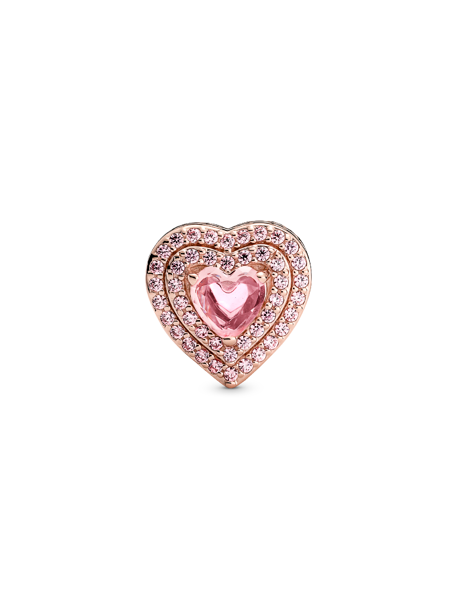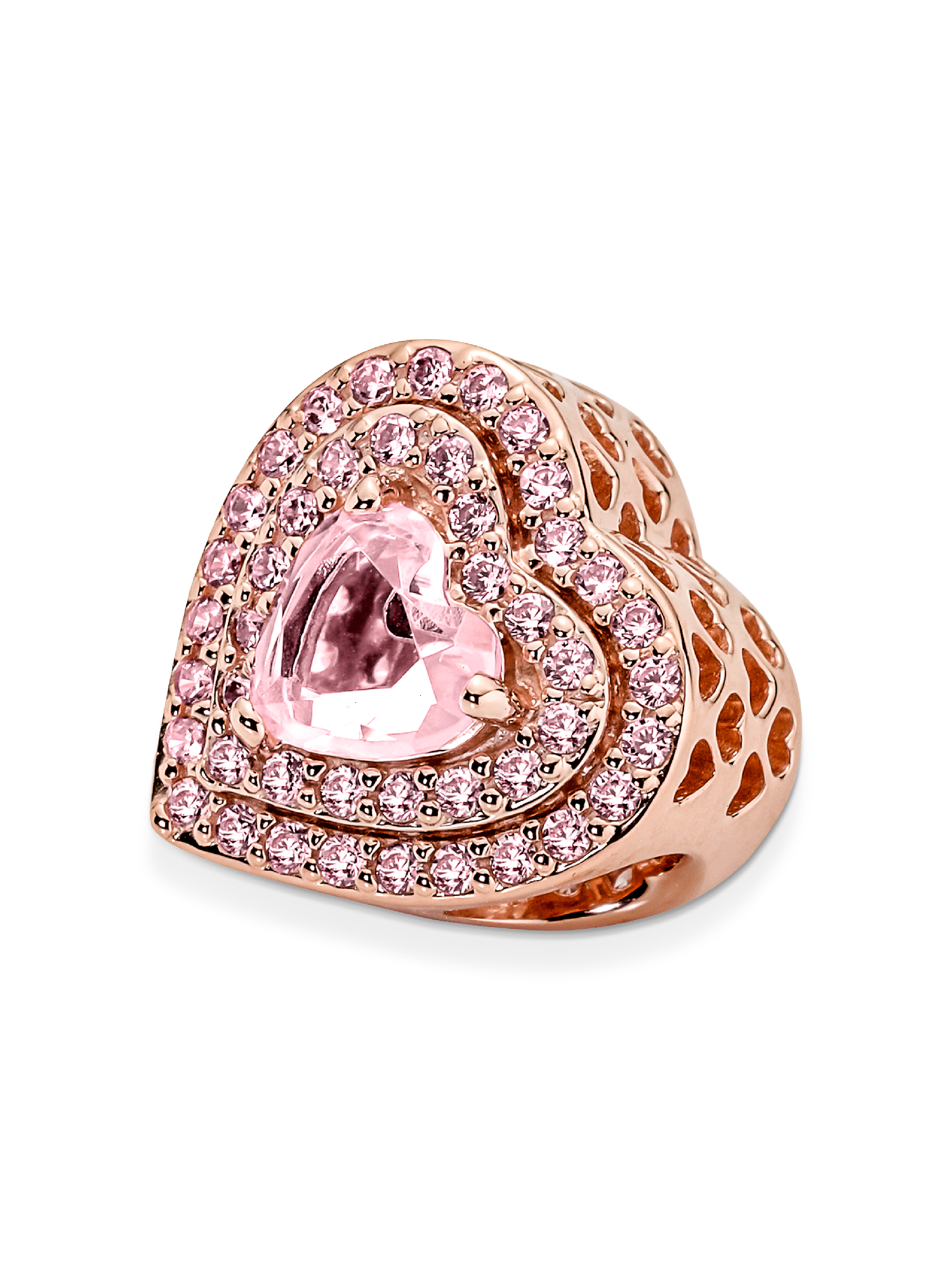 Spread the love with the Sparkling Leveled Hearts Charm. Hand-finished in our 14k rose gold-plated unique metal blend, this charm features a central elevated heart-shaped orchid pink man-made crystal outlined by two halos of pink cubic zirconia. A cut-out heart pattern features on the sides. Make a sparkling tribute to love and add a romantic touch to any outfit with this stunning charm. Gift this heart charm to someone special to show how much you care.