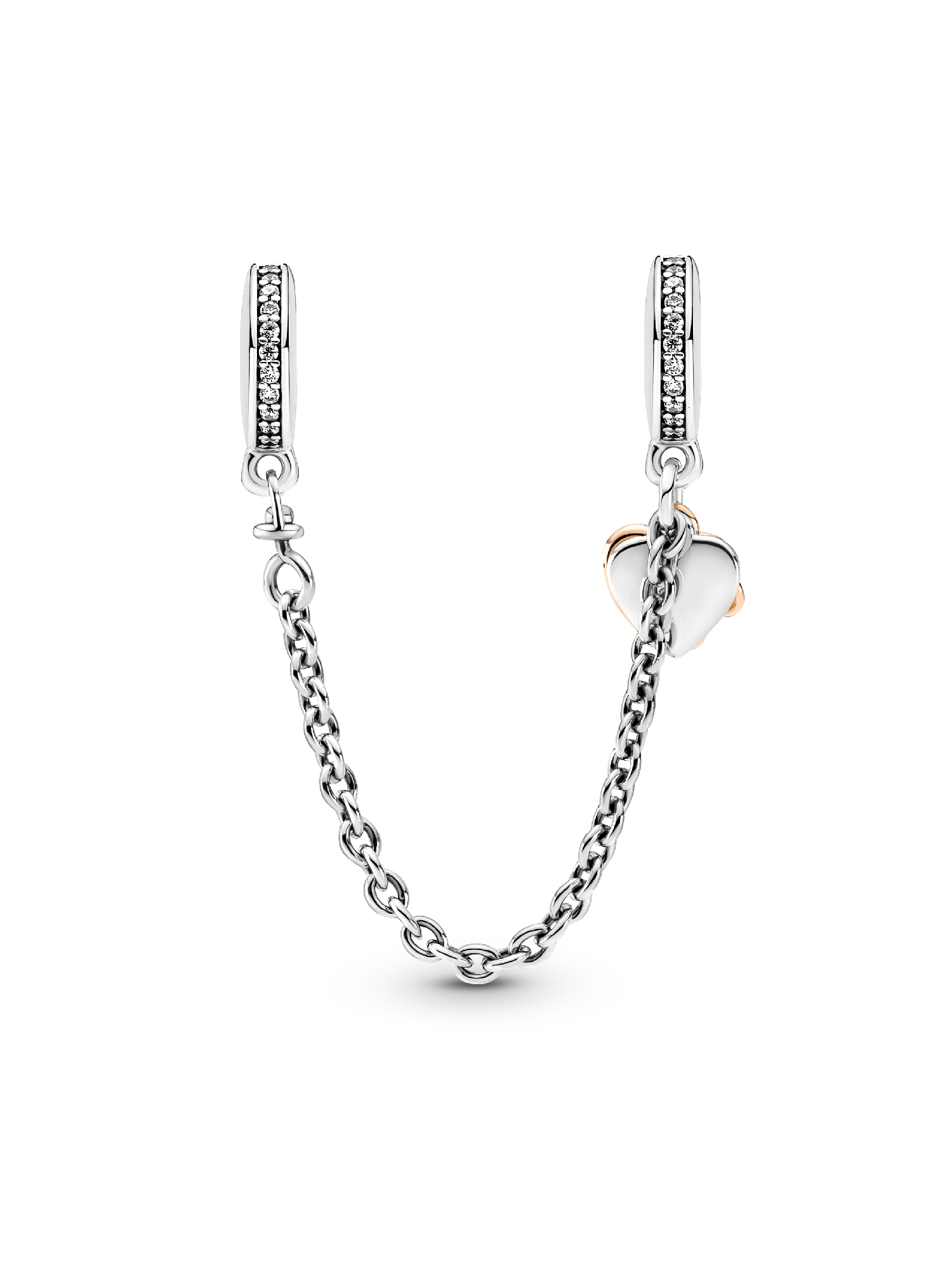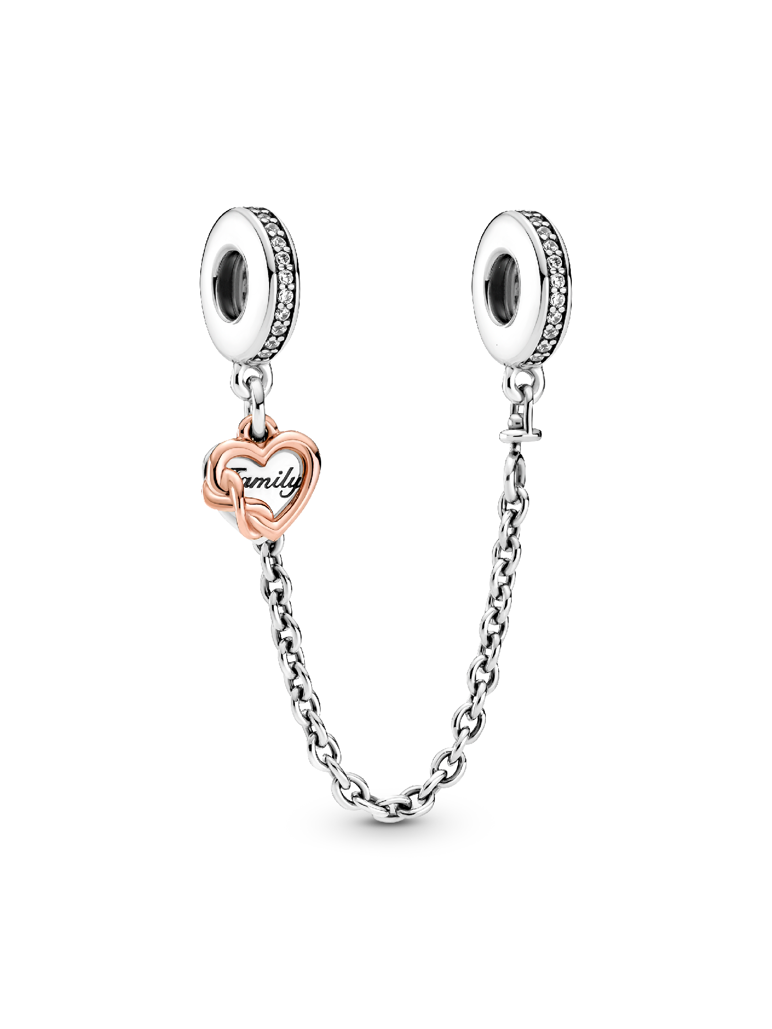Keep your charms safe and stylish with the Family Heart Safety Chain Charm. This two-tone safety chain charm is hand-finished in sterling silver and 14k rose gold-plated metal. It features two dangling hearts, one warm-toned open heart with an infinity sign and a second heart-shaped sterling silver disc engraved with "Family" on the front. A clip charm on each end includes a line of clear cubic zirconia, finishing off the look in sparkling style.
