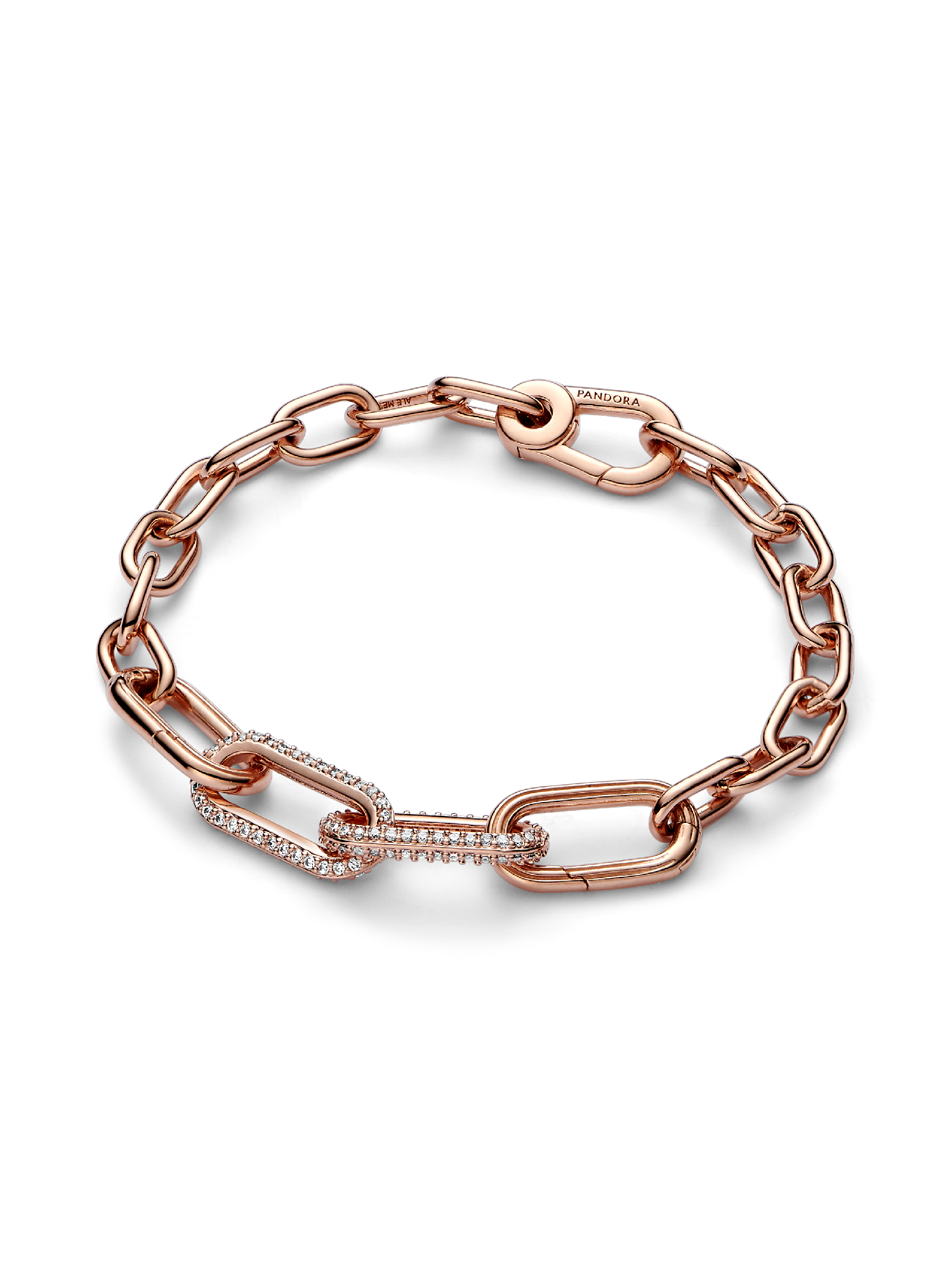 Give your chains a glow up with this Pandora ME Styling Pavé Double Link. Hand-finished in 14k rose gold plating, this piece is made of two interlocking links set with two rows of round brilliant-cut clear cubic zirconia. Wear yours between openable links on your Pandora ME link chain bracelets or necklaces, or hang it on a pair of hoops for a unique statement. Styling tip: the length of a double link matches the length of two regular links, four small interlocking links or one styling link – for easy personalisation.