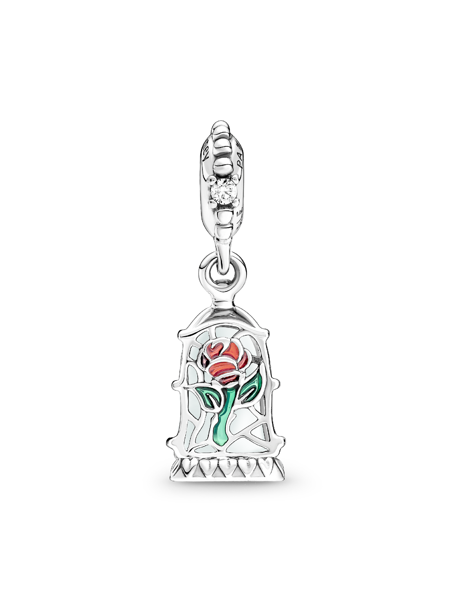 Add a magical touch to your style with the Disney Beauty and the Beast Enchanted Rose Dangle Charm. It features a transparent light blue Murano glass dome with engraved stars encasing a cut-out rose with red and green hand-applied enamel details. Hand-finished in sterling silver, the charm is decorated with clear cubic zirconia stones and micro-beads on the bail and features the engraving "Beautiful as a Rose" on the bottom. A spellbinding reminder of the power of love.