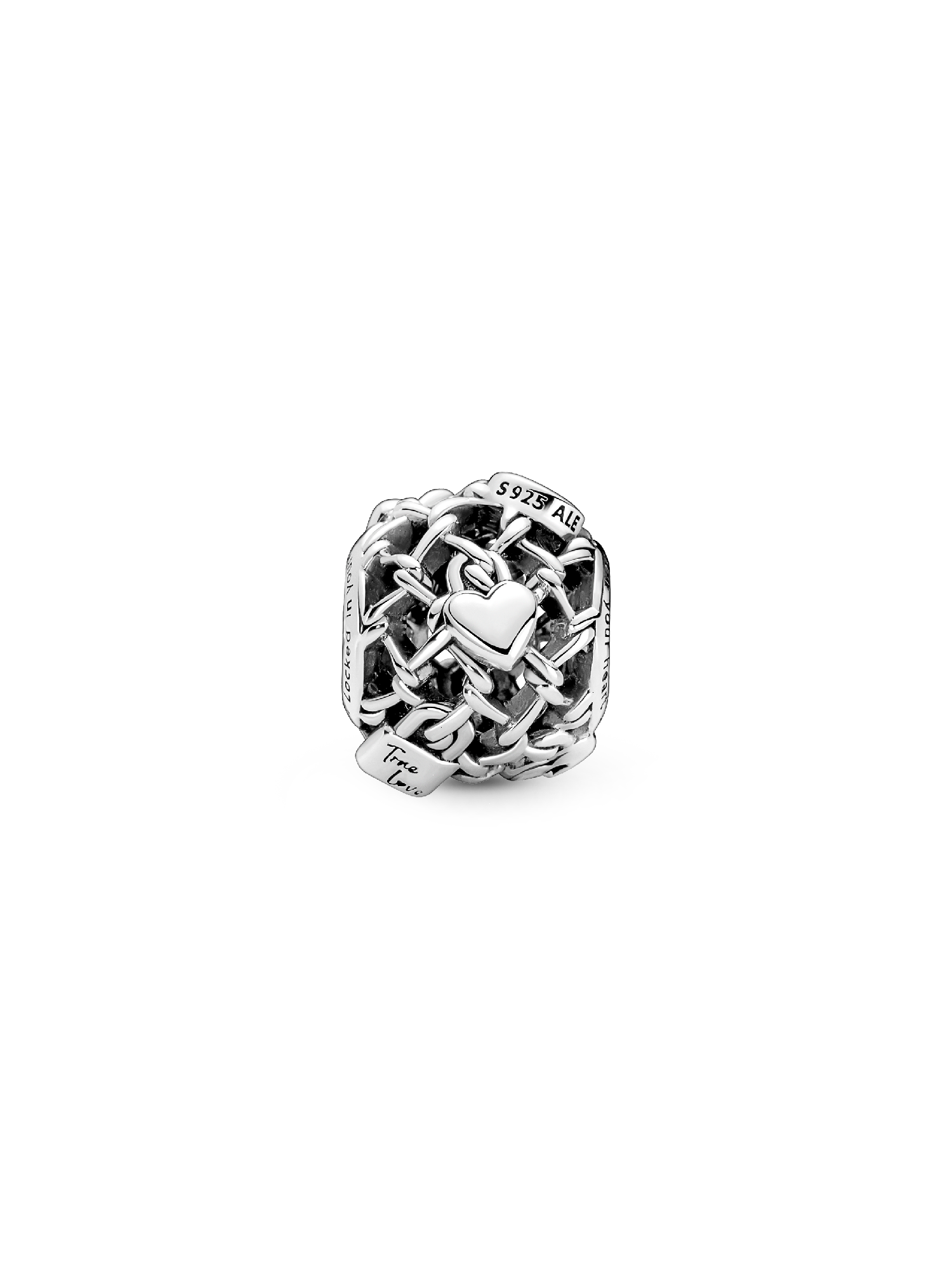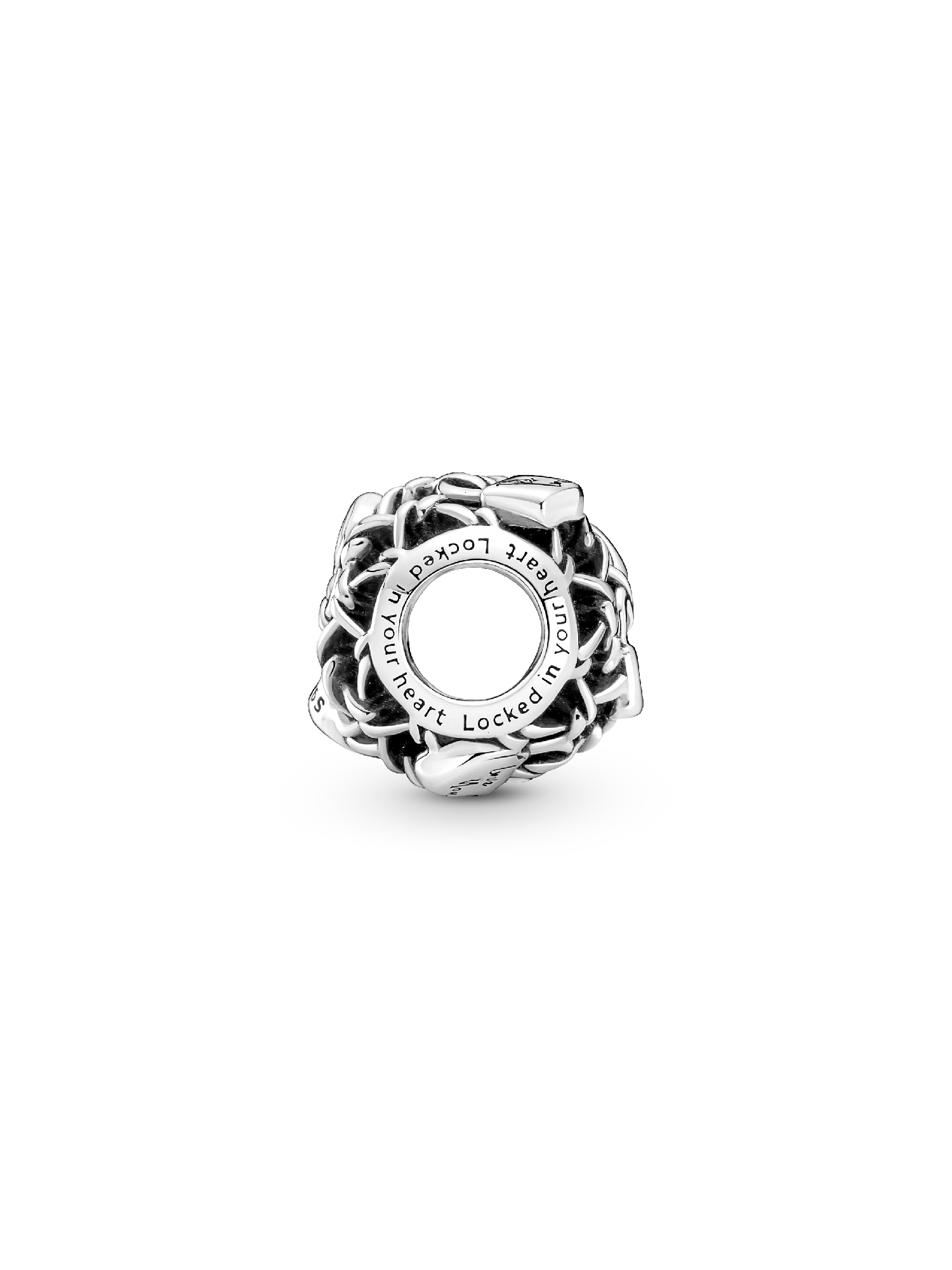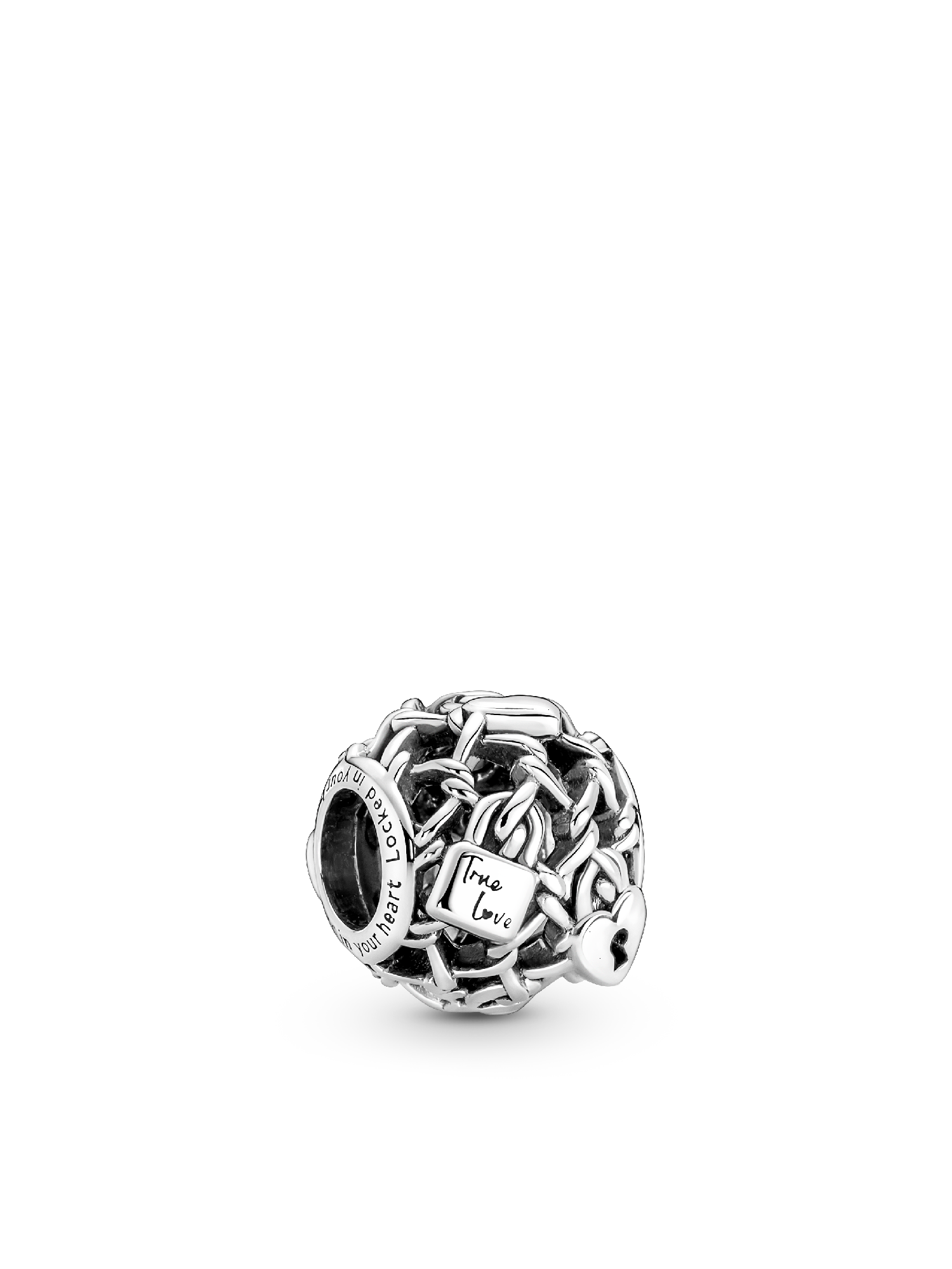 Are new charms the key to your heart? Unlock new styling with this Openwork Chain Link Padlock Charm. Hand-finished in sterling silver in an intricate cut out pattern, the charm features little padlock motifs inspired by the love locks placed on bridges around the world by happy couples. Engraved with the messages "Locked in your heart", "True love" and "Love you", this charm is the perfect way to lock memories of the ones you love onto your favorite charm holders.