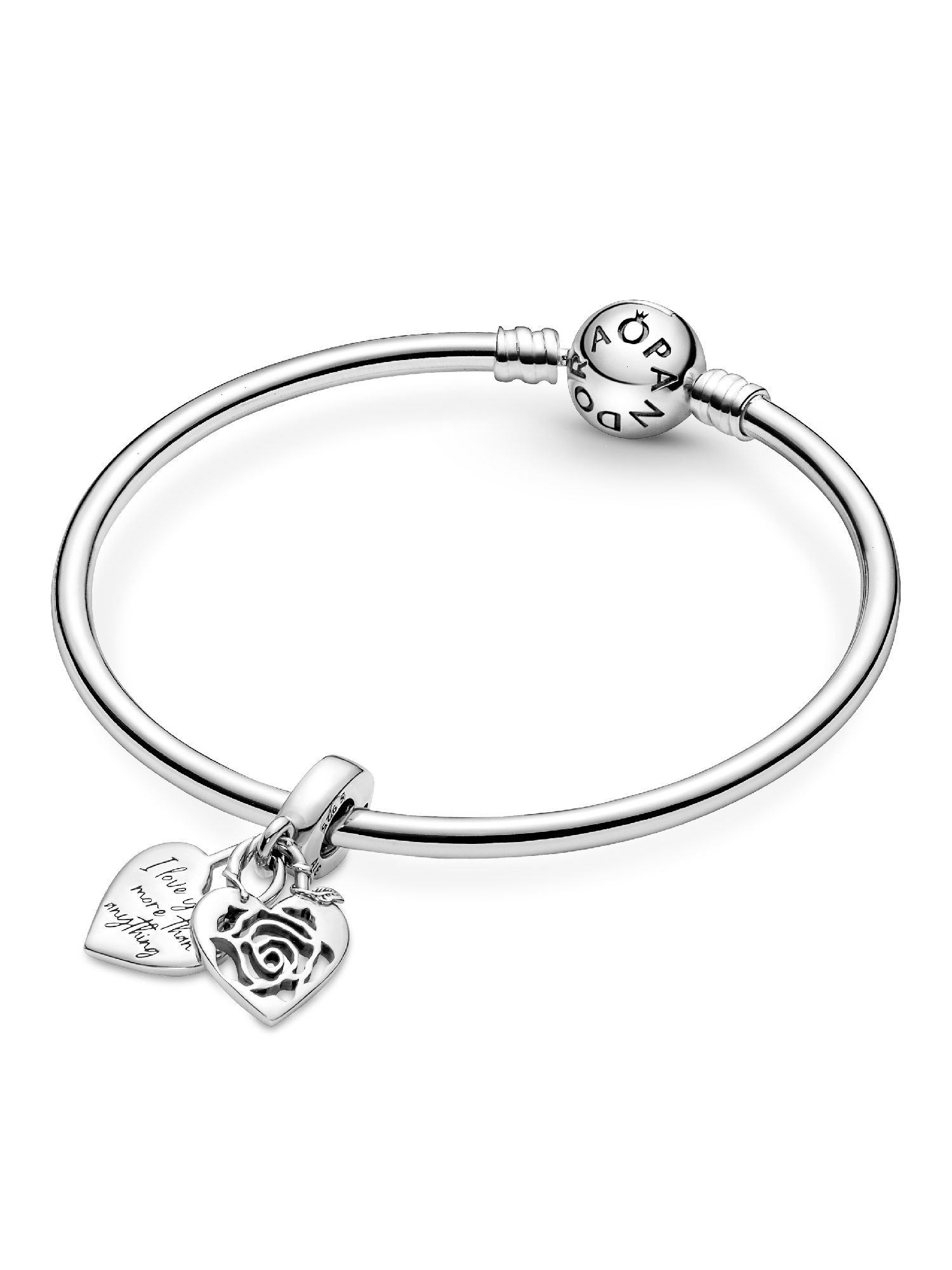 Keep your heart on your sleeve always with this Rose Heart Padlock Dangle Charm. Hand-finished in sterling silver and engraved with the words "I love you more than anything", this romantic dangle charm resembles a heart-shaped padlock with a rose cut-out motif and was inspired by love lock bridges across the world. Gift yours to a loved one as a token of your affection or add it to your own collection as a reminder that love can flourish anywhere.