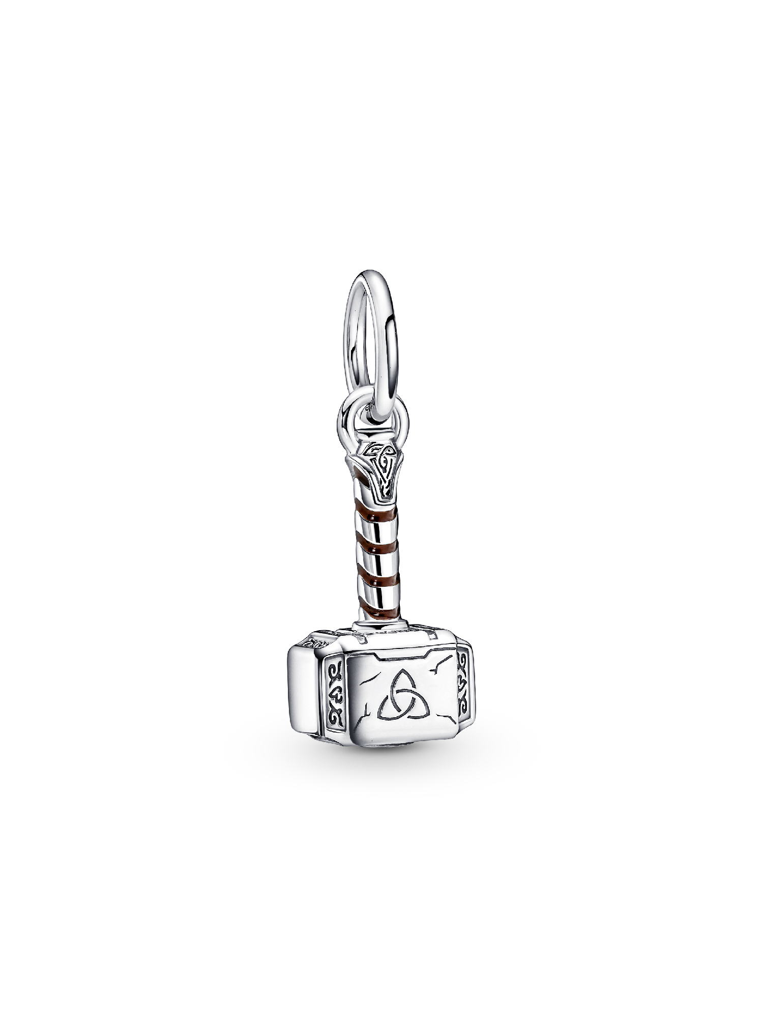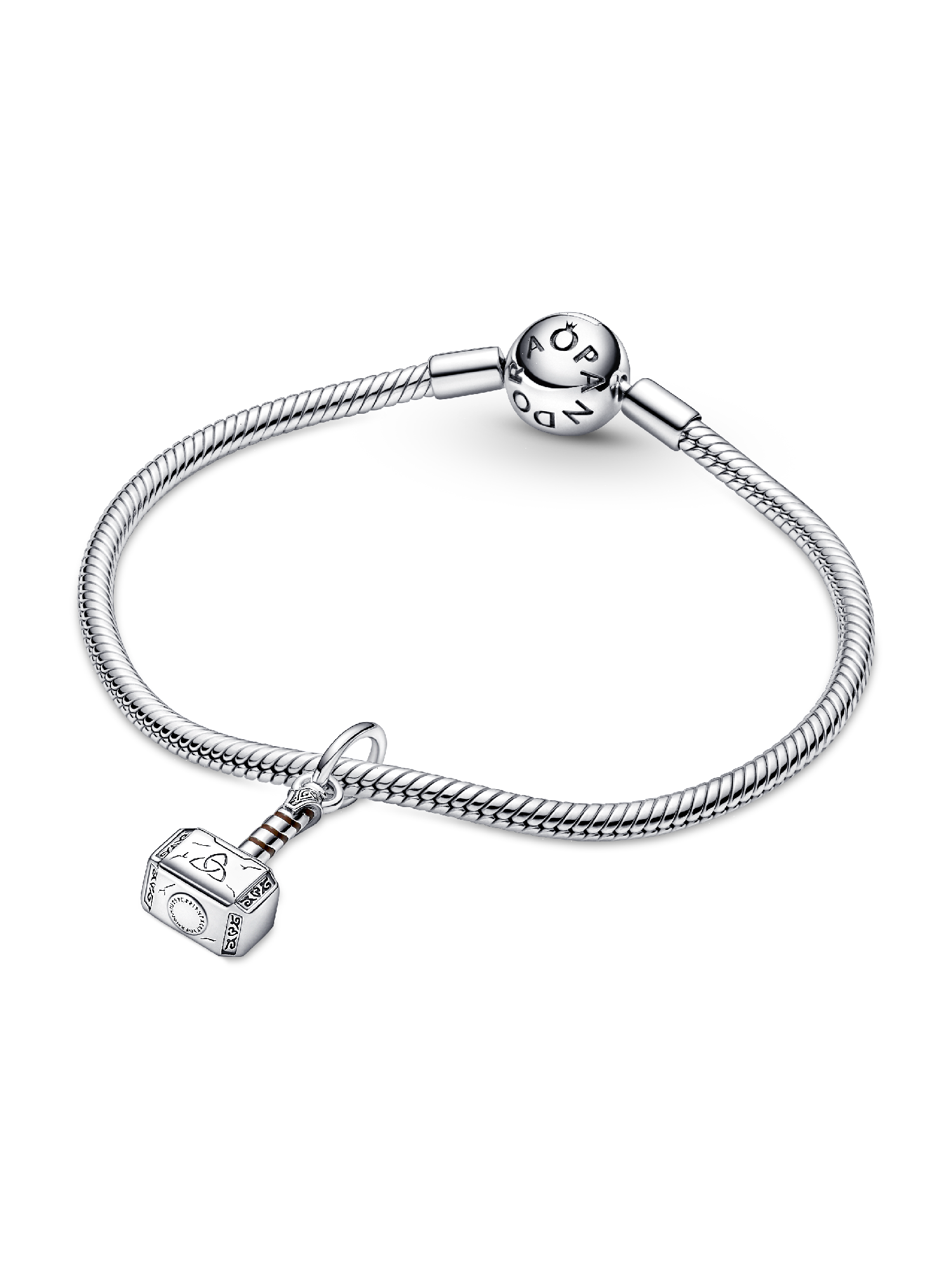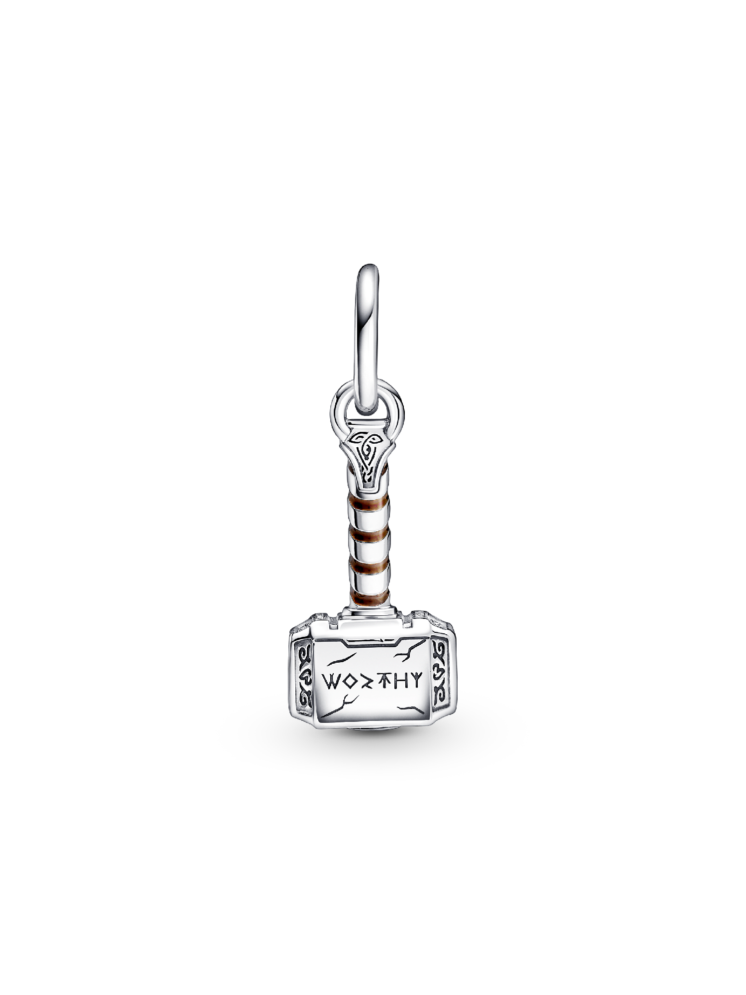Bring the thunder with our Marvel The Avengers Thor's Hammer Dangle Charm and share your love for the Marvel Cinematic Universe with the world. Hand-finished in sterling silver, Thor's hammer is brought to life with swirling brown enamel, engraved scratch marks and Asgardian-style rune symbols. The side of the hammer is engraved with “Worthy” as a reminder of the source of Thor’s power. Add this charm and more of your favorite heroes to our Pandora Moments Marvel The Avengers Logo Clasp Snake Chain Bracelet.