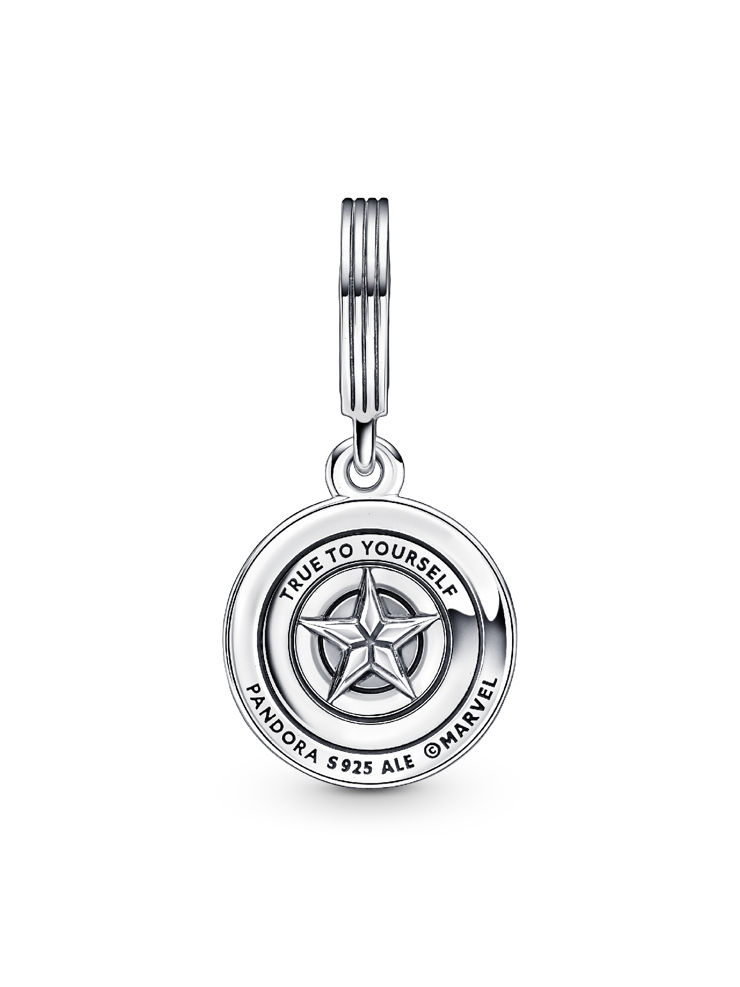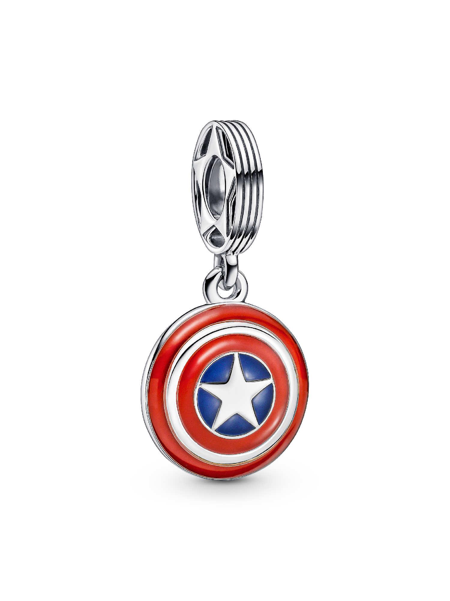 Reporting for duty: carry our Marvel The Avengers Captain America Shield Dangle Charm and share your love for the Marvel Cinematic Universe with the world. Captain America's legendary shield shines bright in hand-applied red, white and blue enamel. Engraved with the message, "TRUE TO YOURSELF," this sterling silver stunner symbolizes hope and protection. Add this charm and more of your favorite heroes to our Pandora Moments Marvel The Avengers Logo Clasp Snake Chain Bracelet.