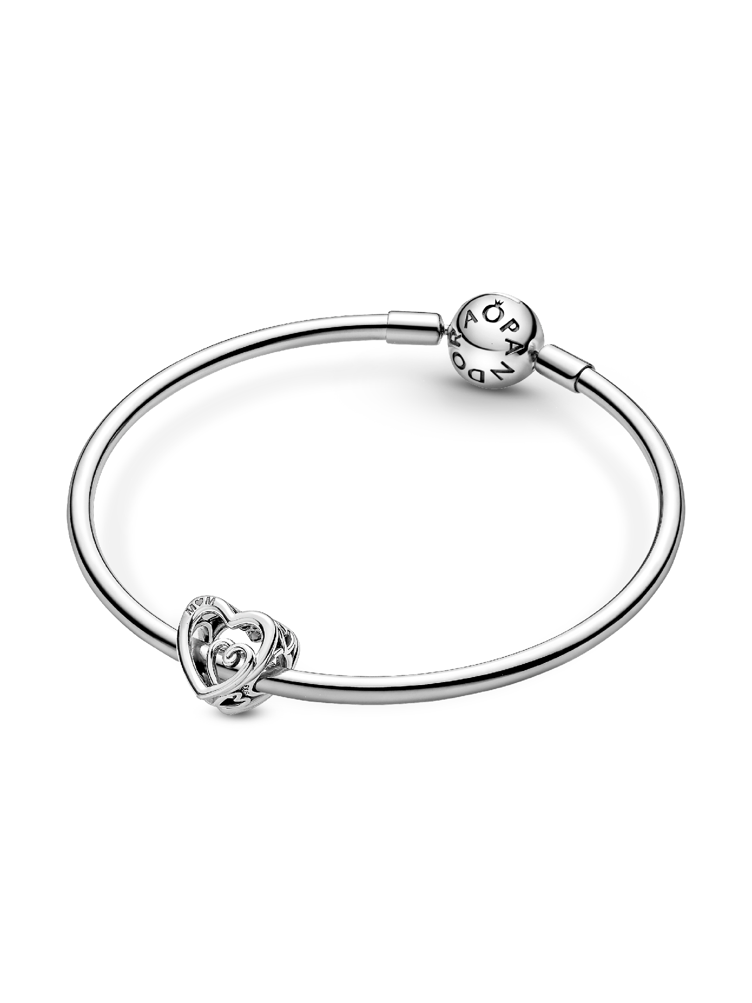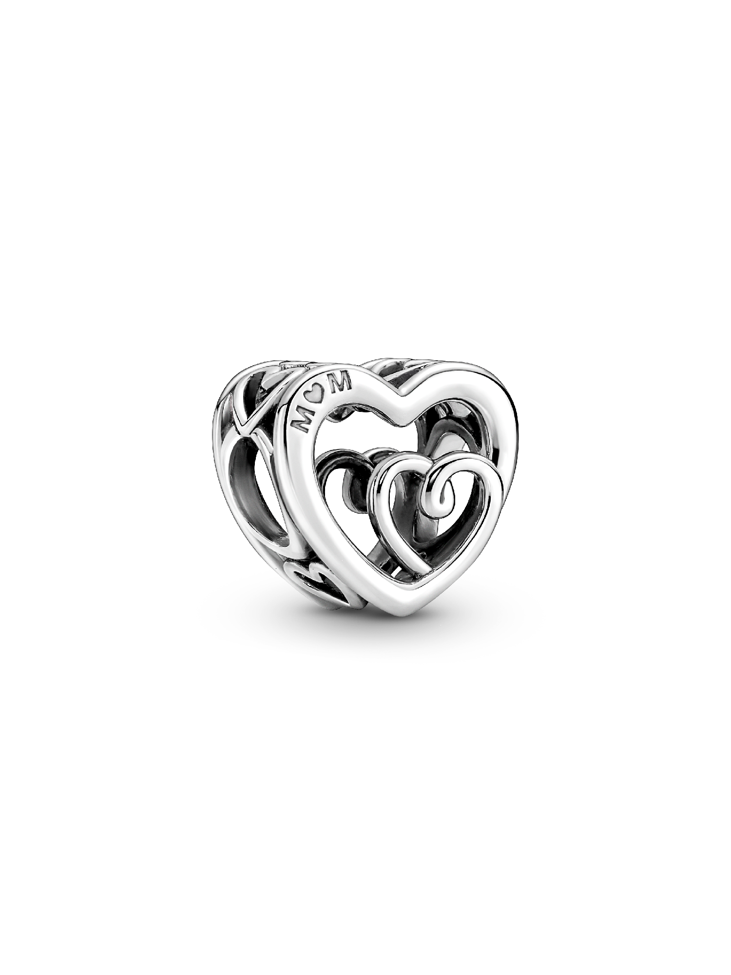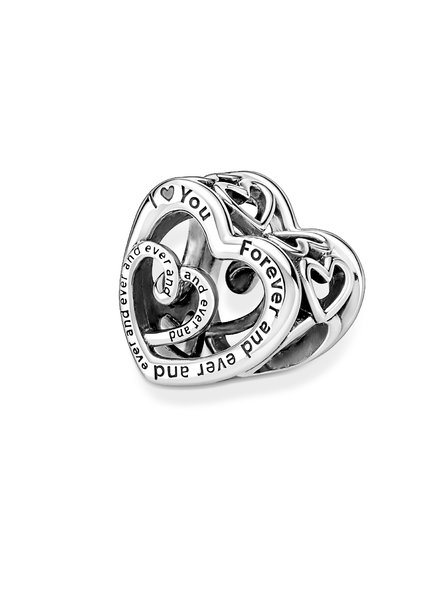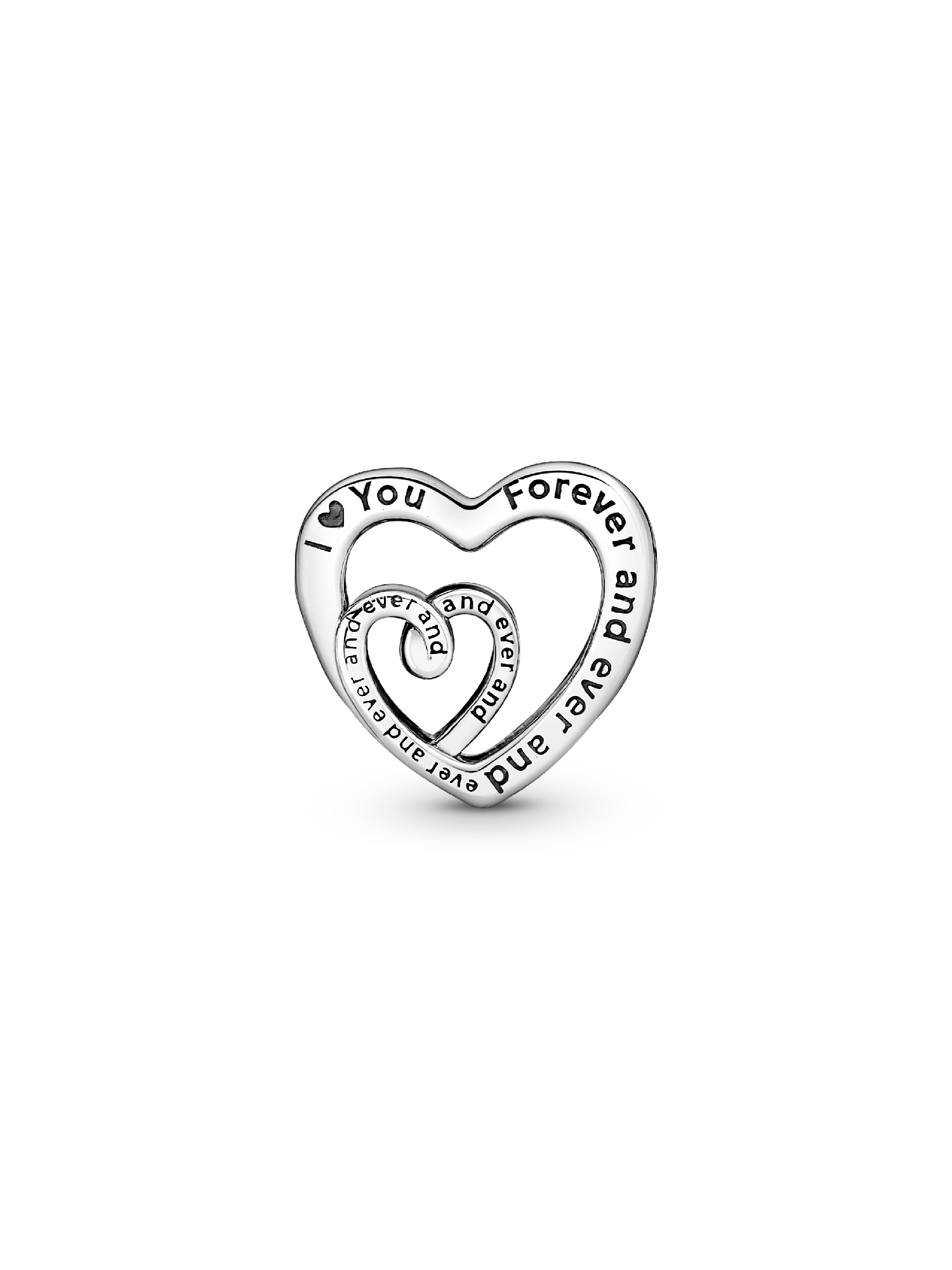 Love shines in the Entwined Infinite Hearts Charm. Crafted in sterling silver, it features one heart swirling into another with the engraving: "I love You Forever and ever and ever and ever and ever and ever." A gift that symbolises the unbreakable bond between a mother and child.