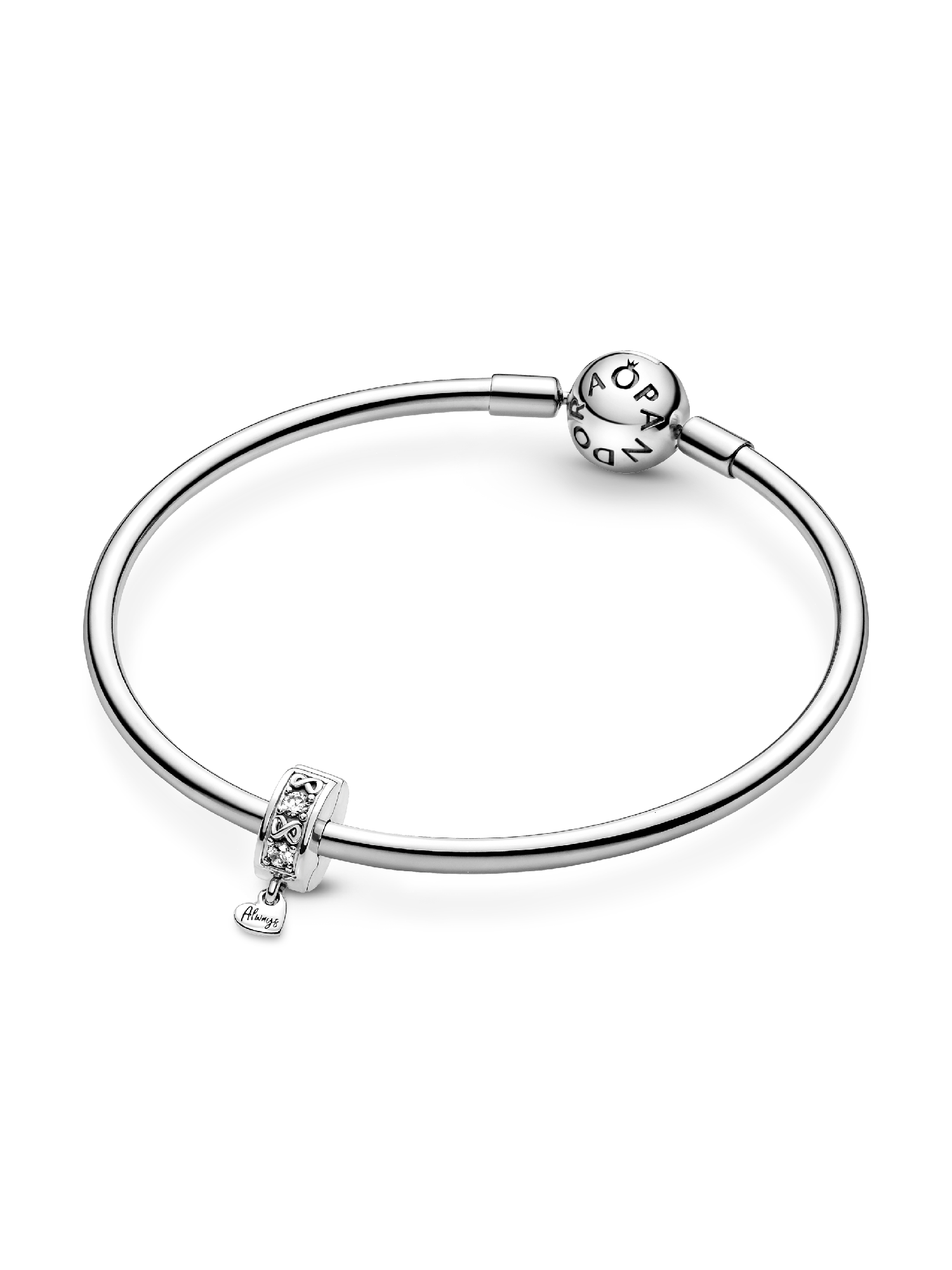 Functional yet stylish, the Family Always Pavé Clip Charm features an alternating infinity symbol and stone pattern on the rim. The polished sterling silver heart dangle is engraved with "Always" to remind us that the love of family is eternal. This clip charm has a silicone grip to prevent sliding and can be styled anywhere on a bracelet except raised charm dividers.