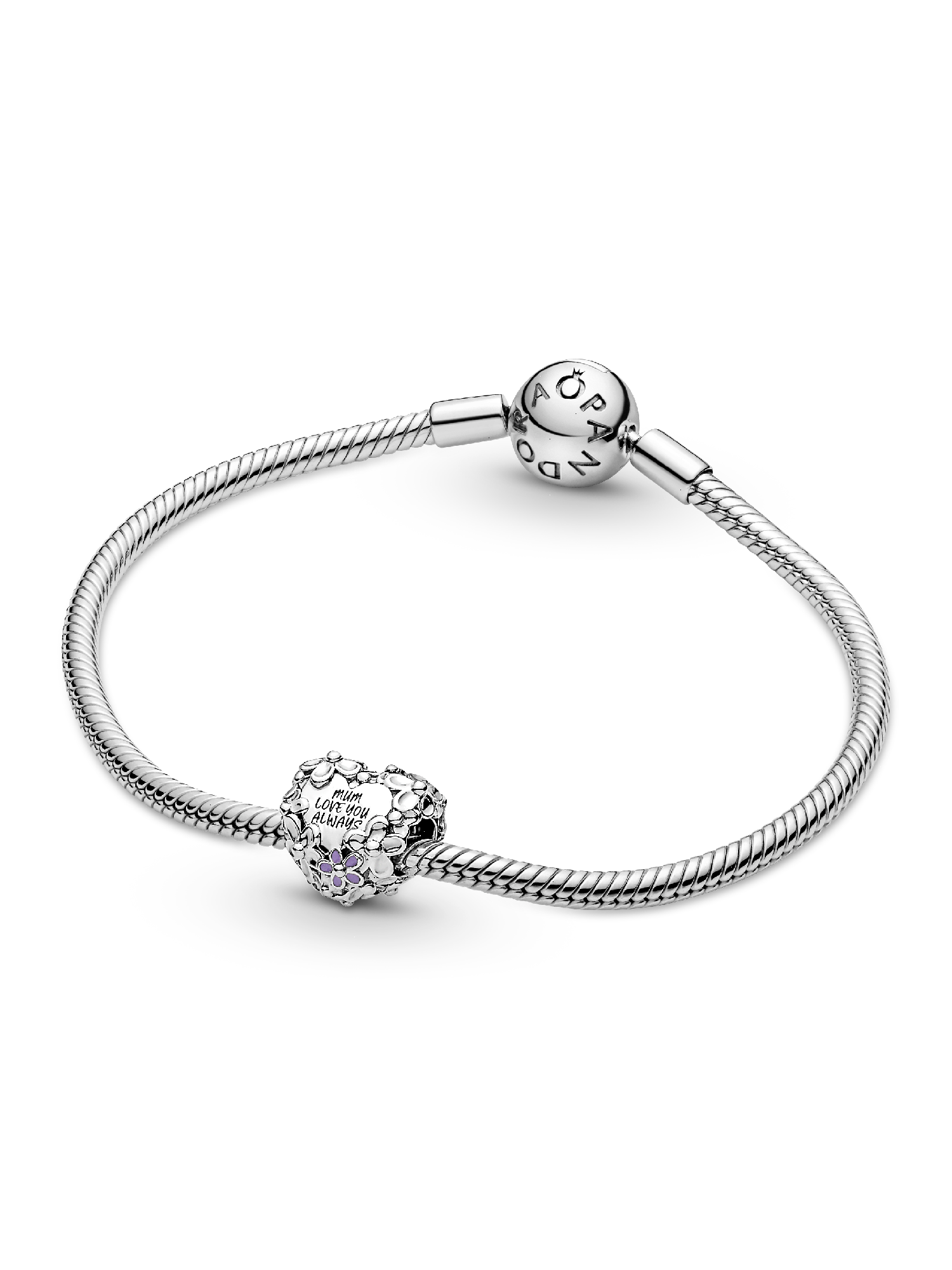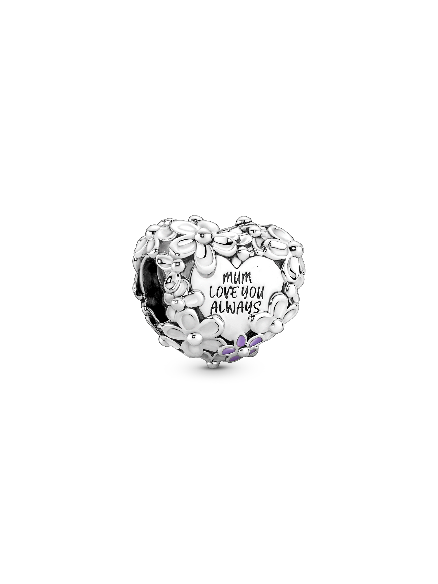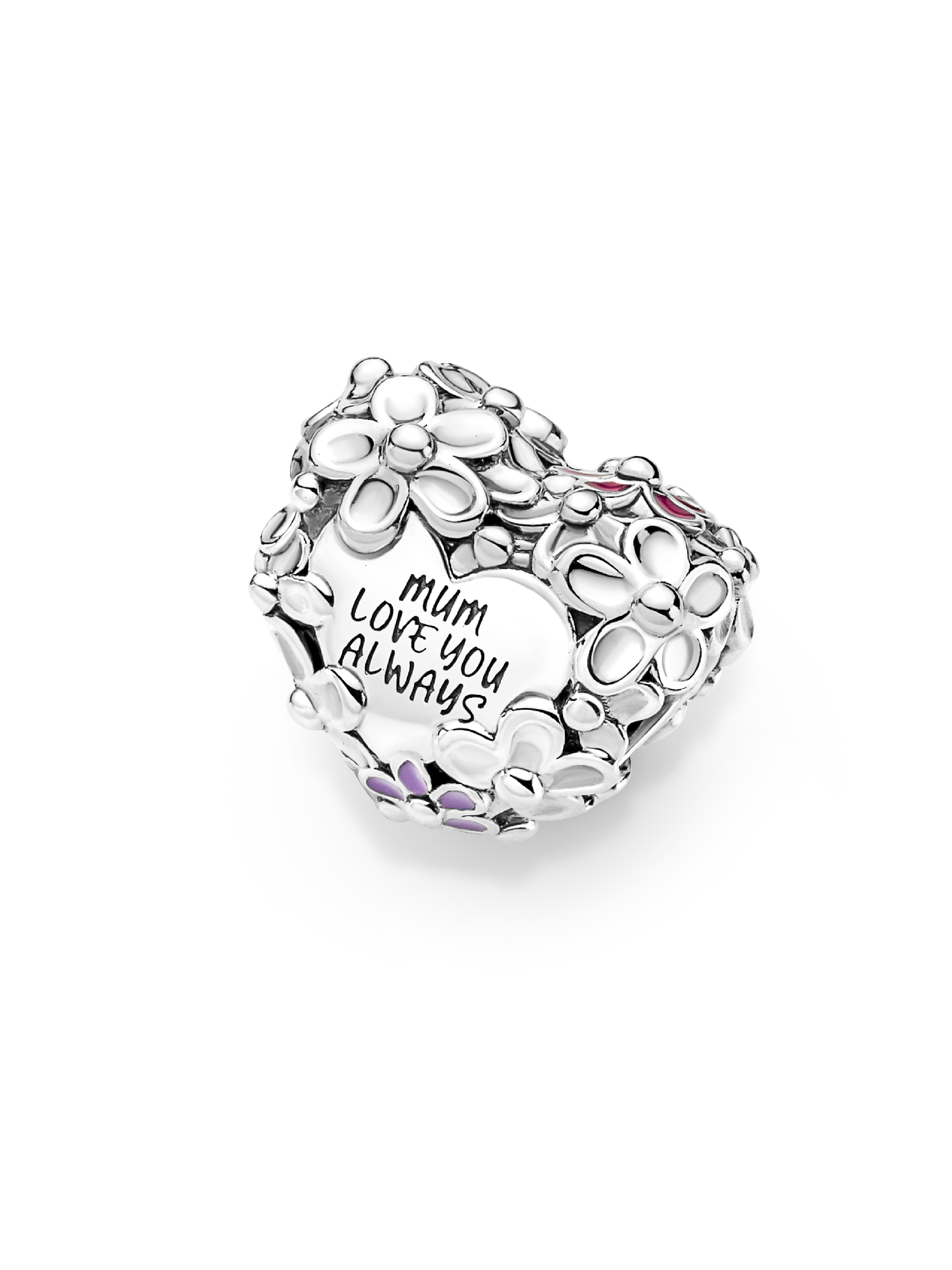 Give Mum flowers that last forever with the Mum Daisy Heart Charm. Crafted in sterling silver with pink and purple enamel, this charm is decorated with a wrapping of daisies to symbolize joy and abundance. The engraving reads "MUM LOVE YOU ALWAYS" – a heartfelt message to remind her of your bond.