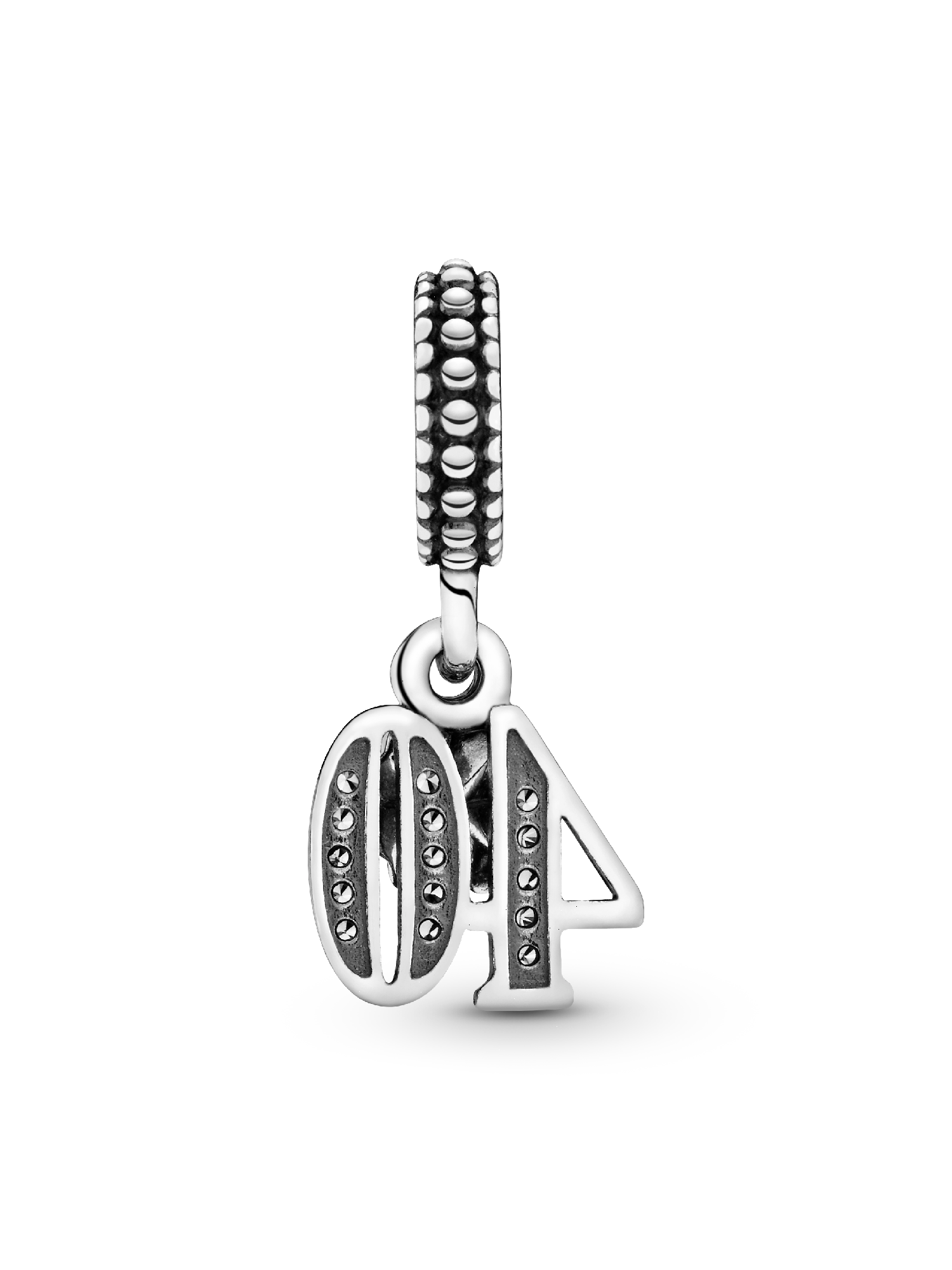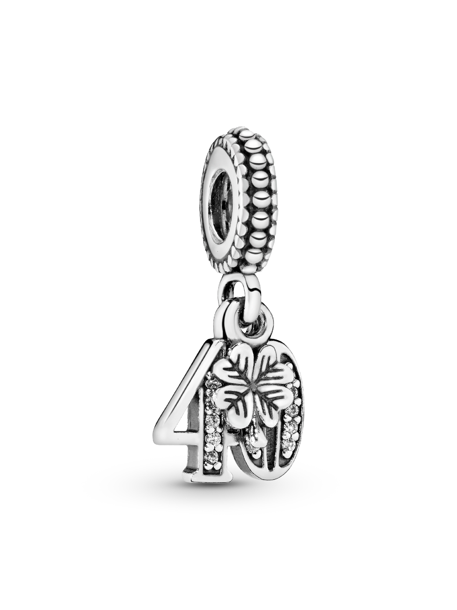 Made to celebrate a 40th anniversary or naughty forty birthday, this sterling silver dangle charm for Pandora Moments bracelets is accented with cubic zirconia and beaded details. It's finished with a miniature four-leaf clover dangle, to bring luck to the person who wears it.