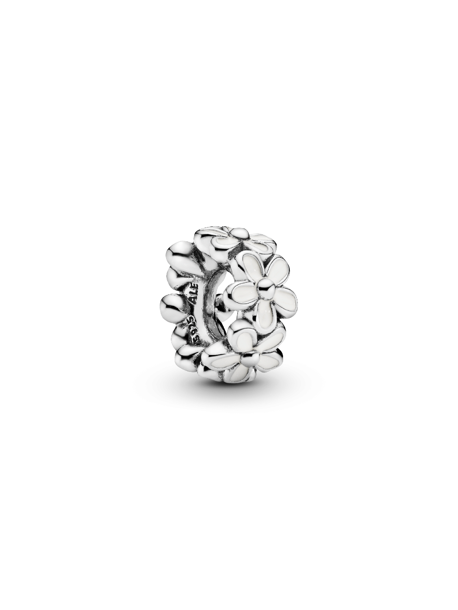 Daisies are a symbol of innocence and purity, freedom and fortitude. Encircled with white enamel daisies in a nod to the popular daisy chain, this pretty spacer charm in sterling silver lends natural appeal to your Pandora Moments bracelet. Add the simple design to your look to represent something you love.