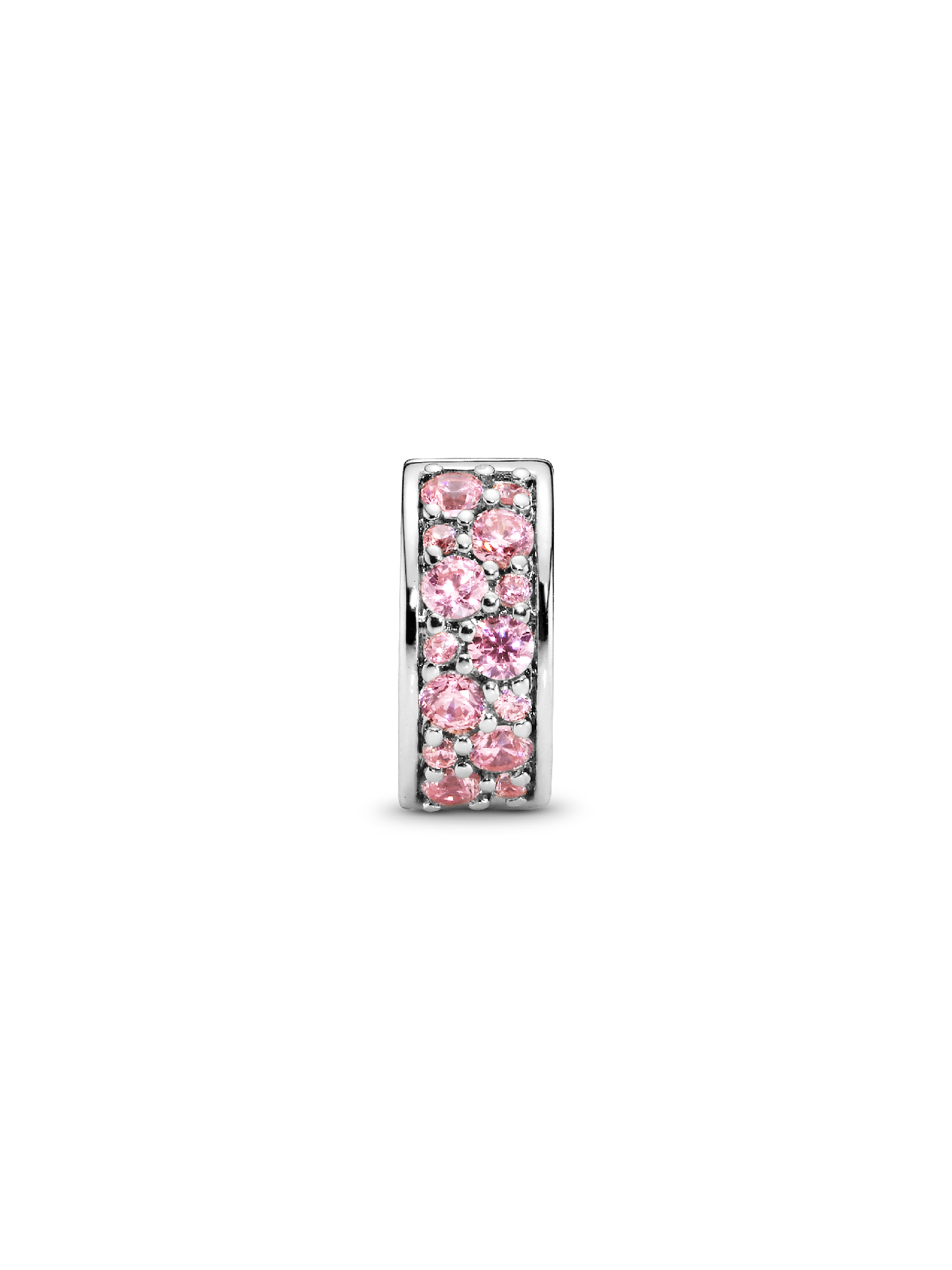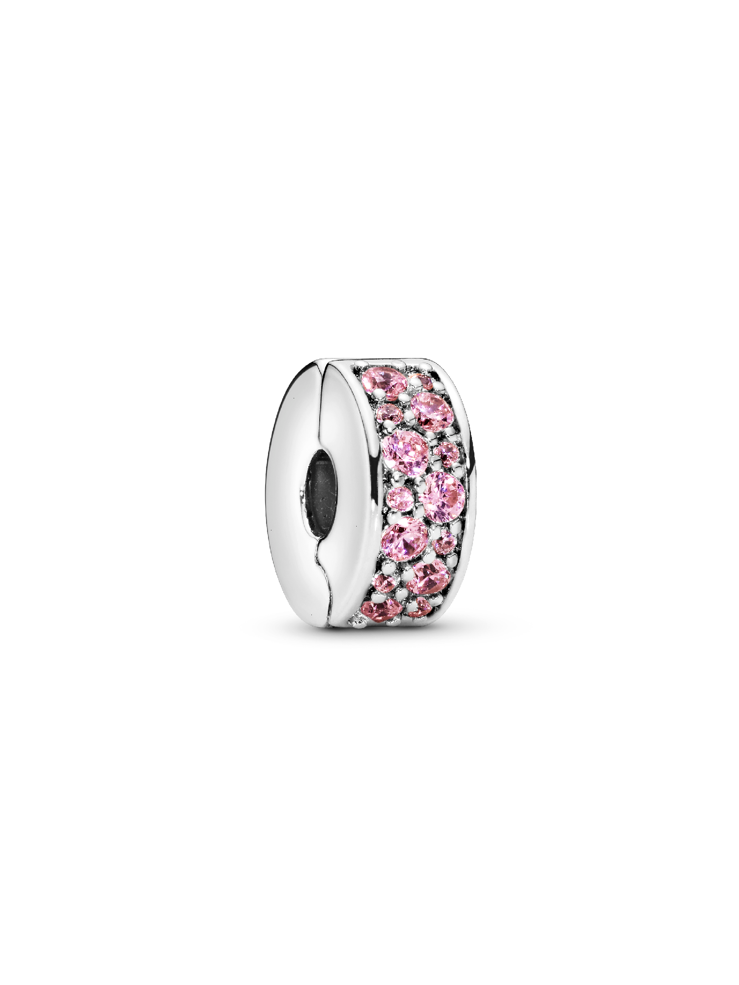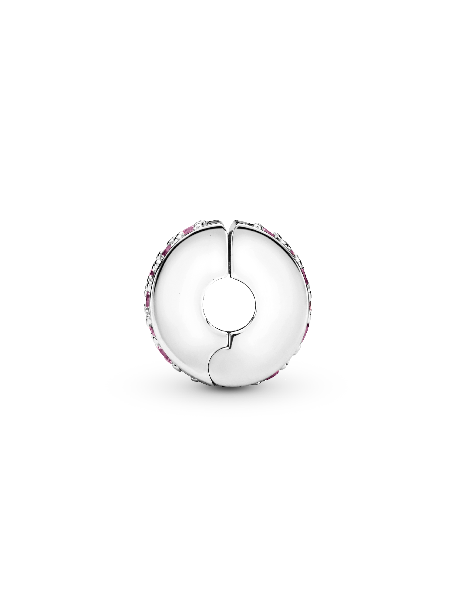 Add a touch of pink to your look with this hand-finished clip charm, pavé-set by hand with cubic zirconia. Made to be worn on any of the Pandora Moments bracelet styles the sterling silver charm brings balance to your look - clip it in place to create a symmetrical styling. The hidden silicone grip keeps it in place. This clip charm features a silicone grip, does not fit onto threads (two raised charm dividers.) This charm can be styled anywhere else on the bracelet.