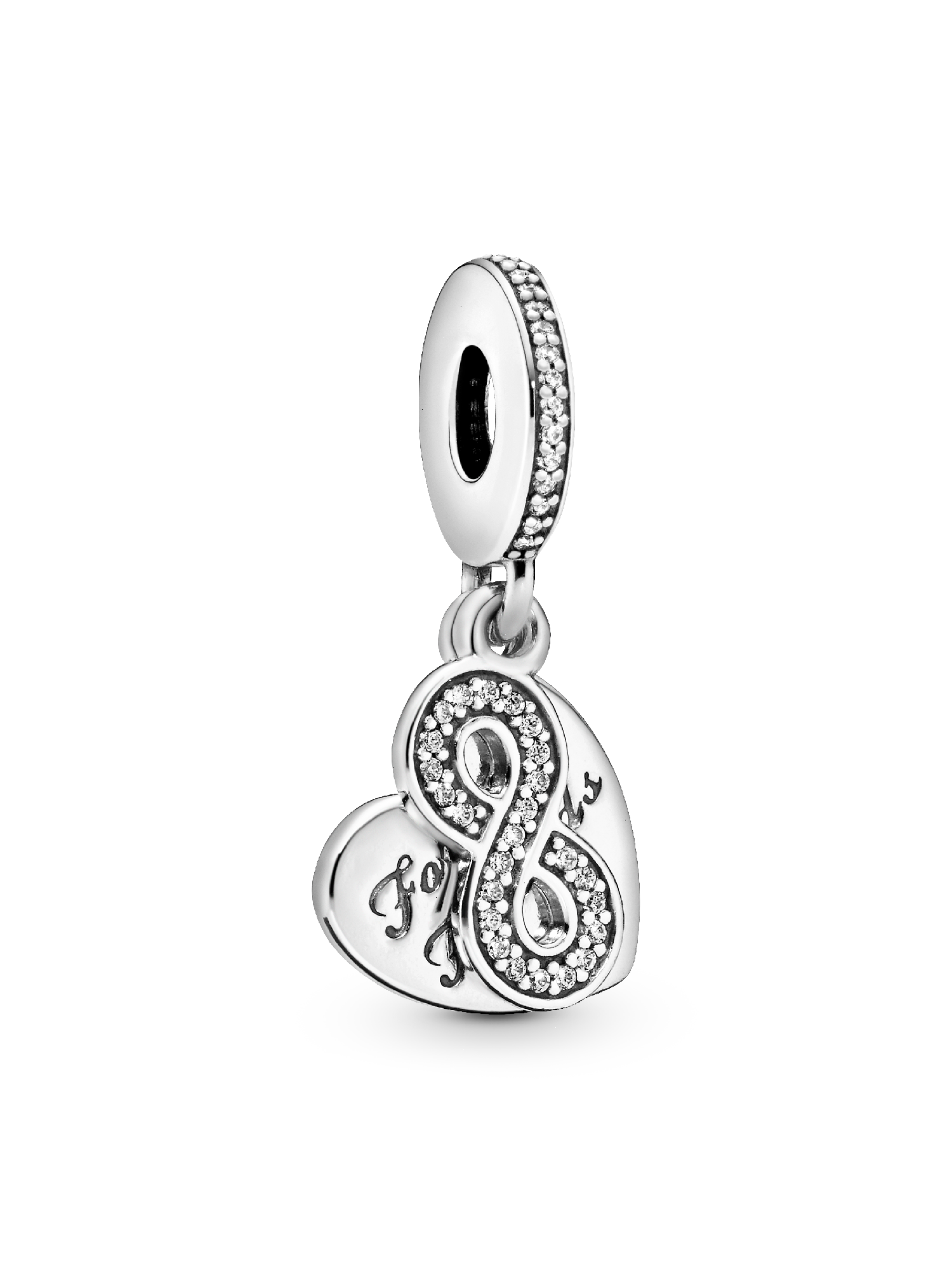 Wear or share this friendship charm to show that friends are forever – just like its engraving says. Cast from sterling silver, it's shaped into two dangles: a heart and a stone-studded infinity symbol for extra sparkle to the personal piece. It's made for our Pandora Moments charm bracelets, but looks equally cool as a necklace pendant.