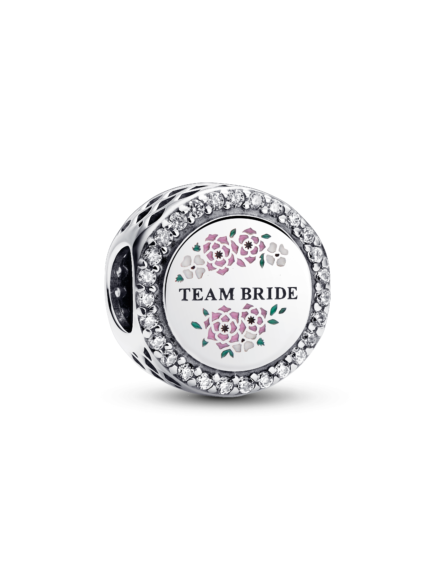 Say "I do" to the Engravable Team Bride Charm. Inspired by the unforgettable moments with your bridal squad, it's a perfect reminder of the love, laughter and unwavering support you share. Surrounded by sparkling rows of pavé, this meaningful piece features a flower motif crafted in vibrant enamel and a "Team Bride" engraving. The opposite side is your canvas to make it truly personal.