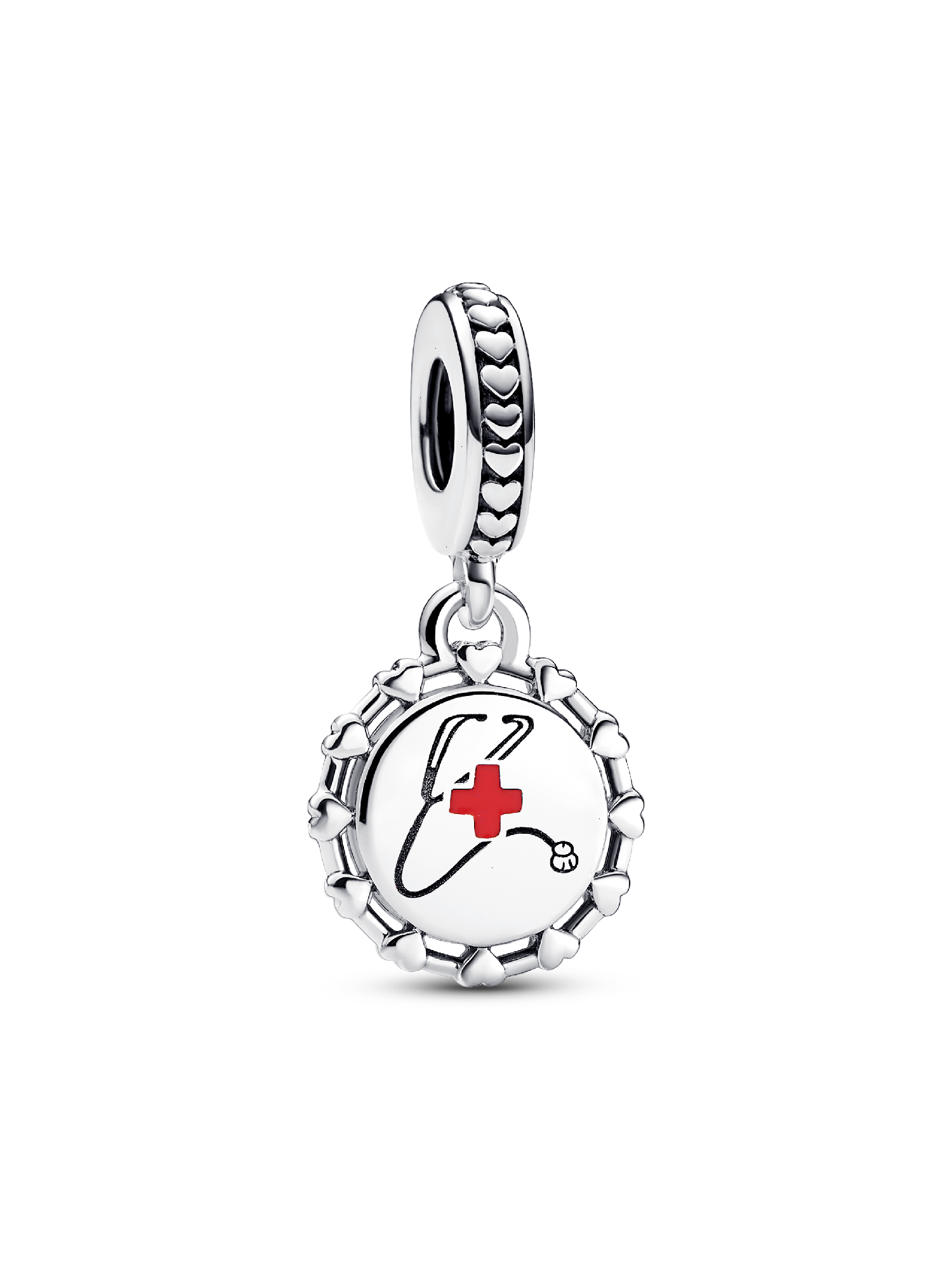 The Stethoscope Engravable Dangle Charm is a tribute to the meaningful and life-saving work of doctors, nurses and medical staff around the world. Crafted from sterling silver, this disc-shaped charm features a stethoscope and red cross motif on one side with enamel details. The other side is blank for your own engraving, and a pattern of hearts adds detail around the edges and bail. A meaningful gift for a loved one in the medical professions.