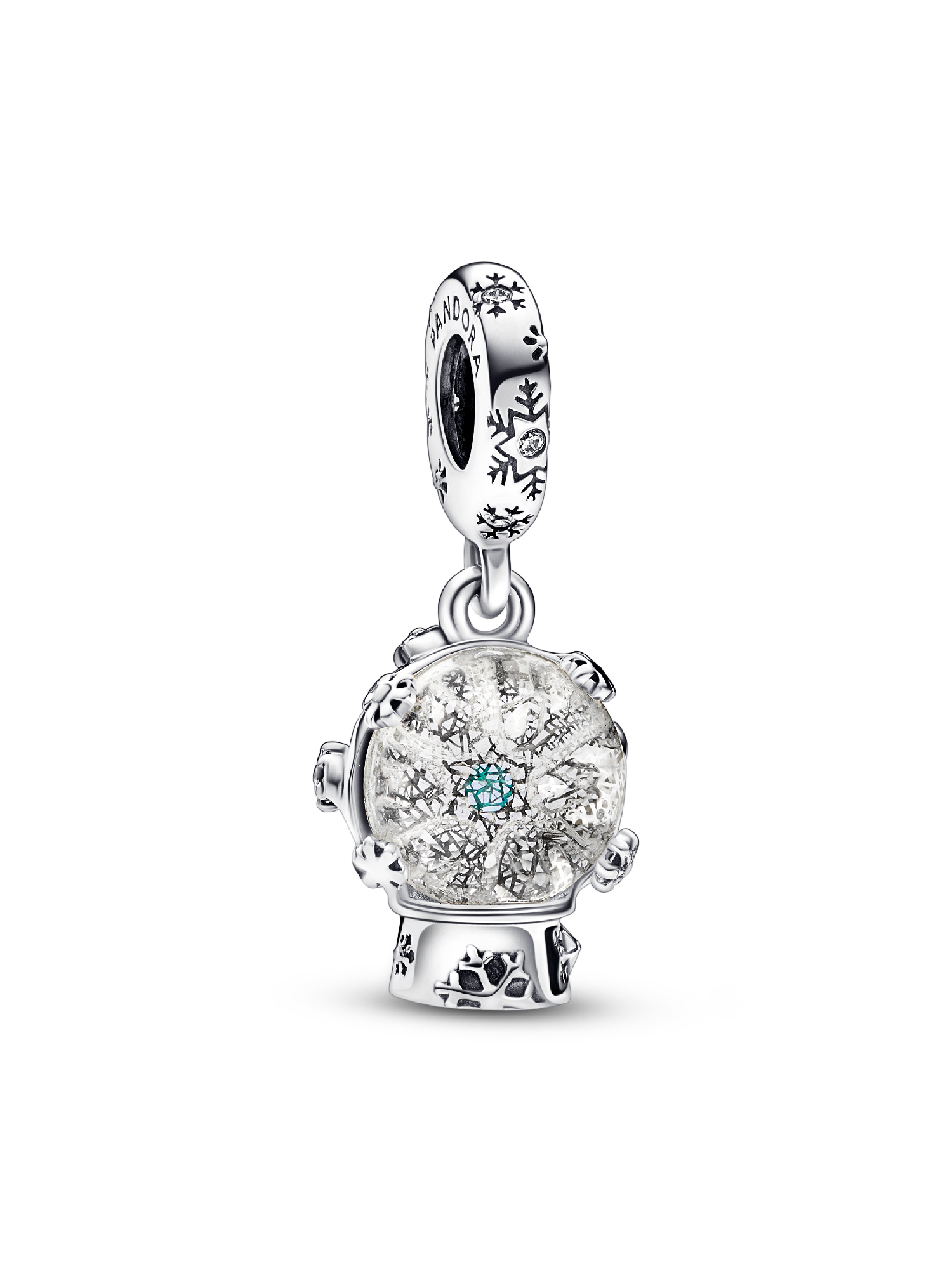 Capture a piece of holiday magic with this Snowflake Snow Globe Dangle Charm. Crafted from sterling silver and Murano glass, this charm features a snowflake motif surrounded by glitter and set within a glass ball, which creates a special, magical feeling. The intricate design requires high levels of craftsmanship to create, as it features lots of details including grooved and raised snowflake shapes on the base, scattered across the snow globe and along the bail. Turn the charm over to find the message "One in a Million" engraved on the base. A special gift for a loved one or a magical addition to your jewelry styling.