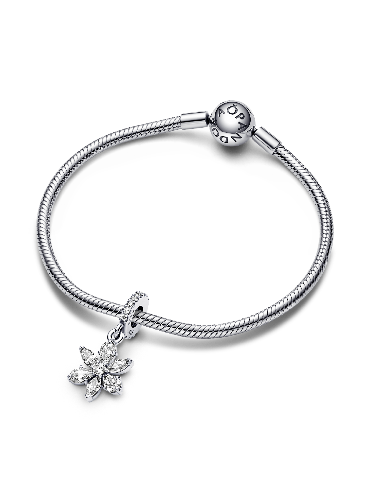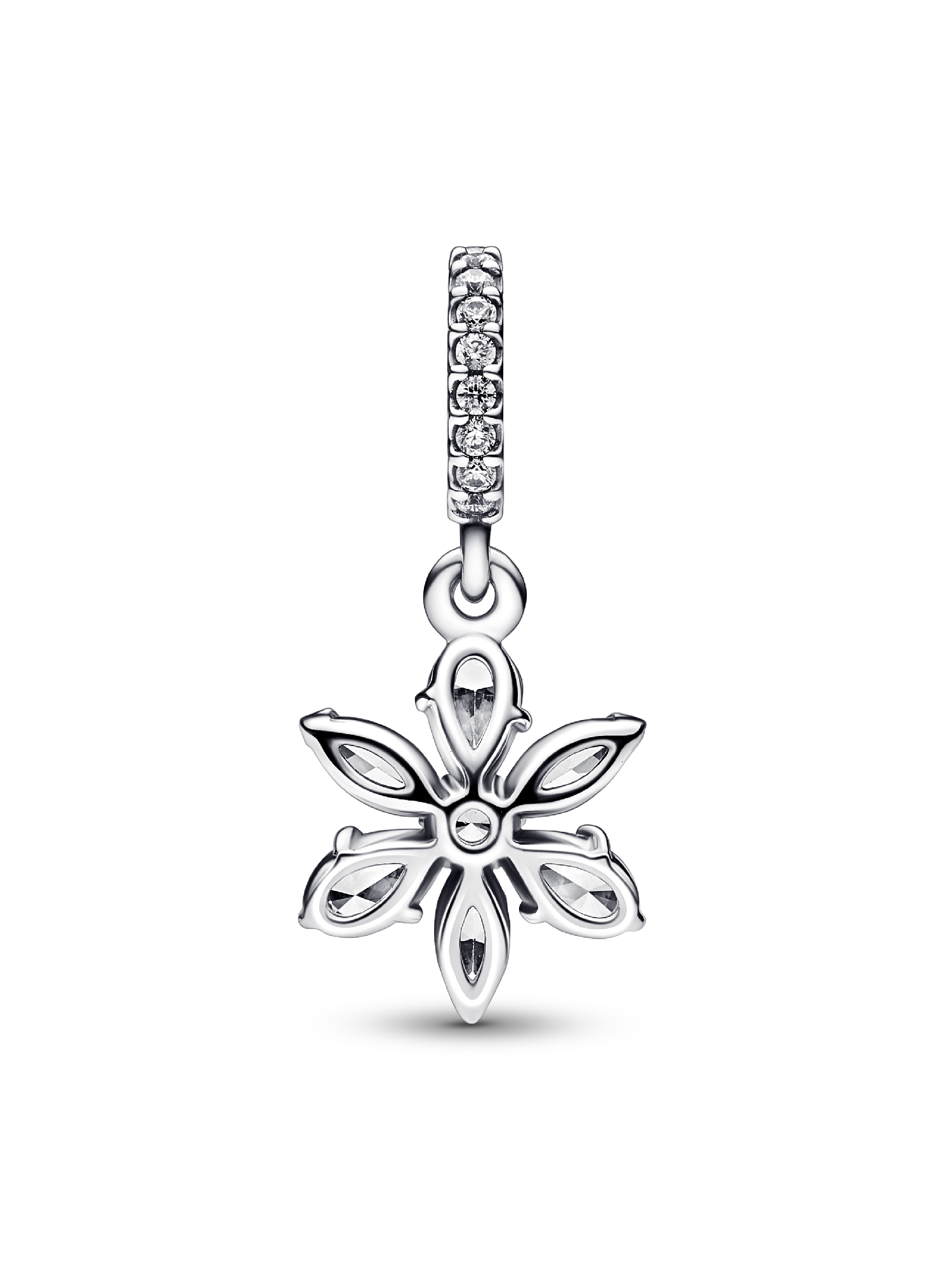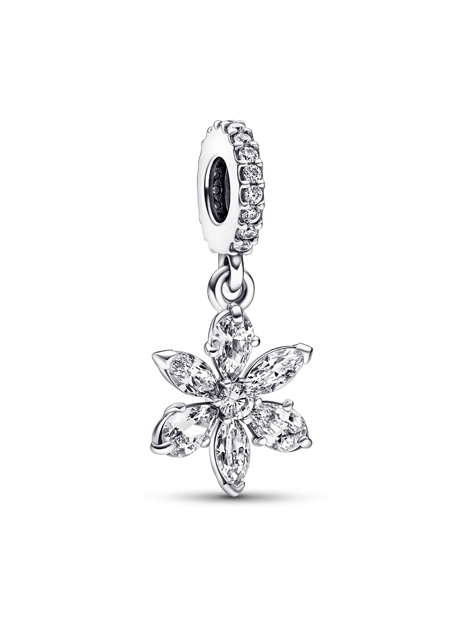 Bring the beauty of nature to your jewelry with the Sparkling Herbarium Cluster Dangle Charm. This sterling silver dangle charm features a cluster of alternating pear and marquise-shaped stones around a round center stone, forming a geometric shape inspired by petal and leaf elements. An elegant reinterpretation of the shapes we find in nature, perfect to bring a delicate, floating feel to your bracelet, necklace or earrings.