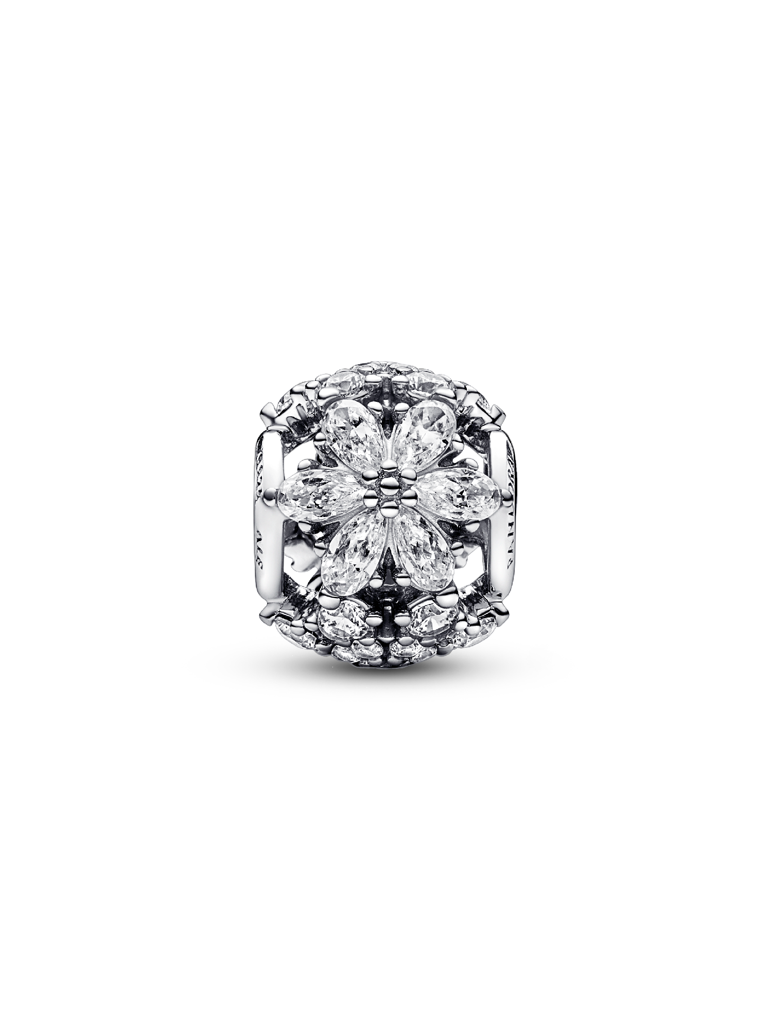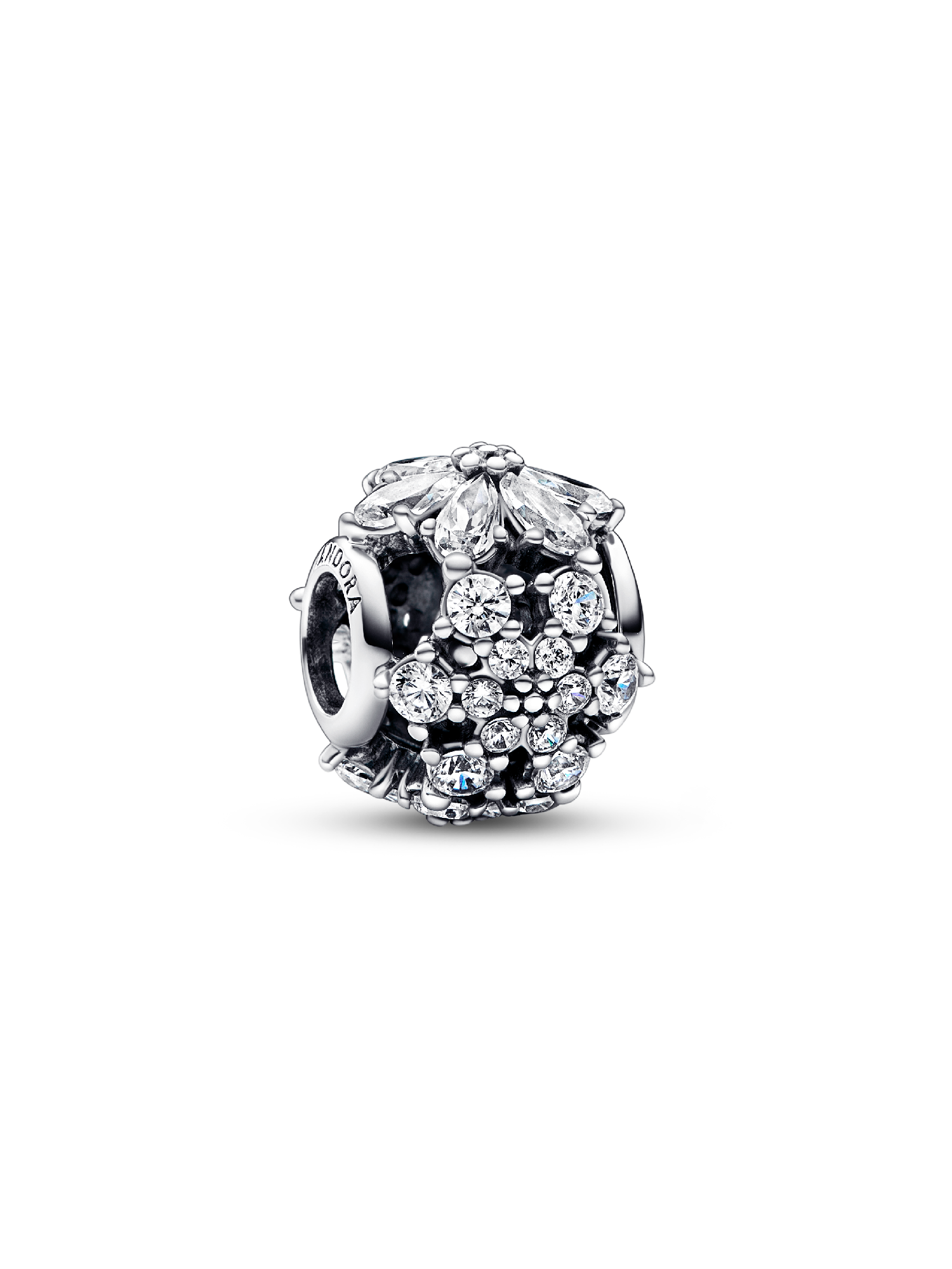 Bring the beauty of nature to your jewelry with the Sparkling Herbarium Cluster Round Charm. This sterling silver charm is composed of four clusters of clear cubic zirconia stones forming a spherical shape. The clusters alternate between two subtly different designs, composed of round or pear-shaped stones with a cluster of microbeads at the center. An elegant reinterpretation of how nature forms beautiful shapes with petal and leaf-inspired elements.