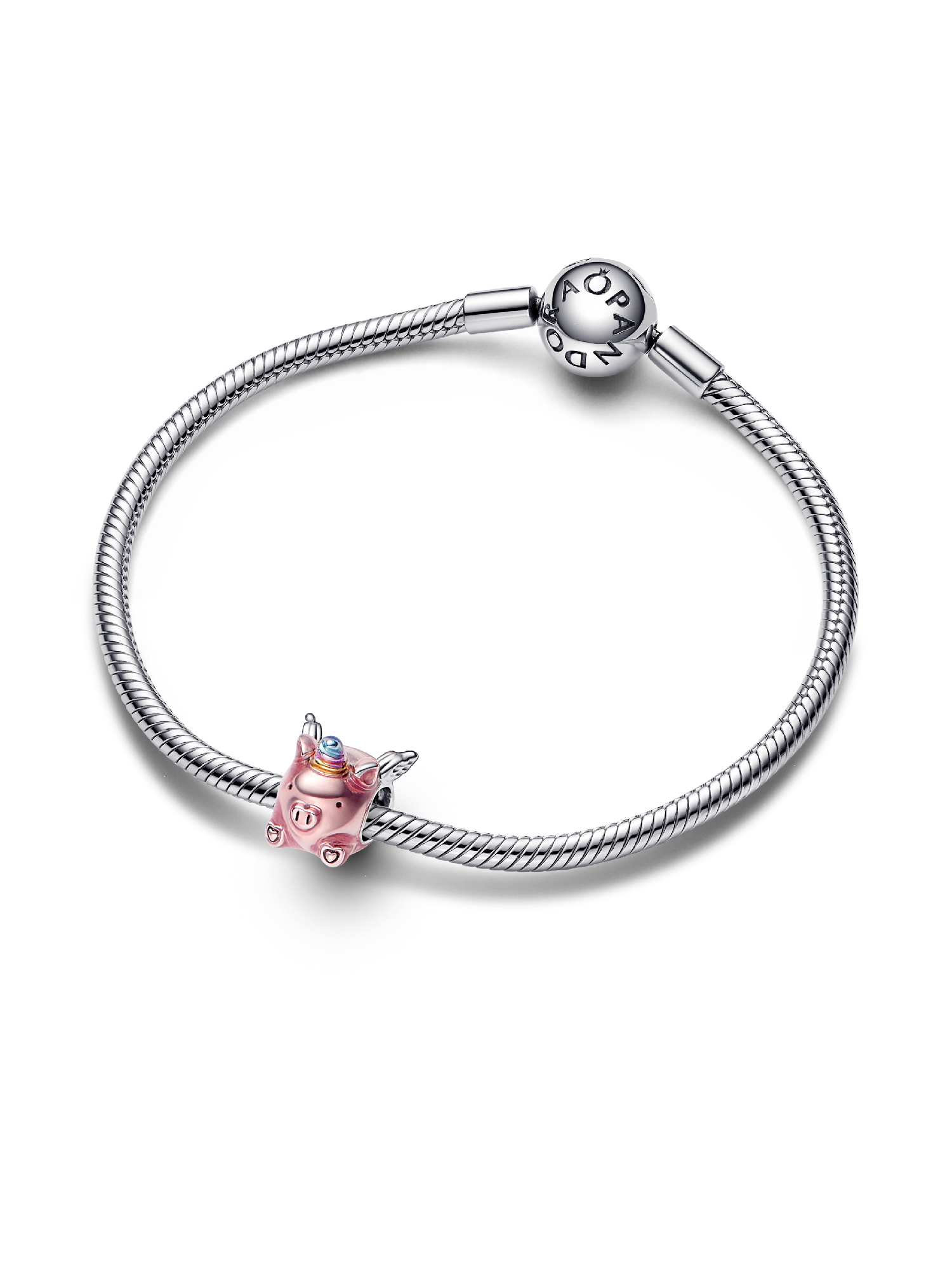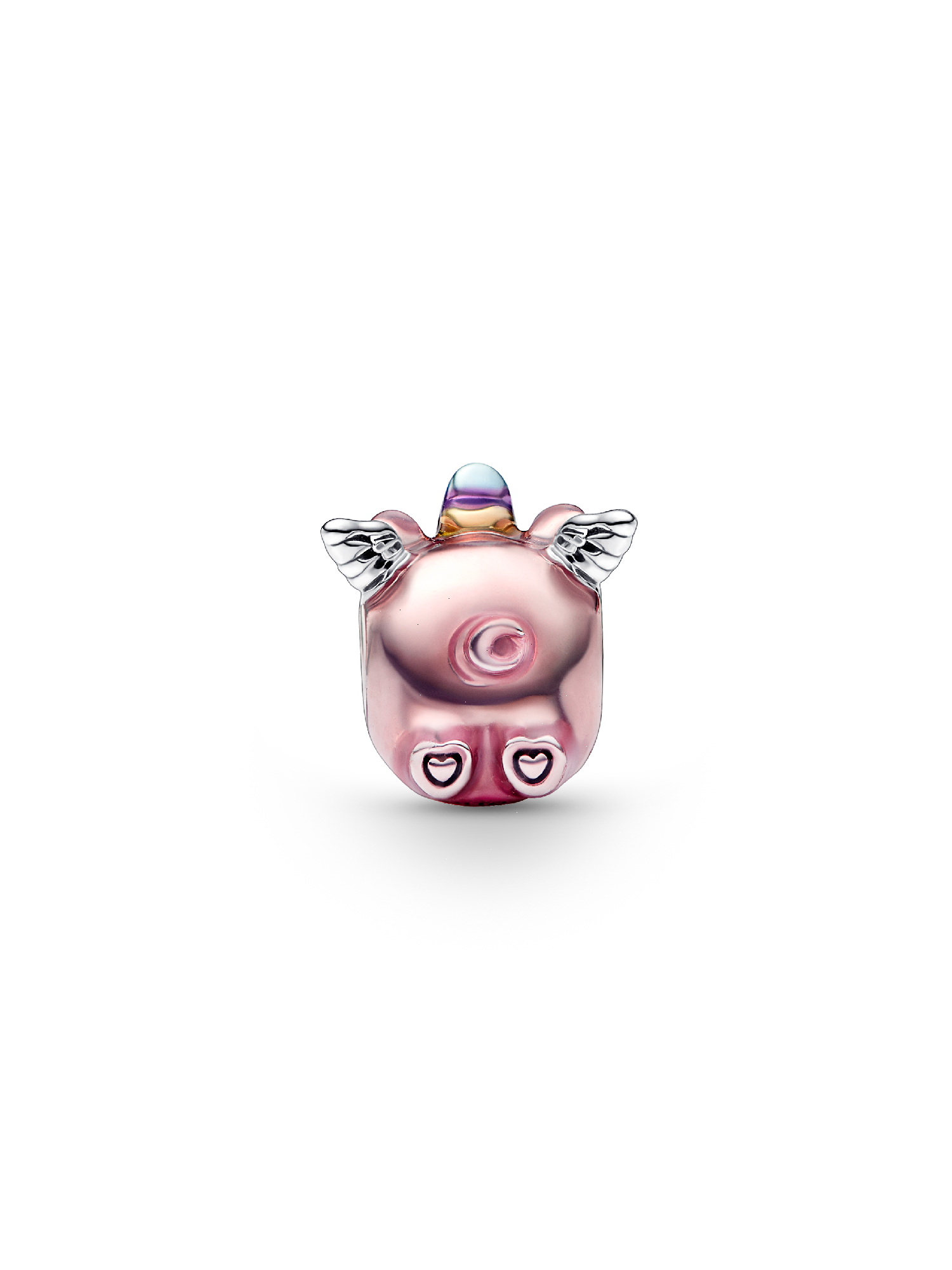 Defy the odds with our Flying Unicorn Pig Charm. Hand-finished in sterling silver coated with transparent pink enamel, this charm features a pig poised to take flight. It is detailed with a spiralling rainbow enamel horn, grooved wings, raised hearts on all four feet and a curly tail. Engraved with "Nothing is impossible" on its stomach, wear this persistent pig as a reminder that you can do anything if you just believe.