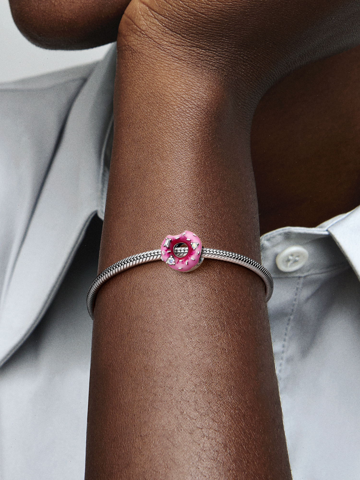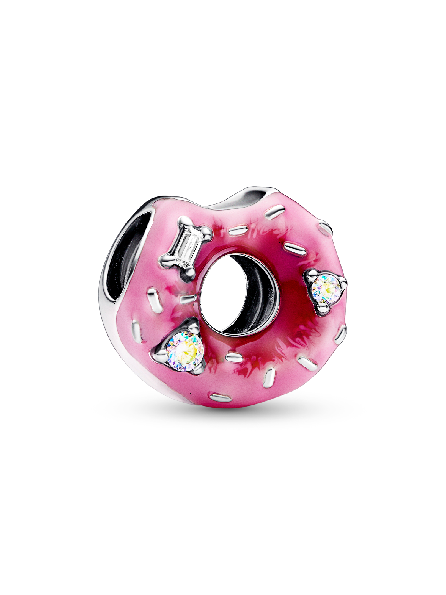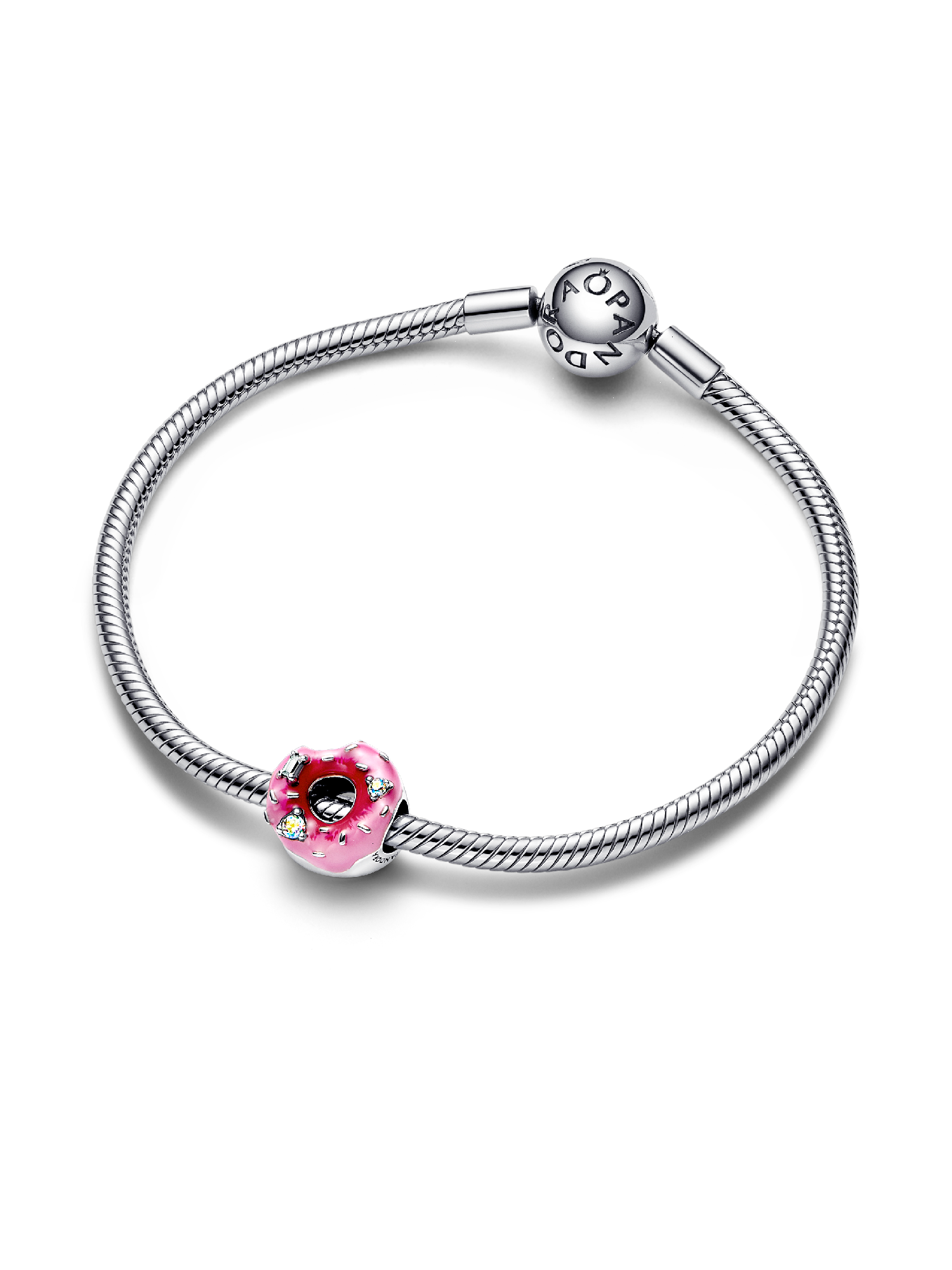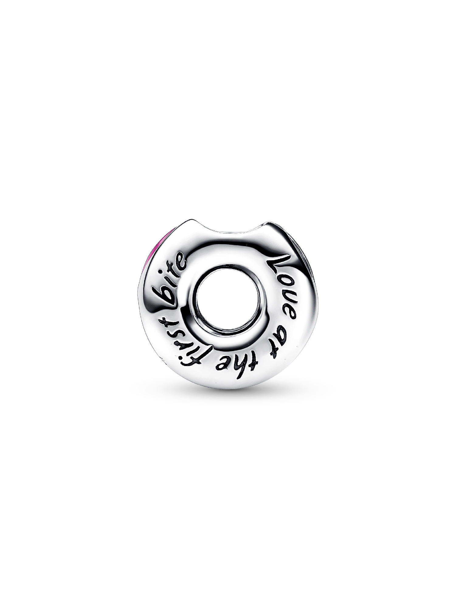 A jewelry gift as sweet as your love. The Sparkling Sprinkled Donut Charm is inspired by a universe of pop art and saturated candy colours. This playful yet modern charm takes the shape of a donut in sterling silver, complete with hand-applied pink gradient enamel frosting and a bite taken out of one side (who can resist a delicious donut?). The frosting is topped with polished silver sprinkles, one clear cubic zirconia and two Aurora Borealis cubic zirconia - shimmering with clear, pink and blue tones depending on how the light hits. The back is engraved with the words "Love at the first bite." An irresistible treat to add to your favourite Pandora jewellery.