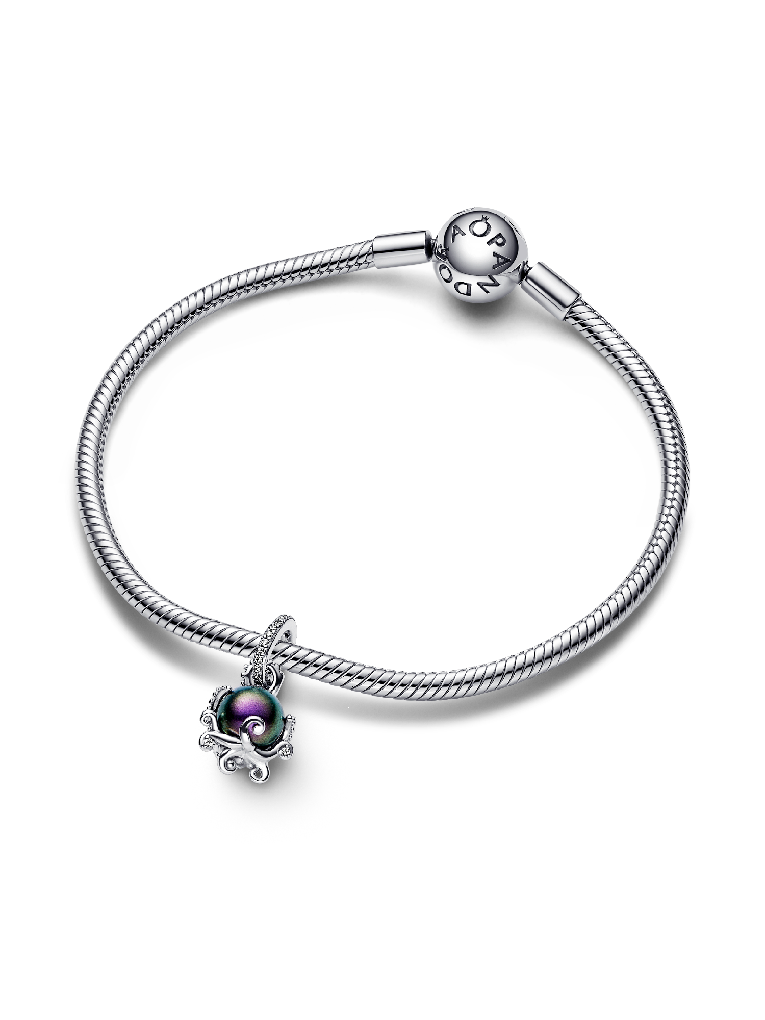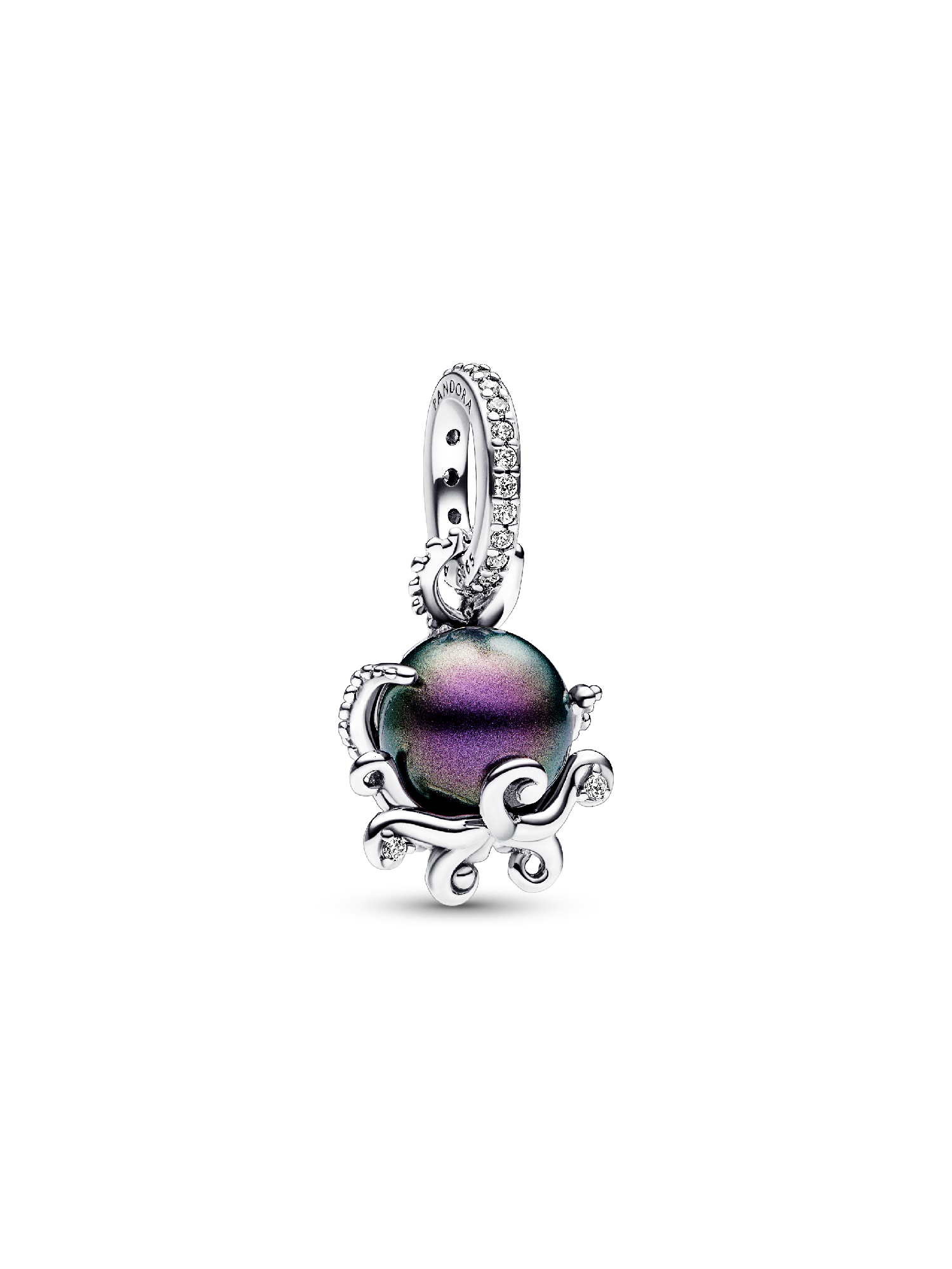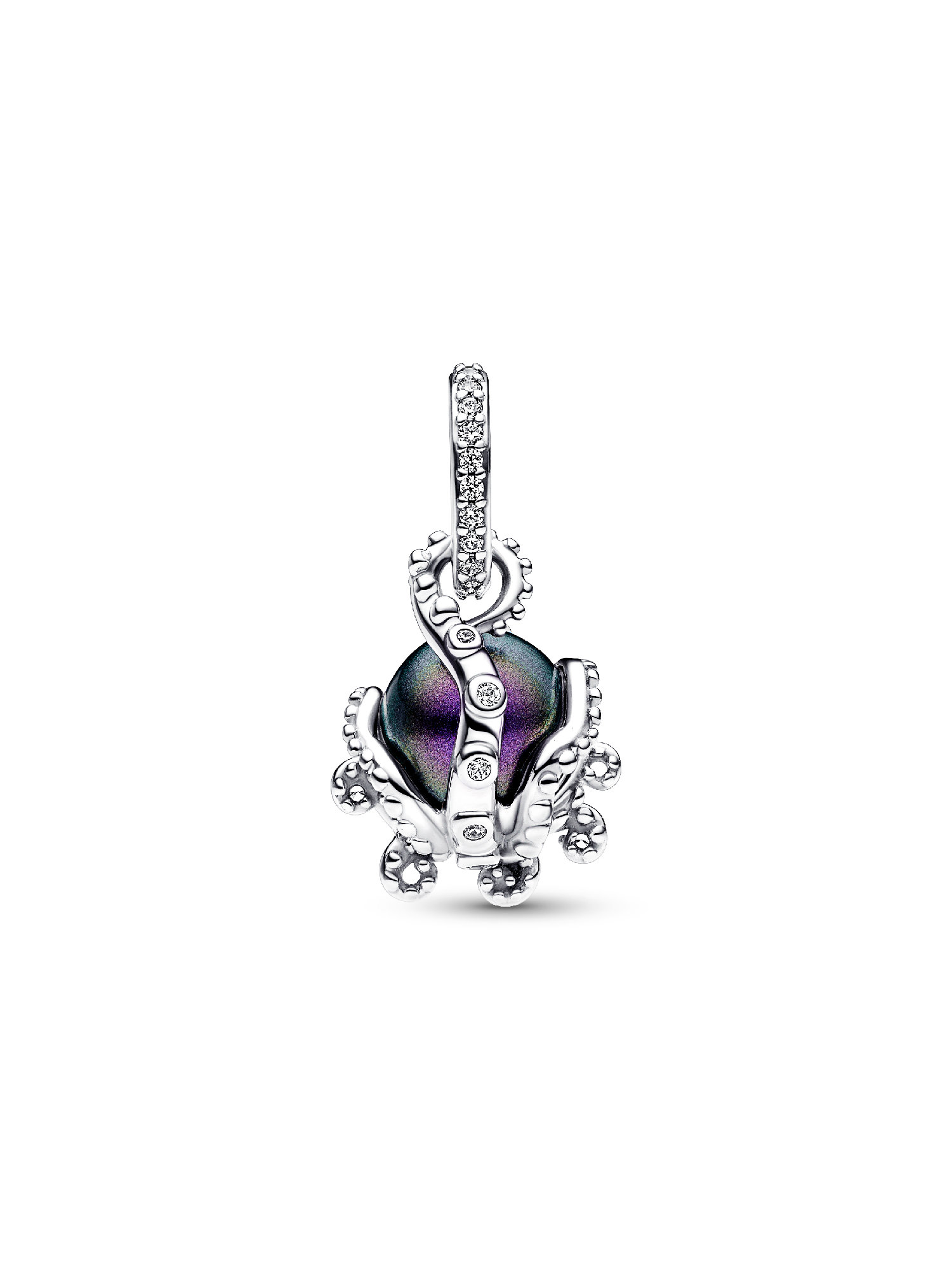 Channel the deepest corners of the ocean with our Disney The Little Mermaid Ursula Dangle Charm. Inspired by the mysterious power of Ursula, this charm captivates with a luminous purple lacquered artificial pearl encased in sterling silver tentacles. Sparkling stones on the tentacles and a pavé-covered bail catch the light like the sun reflecting off the waves.