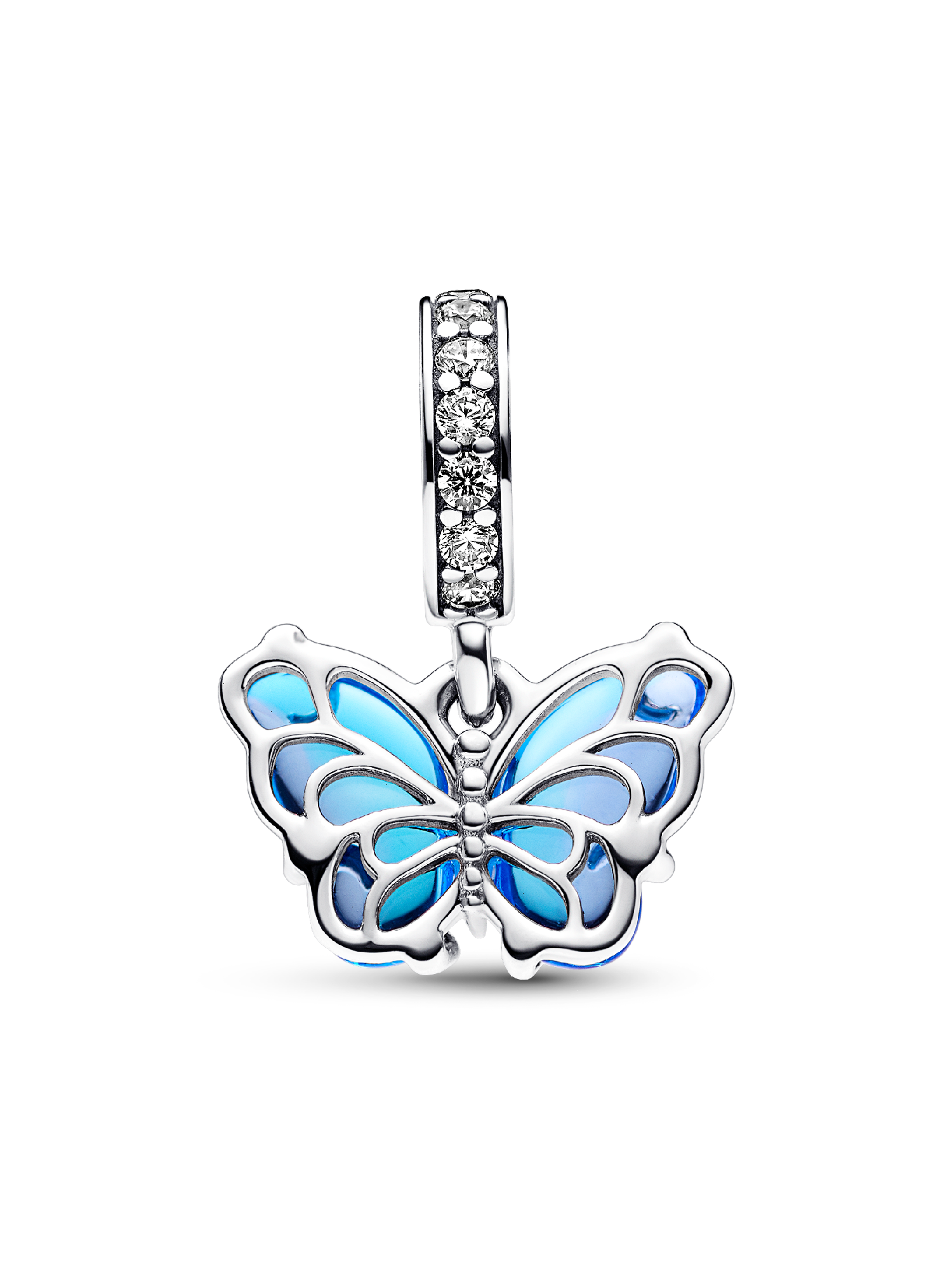 Transform into your best self with the Blue Murano Glass Butterfly Dangle Charm. This hand-finished sterling silver charm features Murano glass wings in a bicolored blue gradient with a cut-out sterling silver pattern on the back that shows through the glass, and sterling silver swirls on the front. Microbeads on the butterfly's body and pavé on the bail add a touch of delicate detail and sparkle. Add this blue butterfly to your styling as a powerful symbol of hope, transformation and new beginnings.