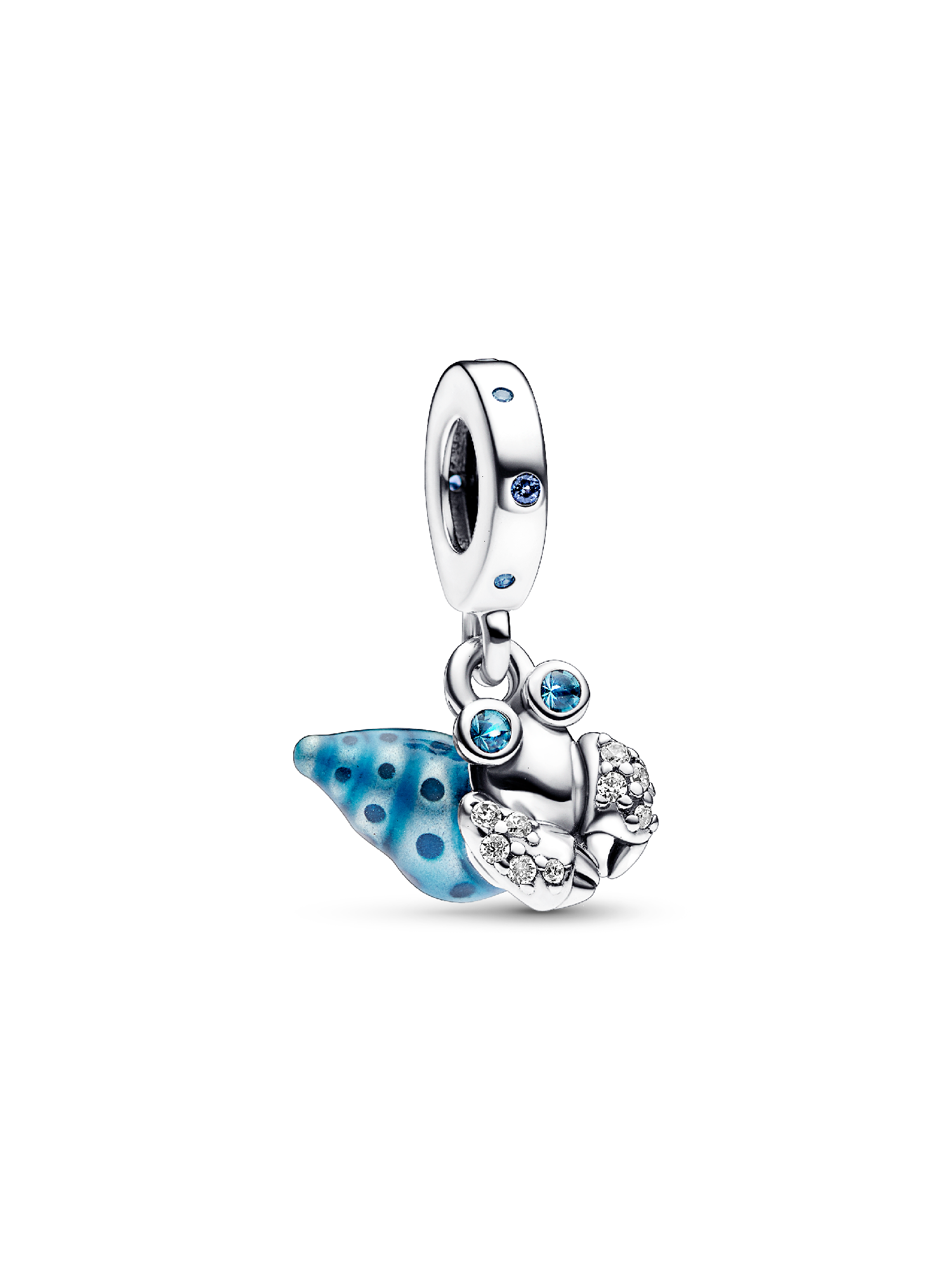 Home is a feeling you carry with you - just ask our little hermit crab. The Glow-in-the-dark Hermit Crab Dangle Charm is crafted from sterling silver and features a cute hermit crab with realistic details and a spiral shell with hand-applied spotted blue enamel that glows green in the dark. Sparkling stones on the eyes, claws and bail bring the charm to life. Hermit crabs find a shell to call home, and when they outgrow the shell, they relocate to a new one. Wear this charm as a symbol of the comfort and safety of home and our ability to carry that feeling with us as we change and grow.