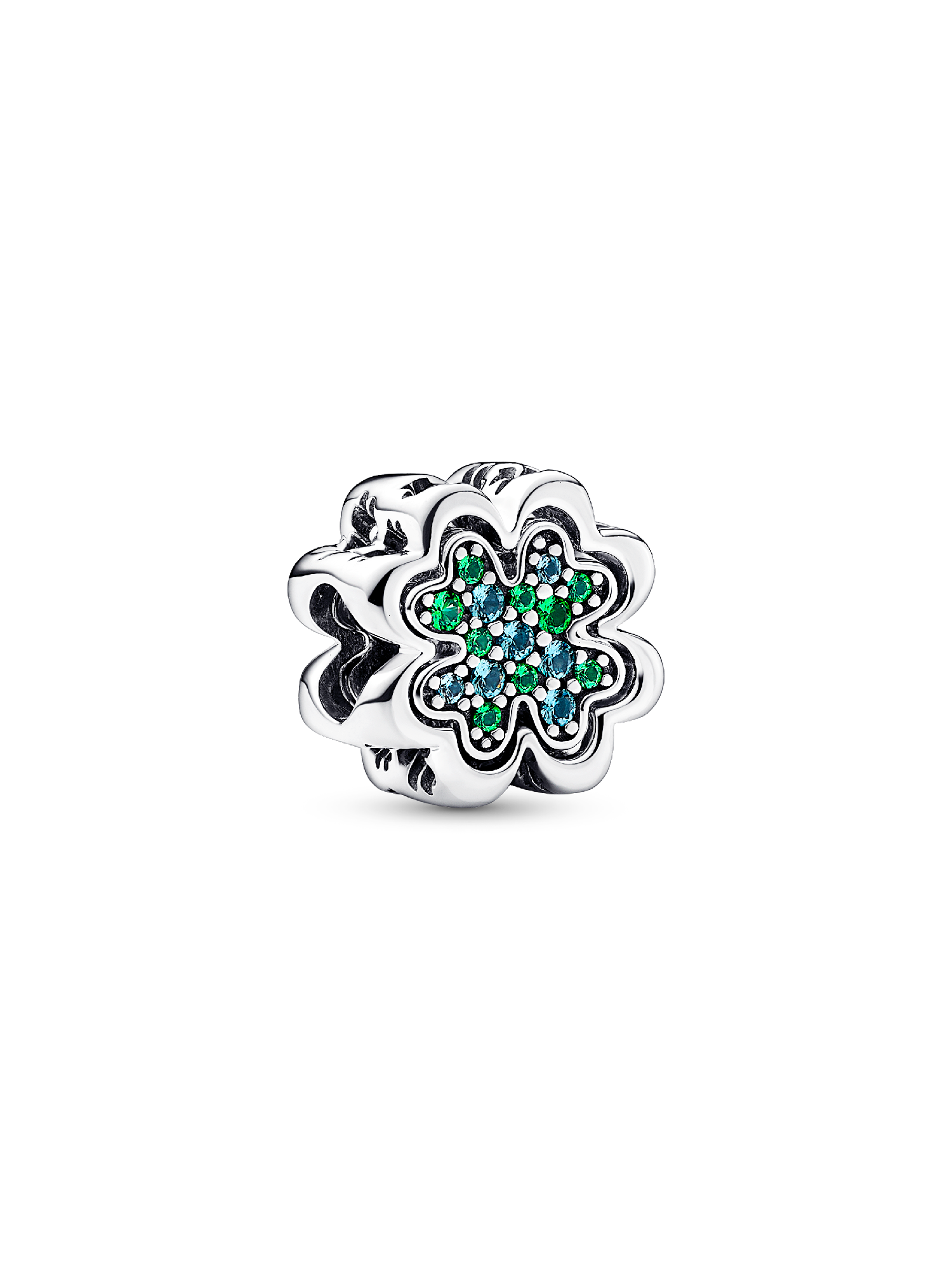 Bring in double the luck with the Splittable Four-leaf Clover Charm. This four leaf-clover shaped sterling silver charm packs more than meets the eye, as its inner clover is splittable from its outer shell and can be worn as a whole separate charm of its own, making it the ideal piece to gift to someone close that needs a little extra luck. The inner clover features the engraving "True friends are a rare gift" on its back and "Lucky to have you" on its side, heart-shaped leaves as well as green man-made crystals in two different tones. This Pandora Moments charm is filled with positivity and symbolism that stands for faith, hope, love and luck - and who doesn't want that!
