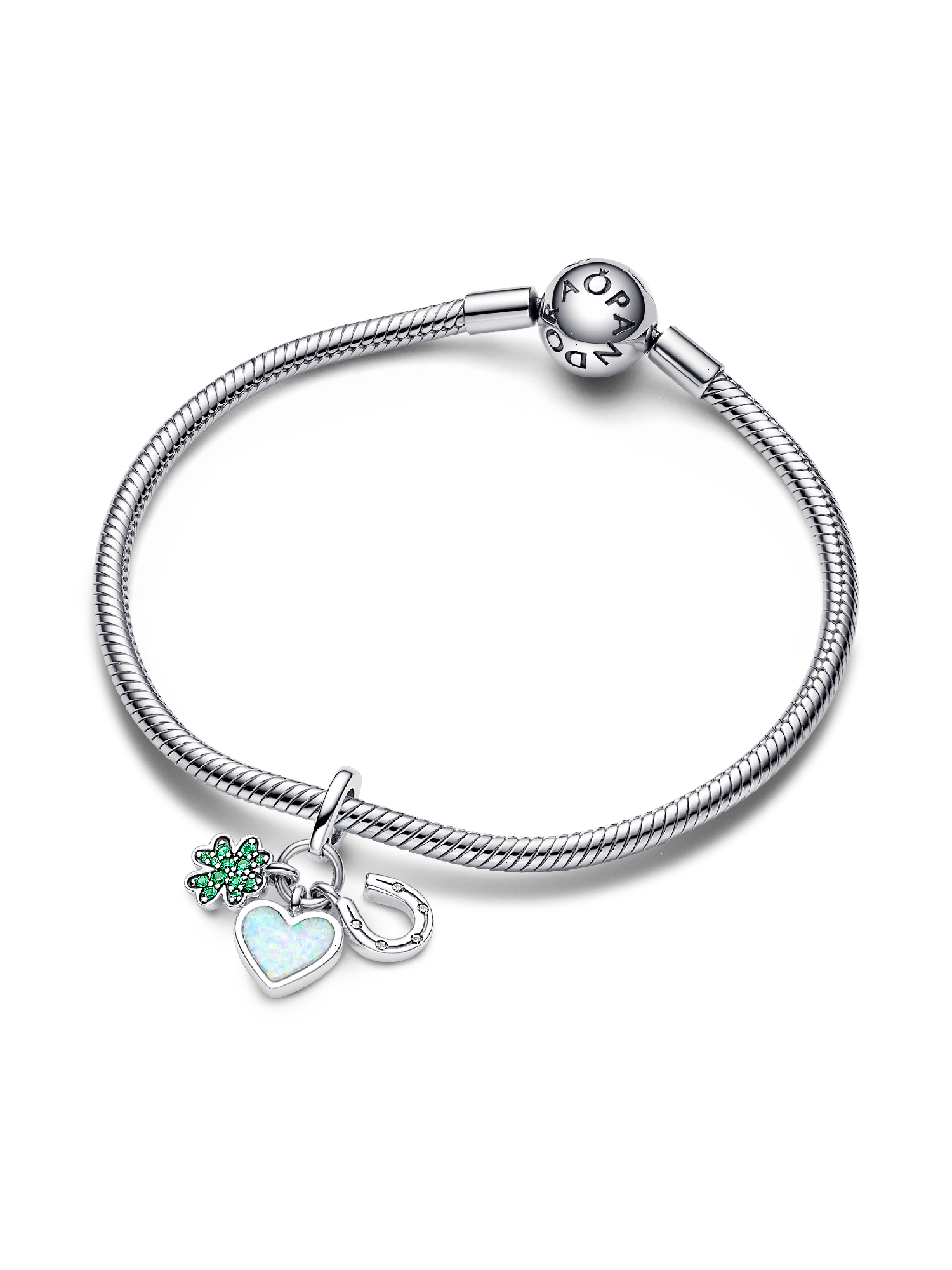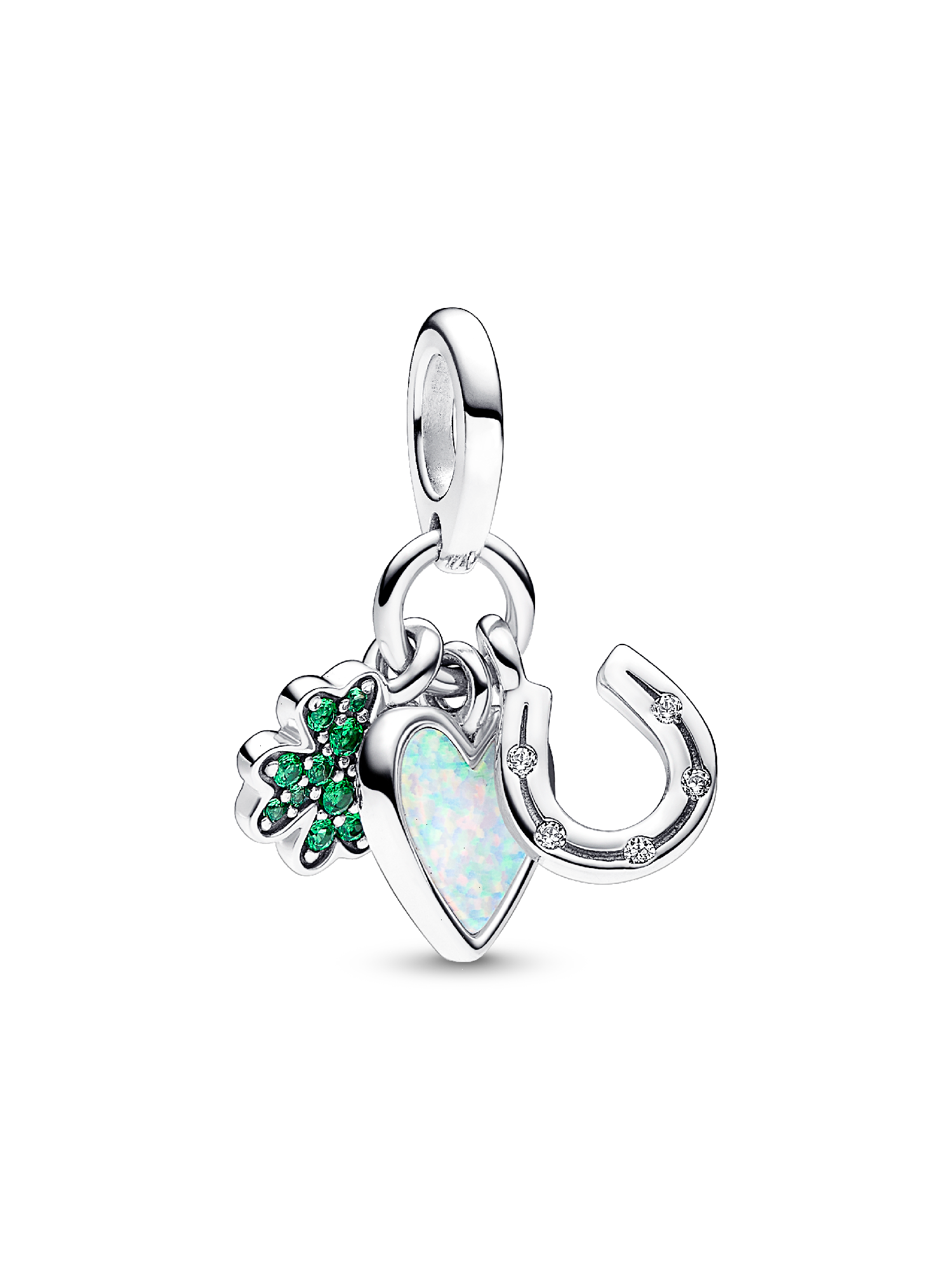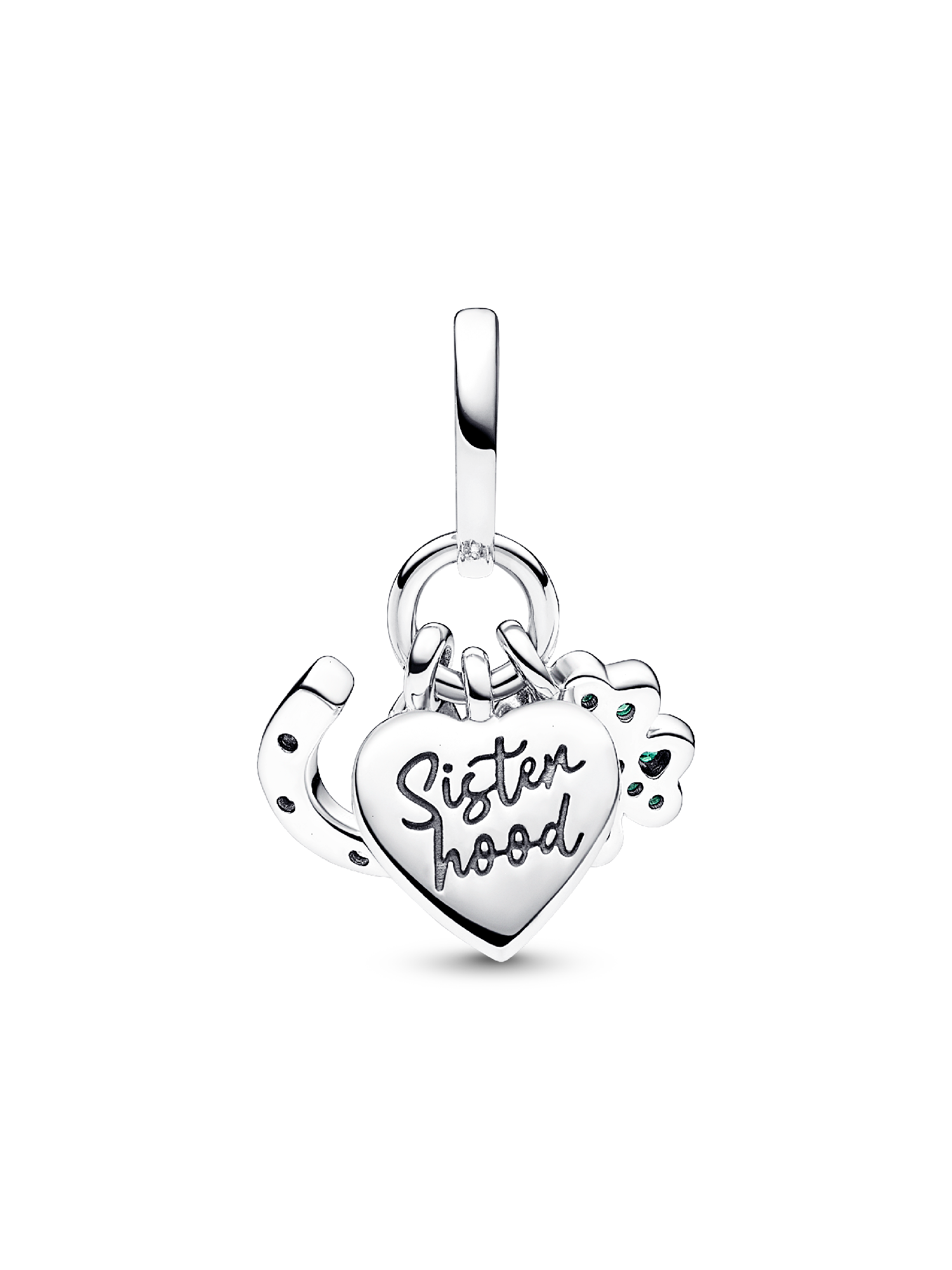 Keep luck close with the Four-leaf Clover, Heart and Horseshoe Triple Dangle Charm. This sterling silver dangle charm features three different symbols of good fortune including a four-leaf clover, a heart and a horseshoe. The heart is engraved with the word "Sisterhood". The horseshoe sparkles with clear cubic zirconia, the heart glistens with a white lab-created opal and the clover features royal green crystals. Wear this Pandora Moments charm as a symbol of good luck and protection or gift it to someone you care about deeply