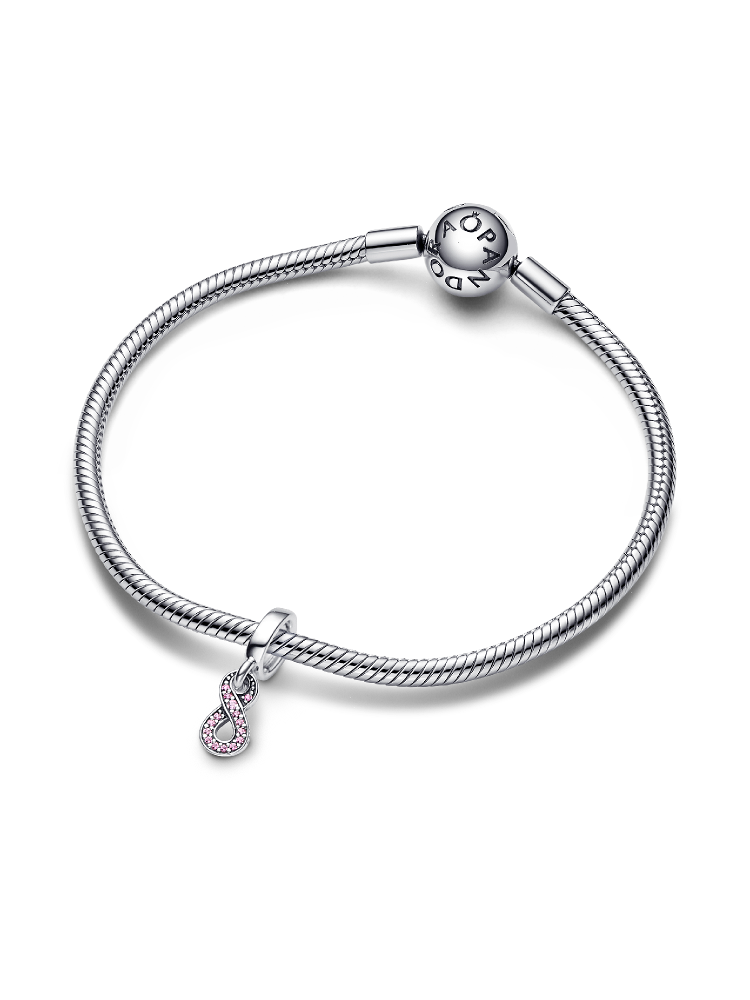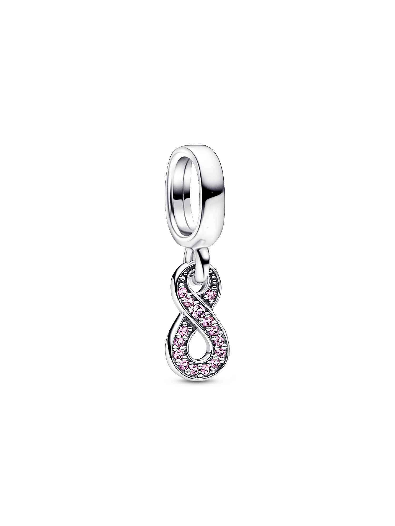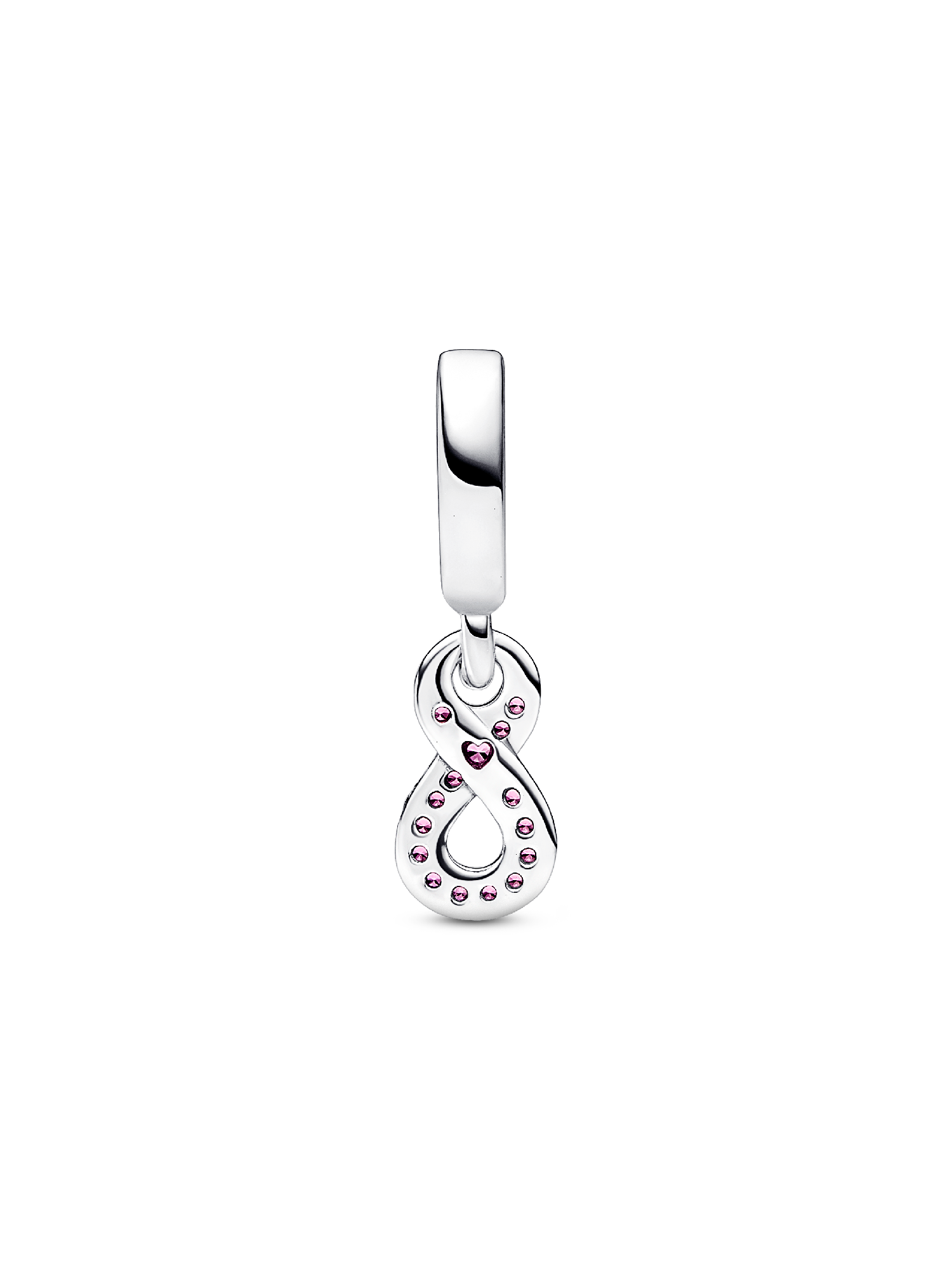 Show your love spans to infinity and beyond with the Sparkling Infinity Dangle Charm. The ultimate symbol of everlasting connection, the infinity symbol has been reimagined in a slightly asymmetrical shape featuring pink sparkle on its front side. Attached to the bail at the top with its smaller loop, this infinity charm features a heart shape cut-out on the back where its parts overlap. Gift it to a friend of a family member to let them know your bond will last forever and beyond