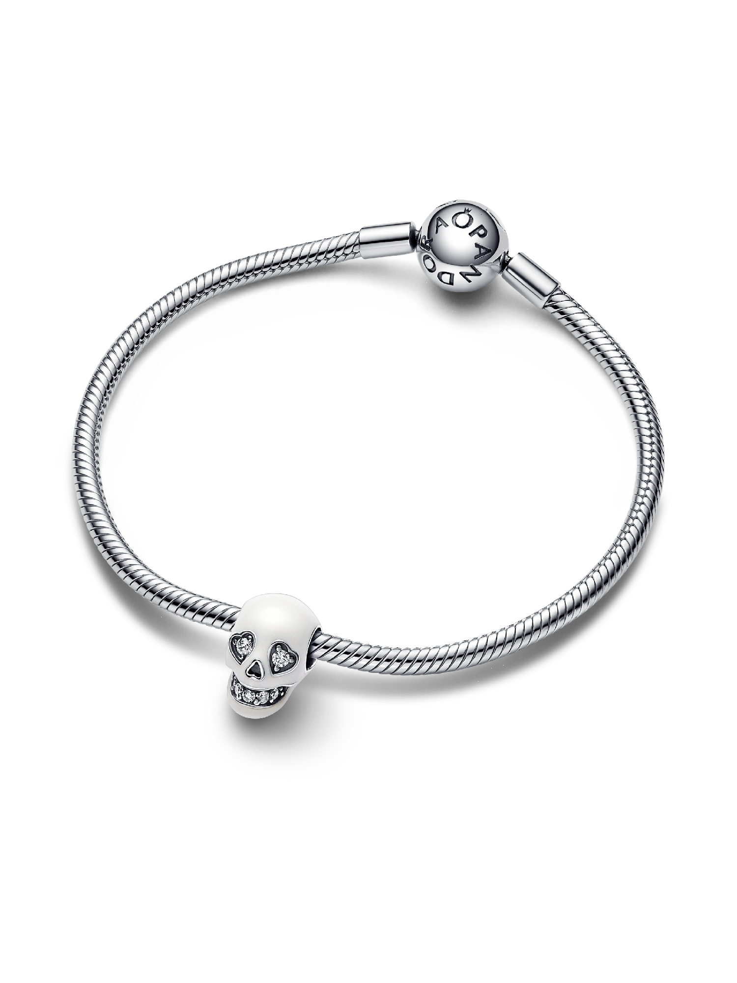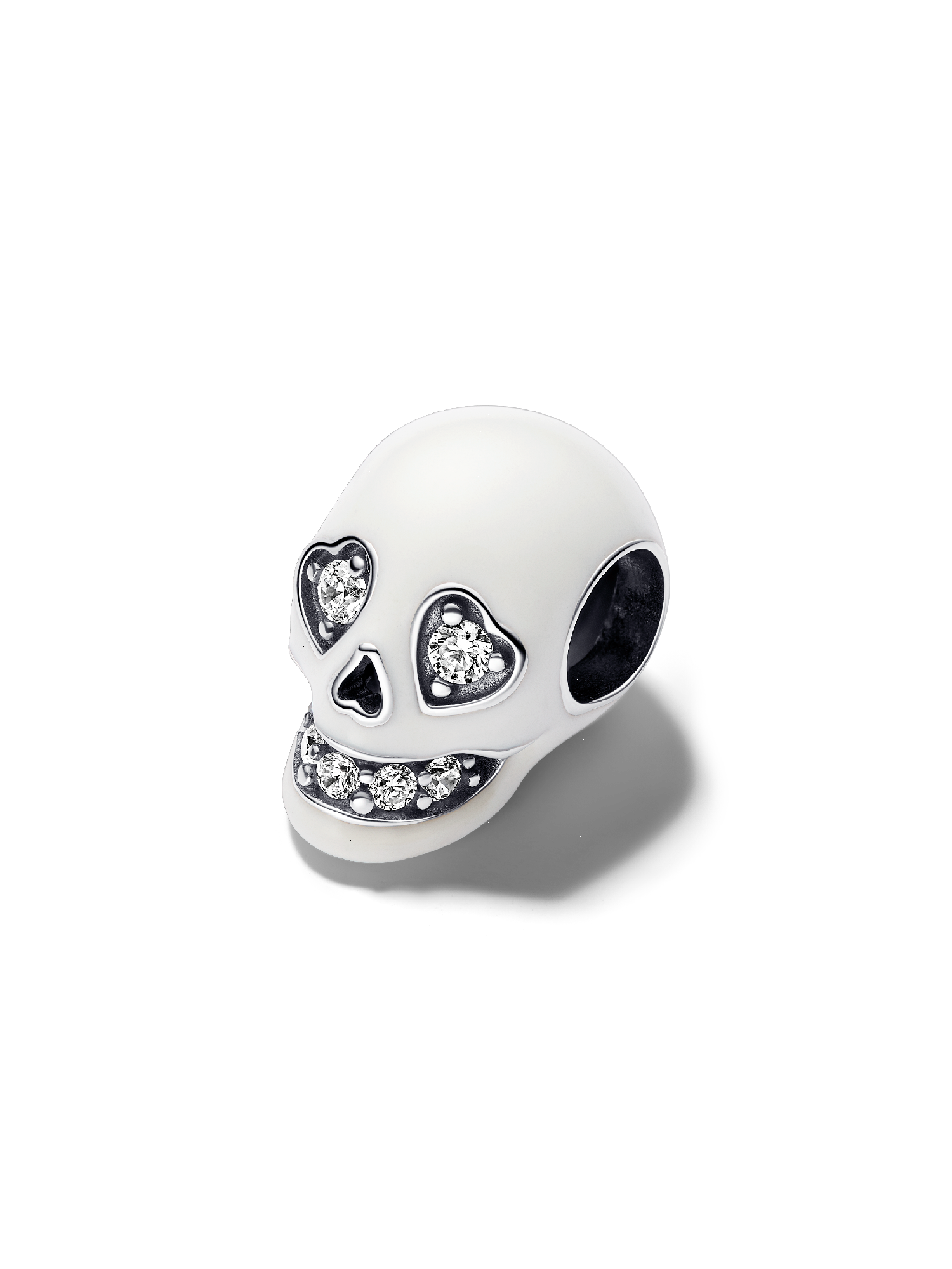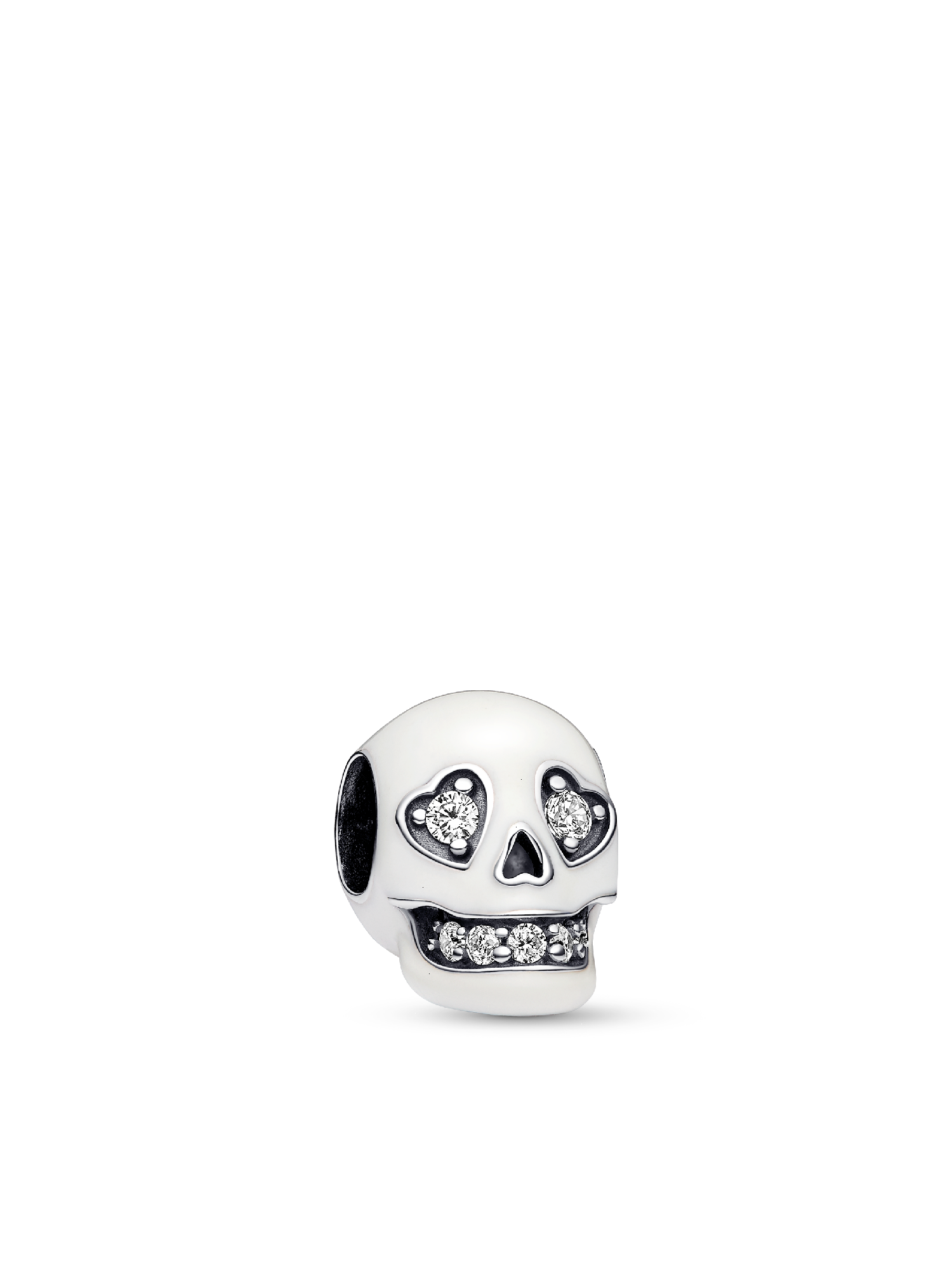 Add some edge to your look when you wear the Glow-in-the-dark Sparkling Skull Charm. This sterling silver charm features a skull covered in glow-in-the-dark enamel with a mouth and heart-shaped eyes sparkling with clear cubic zirconia stones. Cut-out details adorn the sides of the mouth, the nose and the bottom of the skull. Pay homage to the mystery of the afterlife and add an irreverent – not to mention glowing – touch to your style with this skull pendant.