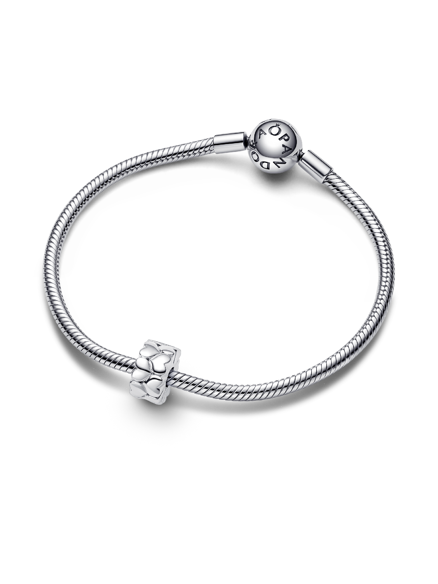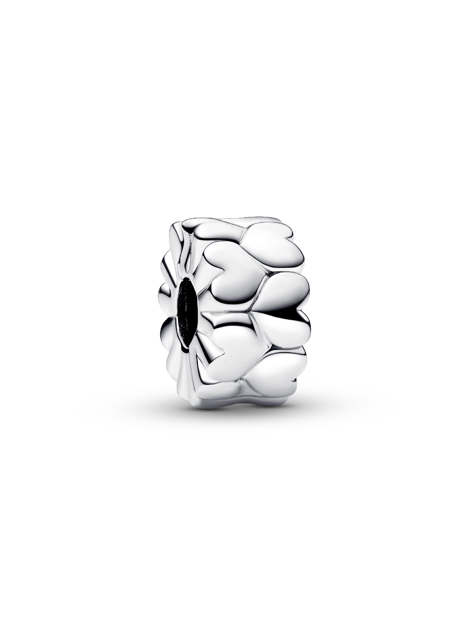 The Heart Pattern Clip Charm is a new addition to the Pandora Moments collection. This sterling silver charm features an endless pattern of alternating heart shapes that appear multi-dimensional. This clip-on heart charm has no silicone grip, so it will slide if not styled onto threads (two raised charm dividers). Give yourself – or someone special – a little love with a sterling silver clip charm as a reminder of your special bond.