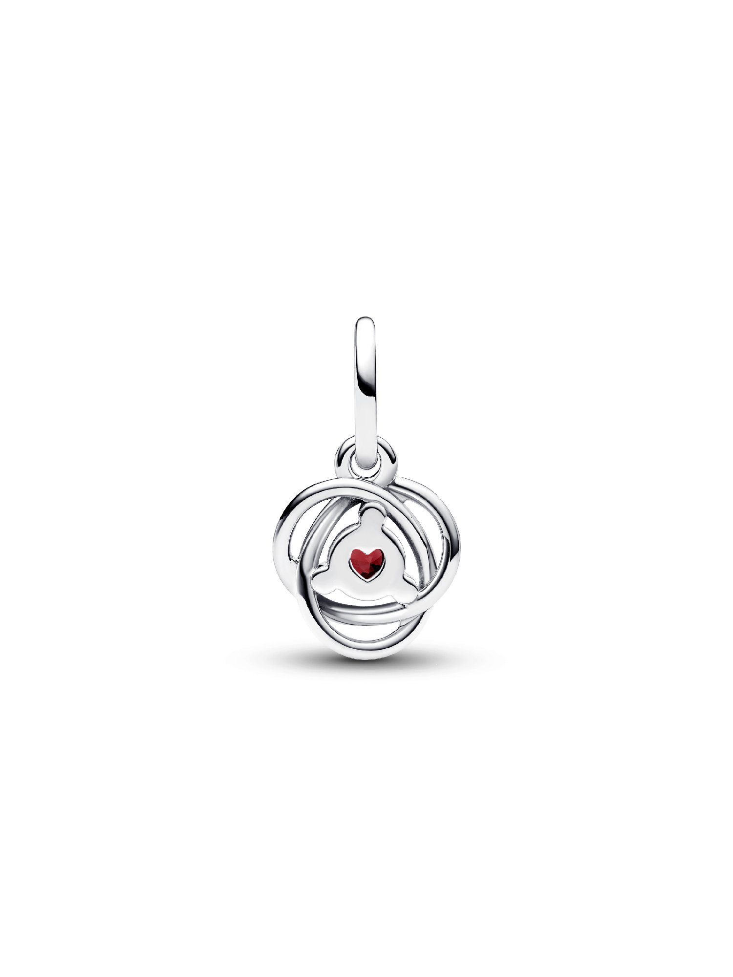 This intricate Red Eternity Circle Dangle Charm is a must-have infinity charm for your Pandora Moments collection. Crafted in lustrous sterling silver, it features an openwork infinity braid decorated with a central red man-made crystal, elegantly surrounded by three clear cubic zirconia. The intricate design symbolizes eternity and adds an additional layer of meaning to the piece. Elevate your bracelet with this essential piece or gift it as a representation of an everlasting bond.