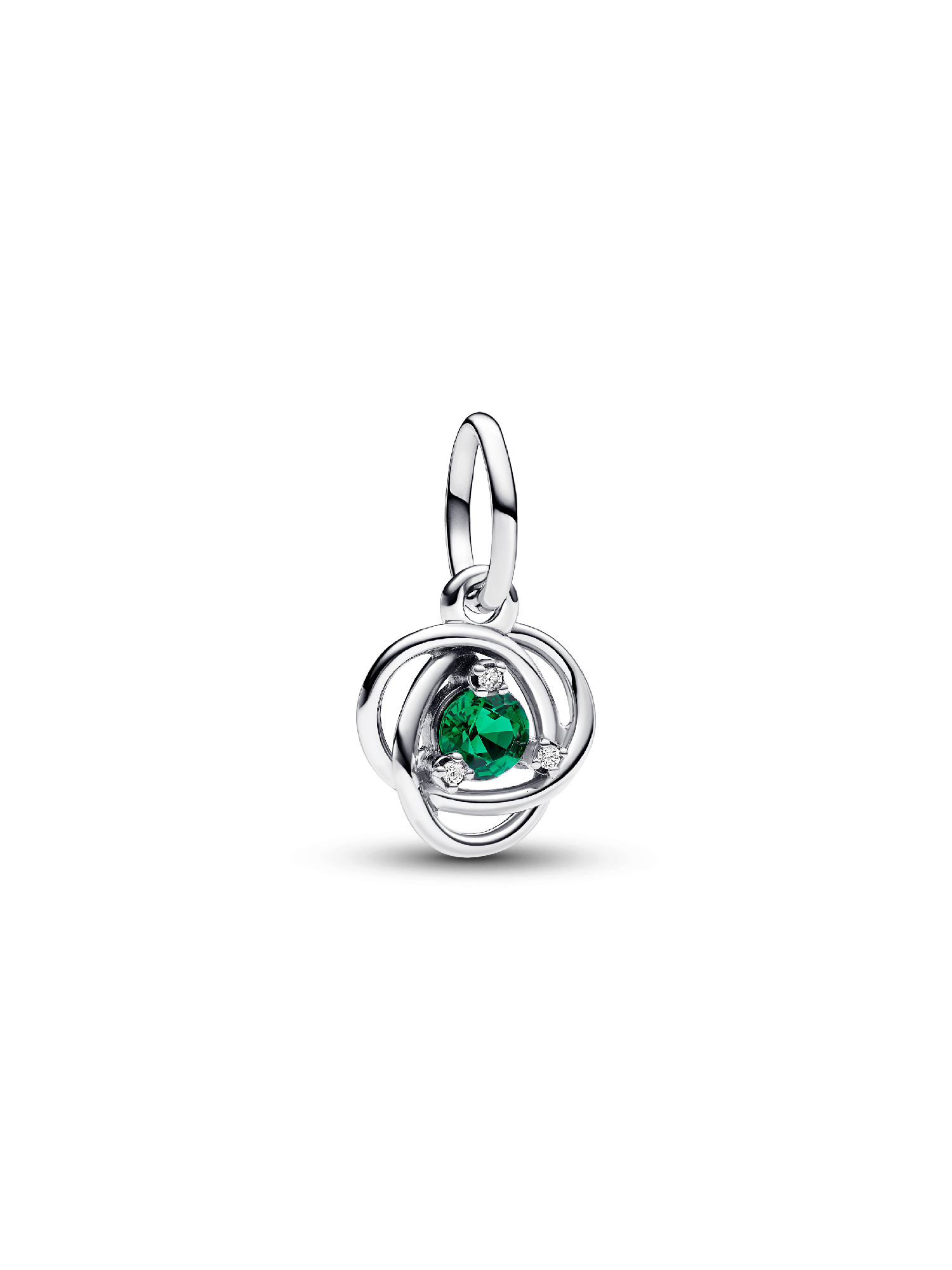 This intricate Green Eternity Circle Dangle Charm is a must-have infinity charm for your Pandora Moments collection. Crafted in lustrous sterling silver, it features an openwork infinity braid decorated with a central green manmade crystal, elegantly surrounded by three clear cubic zirconia. The intricate design symbolizes eternity and adds an additional layer of meaning to the piece. Elevate your bracelet with this timeless piece or gift it as a representation of an everlasting bond.